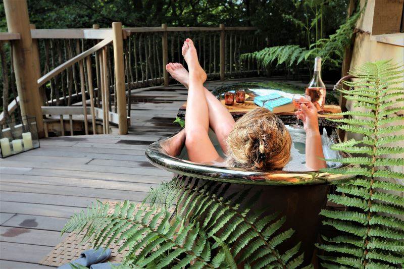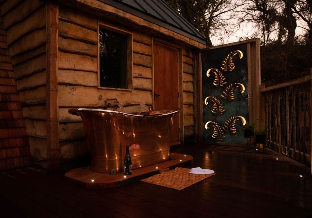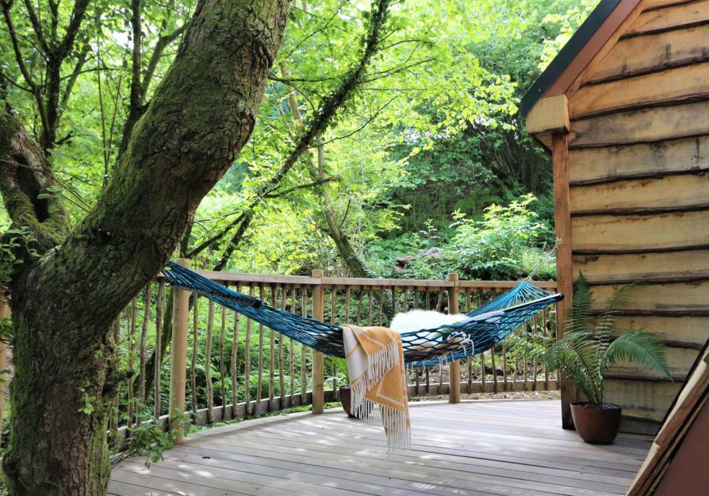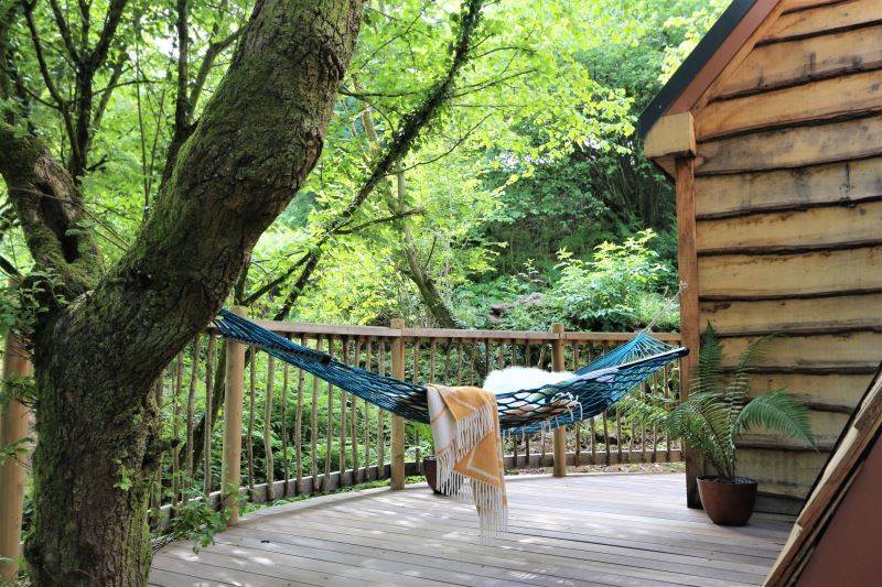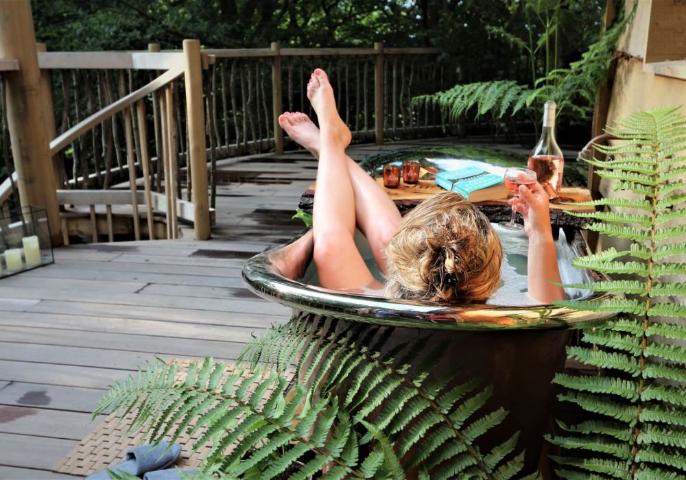 Large wraparound deck with outdoor bath and seating, sun loungers and hammock