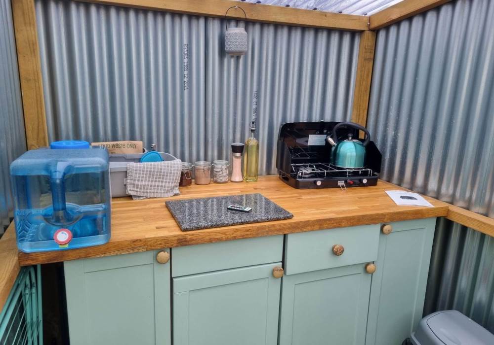 Rowan has its own cooking area which consists of a 'cwt cegin bach' (little kitchen hut) which accommodates your gas cooking stove, cool box for storing your chilled items and your cooking utensils, pots, pans, crockery, cutlery, glassware and that very important cork screw. All kitchen items are disinfected after each visit.