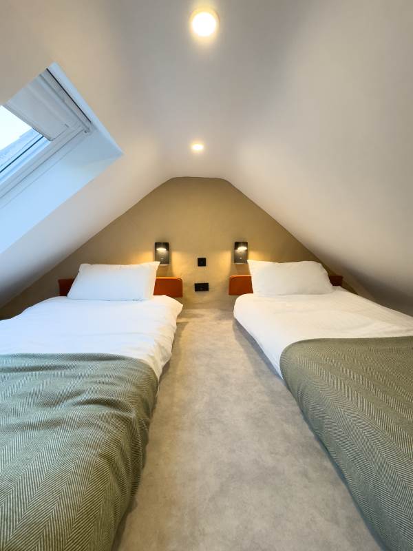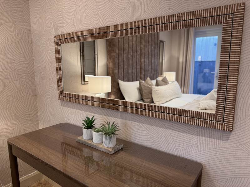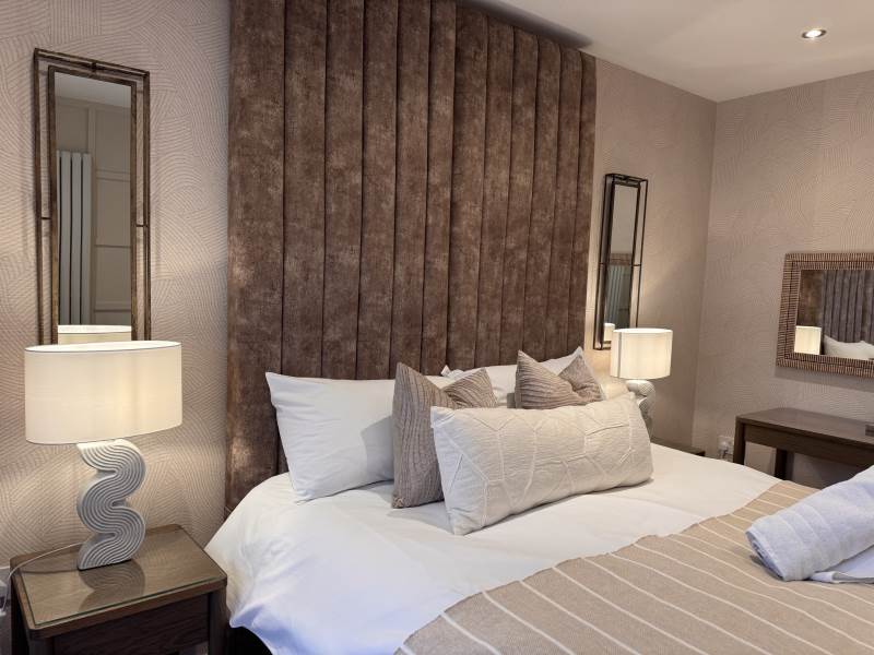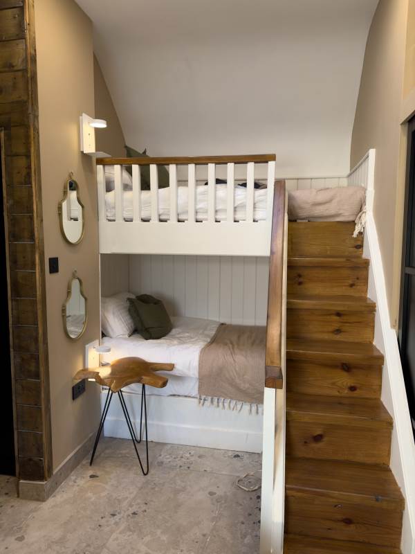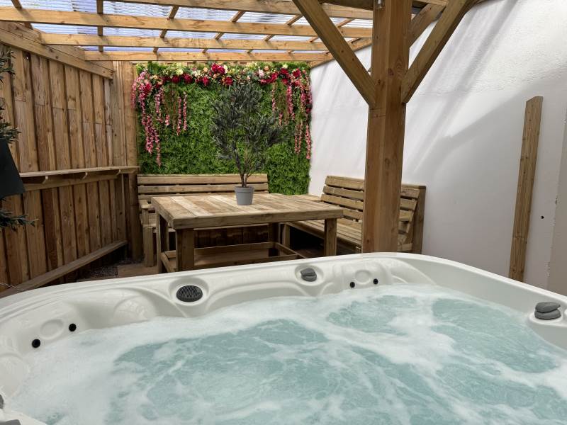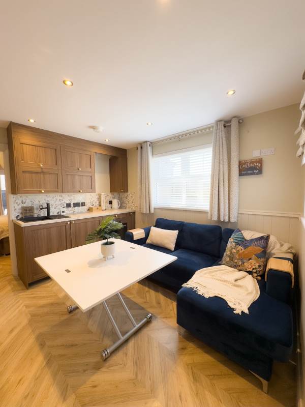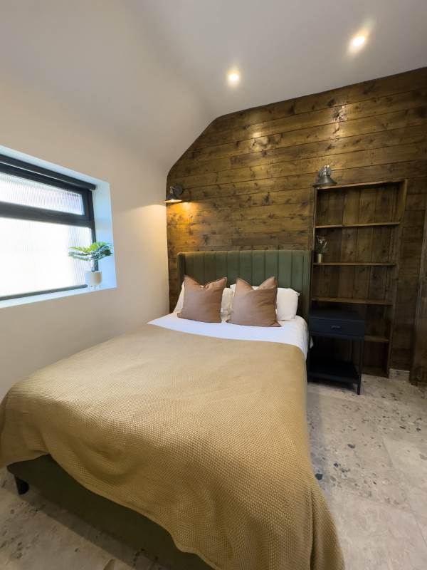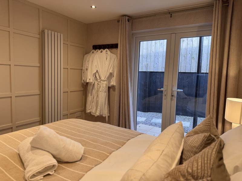 Our lodges have a king-size bed with a private hot tub, sunken into balcony.