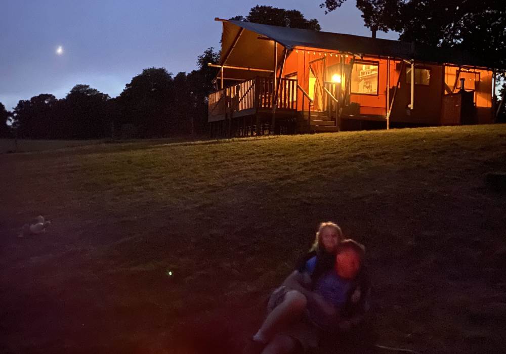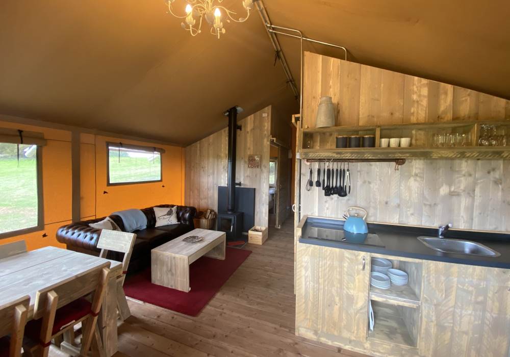 This is a family-friendly and dog-friendly safari tent sleeping up to 5. There are 2 bedrooms, each having a king-sized bed, one is a four-poster while the other has a single bunk bed overhead. A travel cot can be provided for babies/toddlers. Therefore the unit can sleep 5 adults/children with the option of a baby/toddler in addition. Dogs are permitted on site but there is only room for one dog. If a travel cot is required, or you wish to bring a dog, this must be specified in your booking - additional fees apply. A dog bed and food/water bowls are provided but your dog may be happier if you bring a blanket as it can get a little chilly in the tent for dogs used to sleeping indoors!