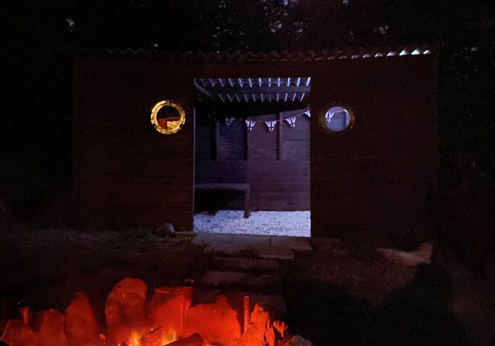 Kitchen/cooking facilities: 4-ring induction hob, kettle, toaster, microwave, fridge (with freezer compartment), pans, utensils, teapot, cafetière, crockery, cutlery, mugs and glasses. There is also a campfire with grill and tripod/firebowl for outside cooking.