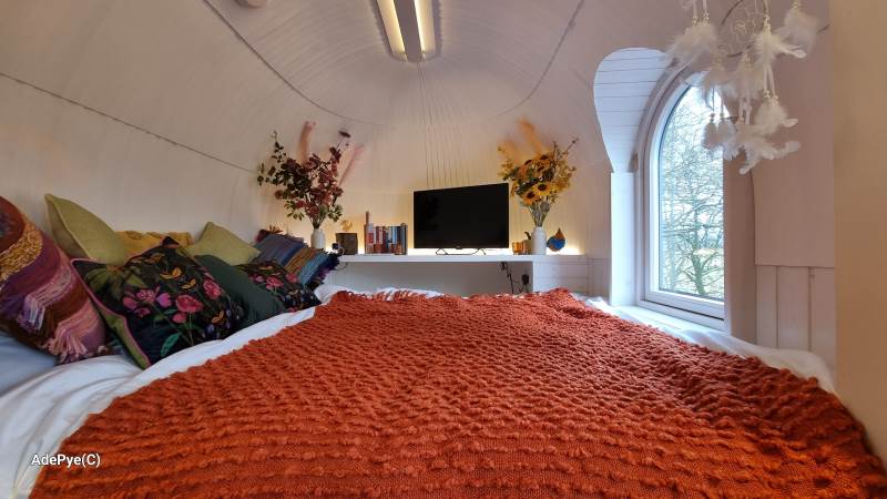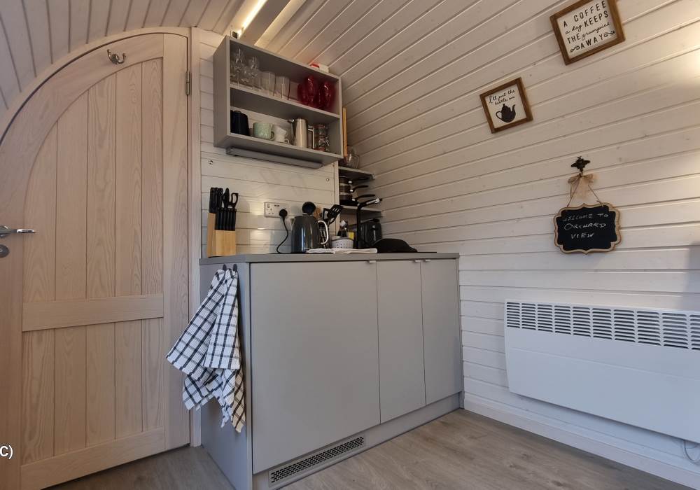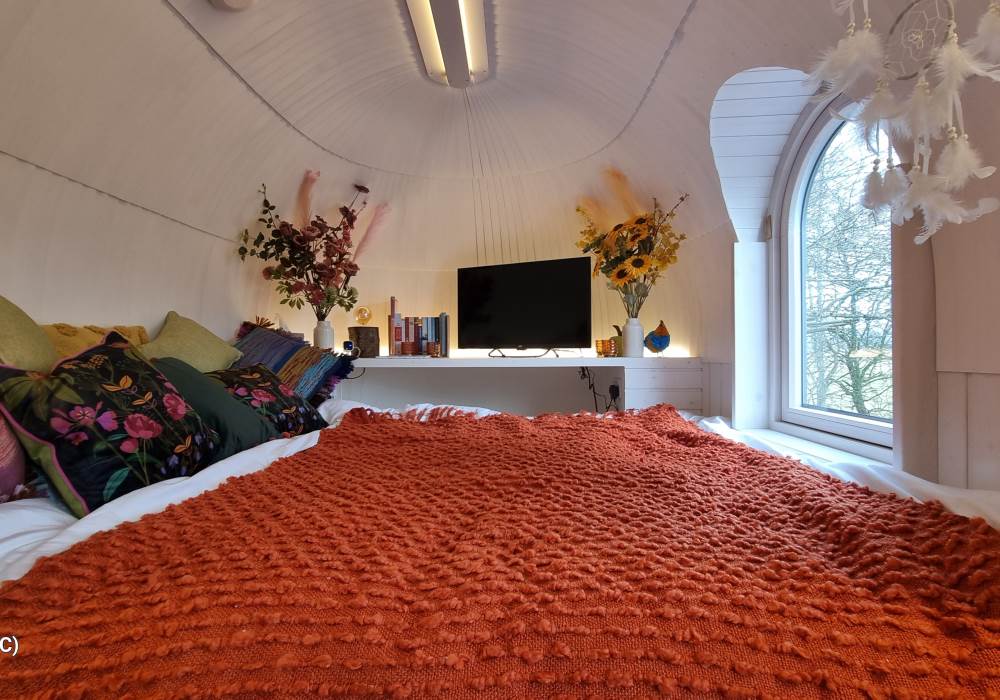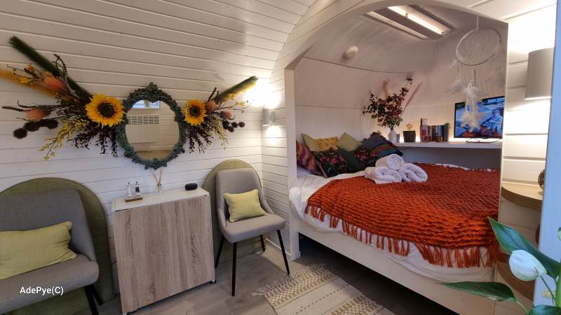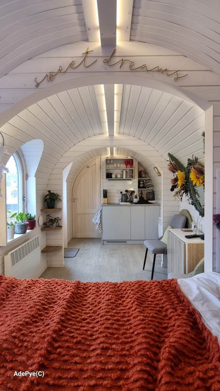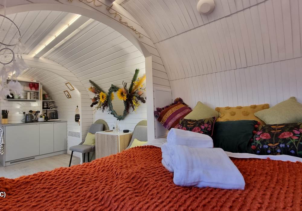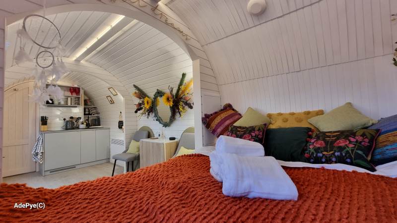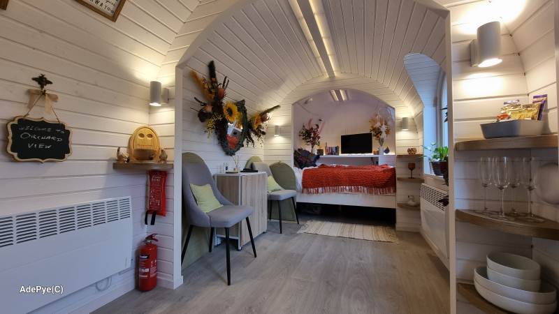 Orchard View – 'the iglu in the orchard'. Set in its own ¼ acre private orchard, with King size bed providing luxurious accommodation for a maximum of 2 adults. Sorry but no pets. The cabin is fully insulated and heated, keeping you warm in the cooler evenings or winter months.