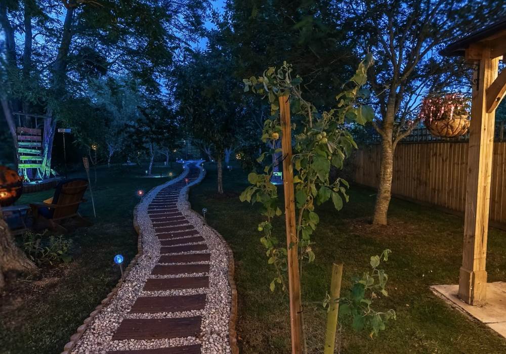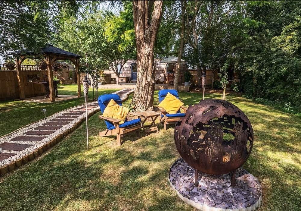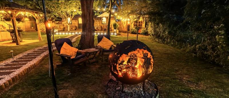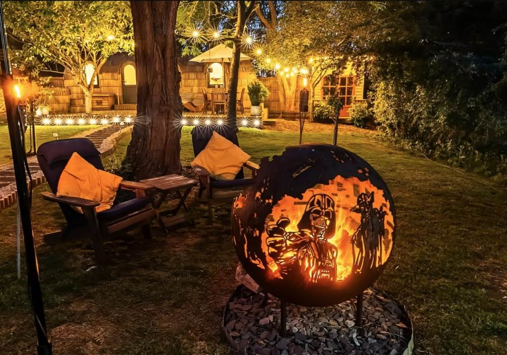 Outside guests may enjoy relaxing on the spacious deck, in the private orchard or by the pond. In the evening perhaps try toasting marshmallows (also provided) whilst sitting around our Star Wars ‘Death Star’ fire pit, maybe enjoy an outdoor cinema experience. You may catch sight of some of the varied nocturnal wildlife including, badgers, bats, owls, hedgehogs and foxes to name but a few and if you’re very lucky – maybe a deer.