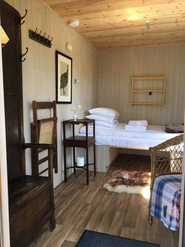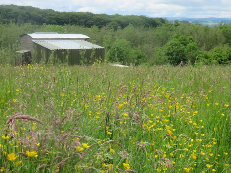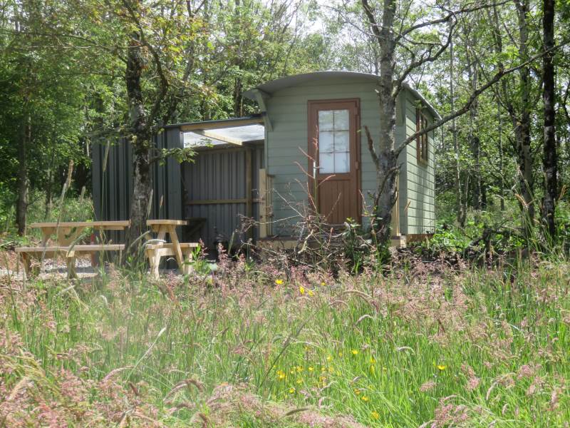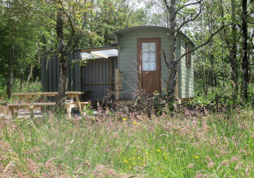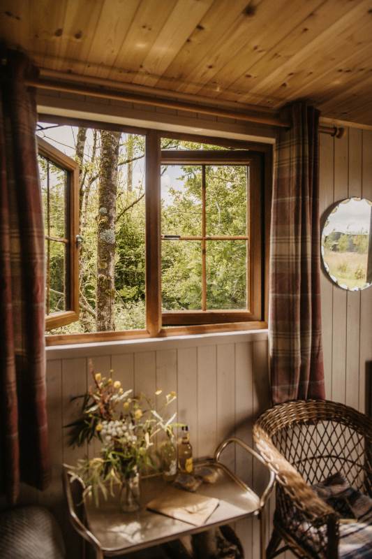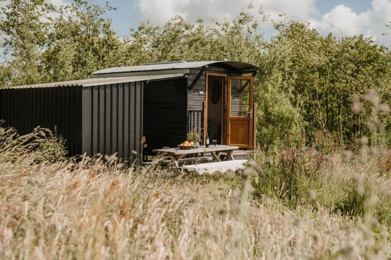 Situated in our wild flower meadow overlooking the rewilding area, our customised shepherd huts provide a beautiful and cosy base for your stay with us. Each shepherd hut contains a double bed (bedding provided) that doubles up as a seating area with a table.