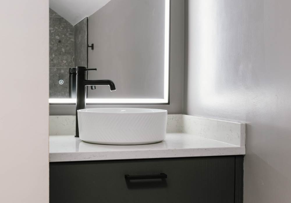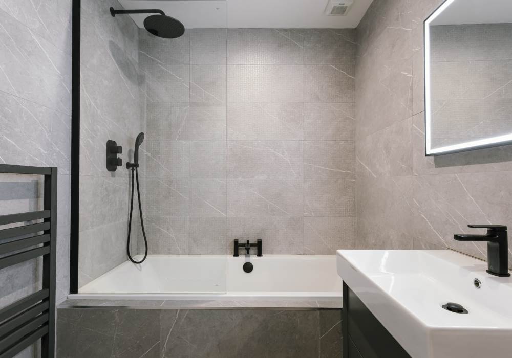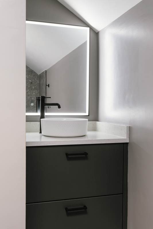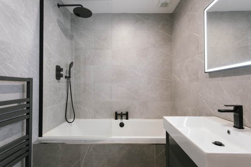 -Large modern bathroom downstairs with a bath, shower toilet and sink