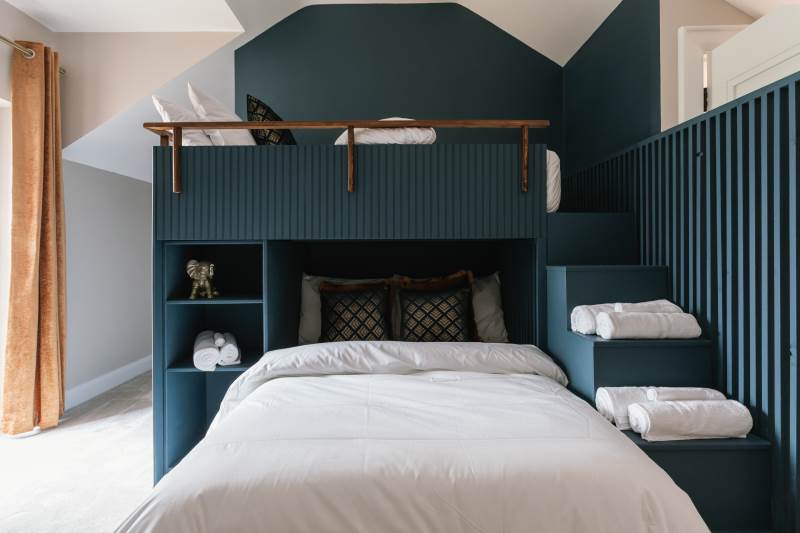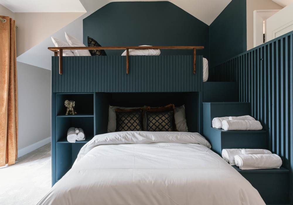 -Spacious second bedroom with bespoke luxury bunk beds, a single on the top and a double on the bottom