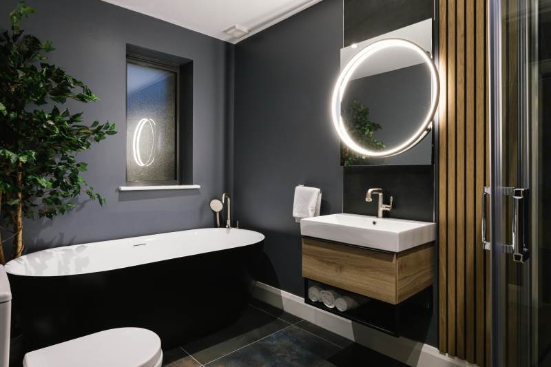 -Large modern shared bathroom with a bath, shower, toilet and sink