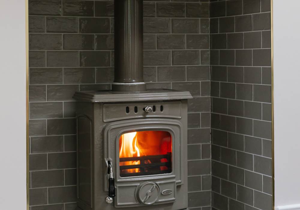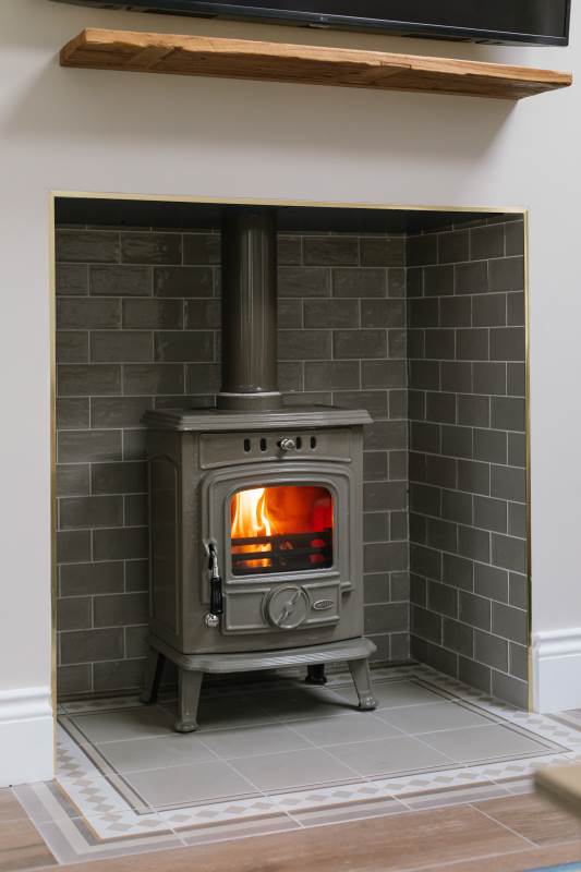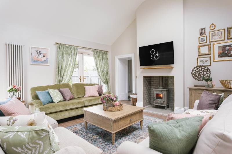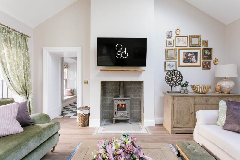 -Large living room with high ceilings and a wood-burning stove with a 50” smart TV