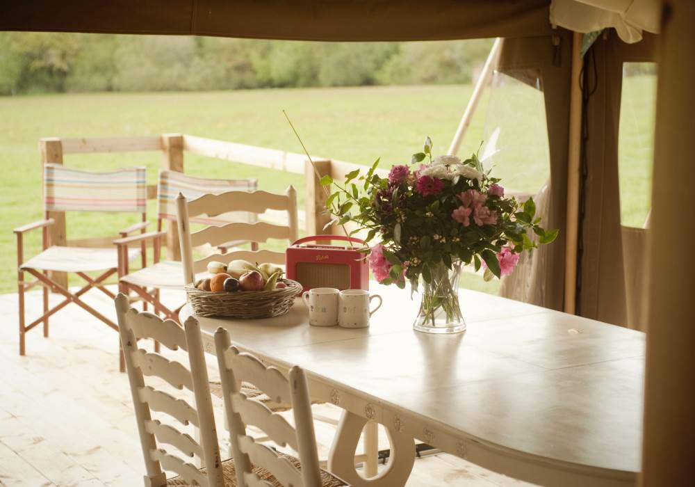 There is a double bedroom, a twin bedroom and a double sofa bed in the main living area. Everything is fully equipped and beautifully designed. You will also find a large living area with sofa, chairs, dining table and woodburning stove, as well as books and board games. You can borrow travel cots, toy boxes and high chairs free of charge. The kitchen is fully equipped with sink and four ring gas stove, plus a woodburning stove keeps the safari tent cosy in the evenings. Primrose has its own shower and loo, barbecue and campfire. There is a large covered verandah with table and chairs, facing south-west into wonderful sunsets and also a campfire for toasting marshmallows.