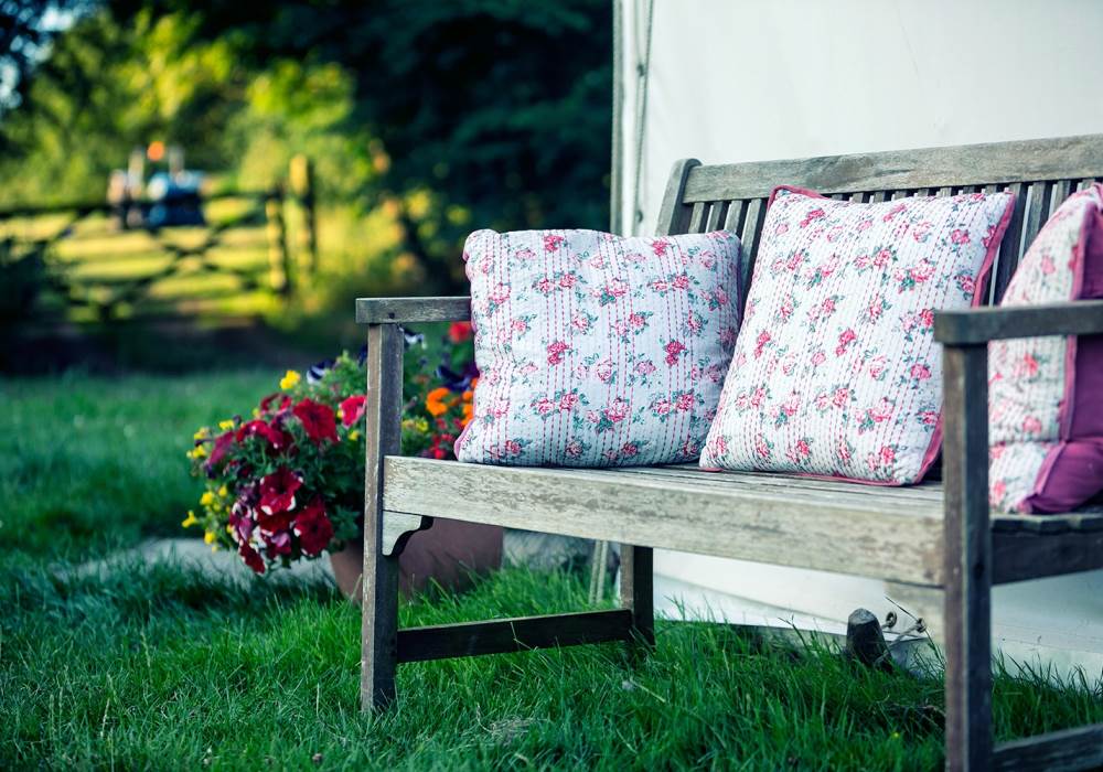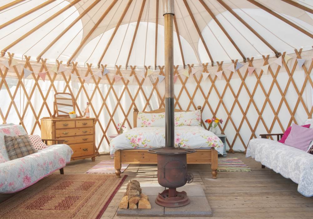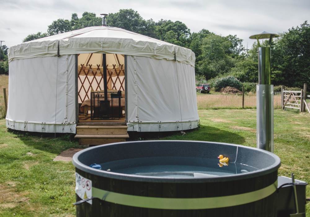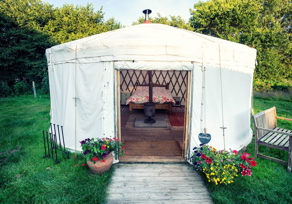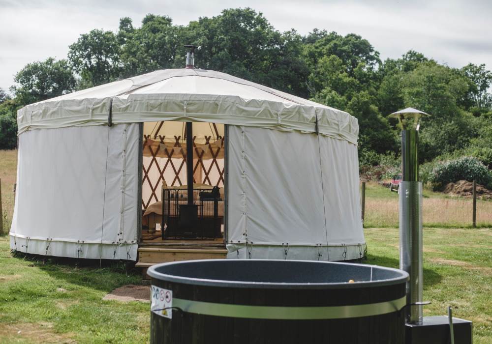 Beautiful Sweet Pea Yurt is one of our more secluded options, tucked away behind tall trees in a sunny meadow all of its own. Sweet Pea sleeps up to four with a double bed and two sofa beds. You will find rugs, cushions and a cute little woodburner stove to keep the yurt cosy and warm. Next to Sweet Pea is its own wood-fired hot tub, perfect for relaxing under the stars in the evenings or just enjoying watching the swallows fly overhead in summertime.