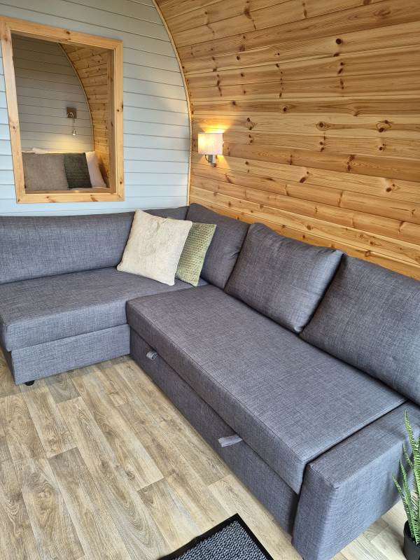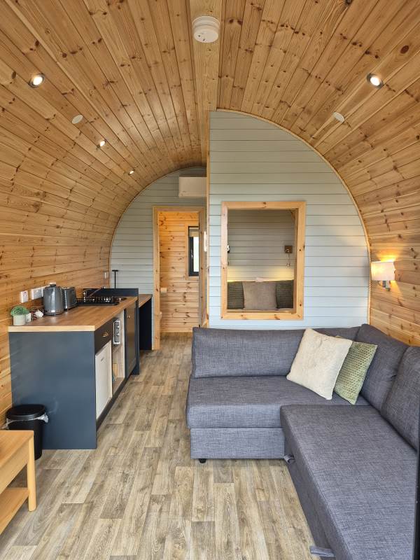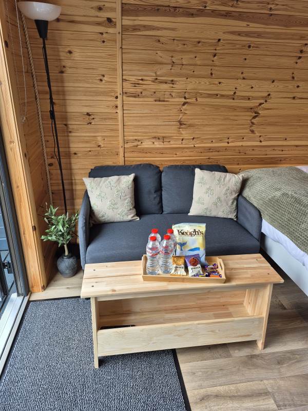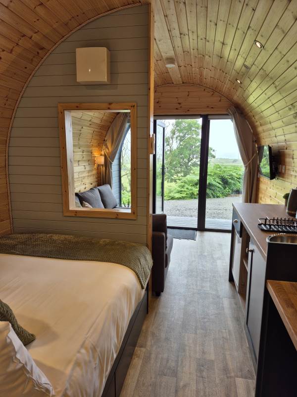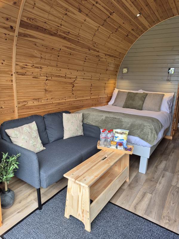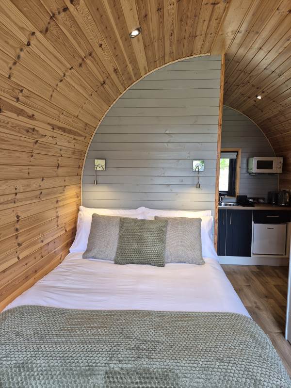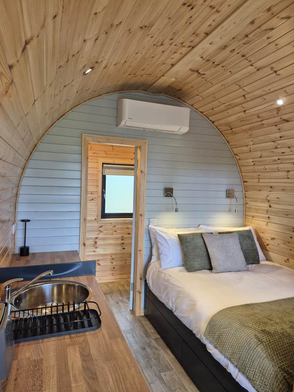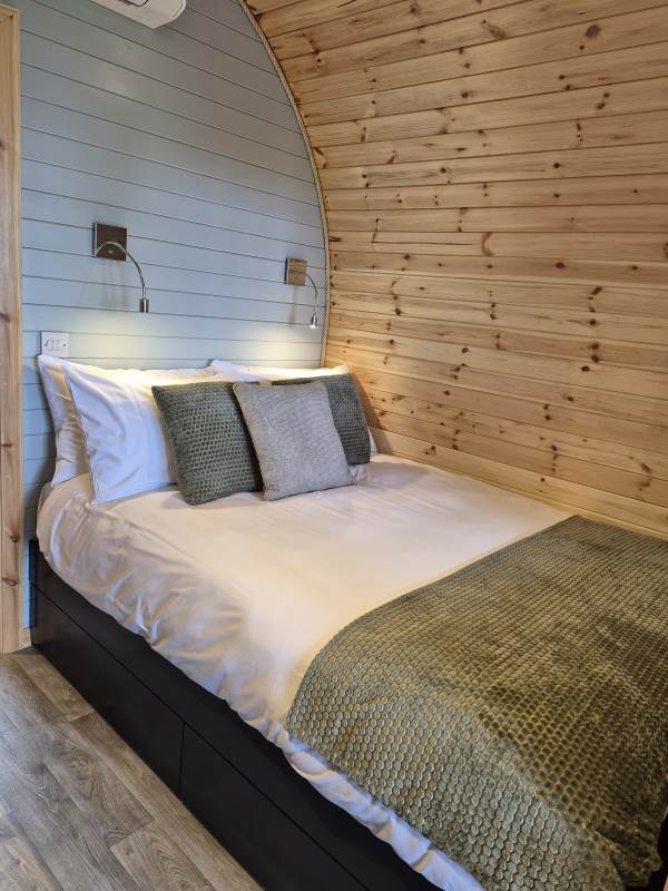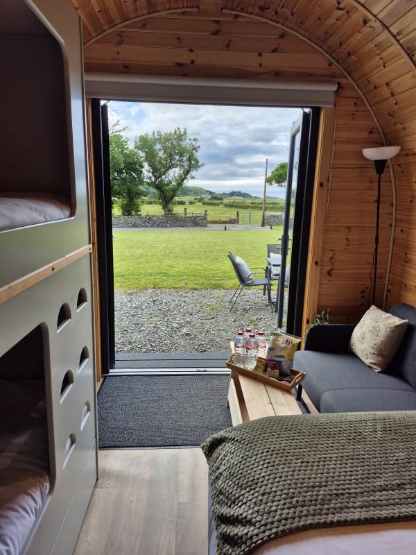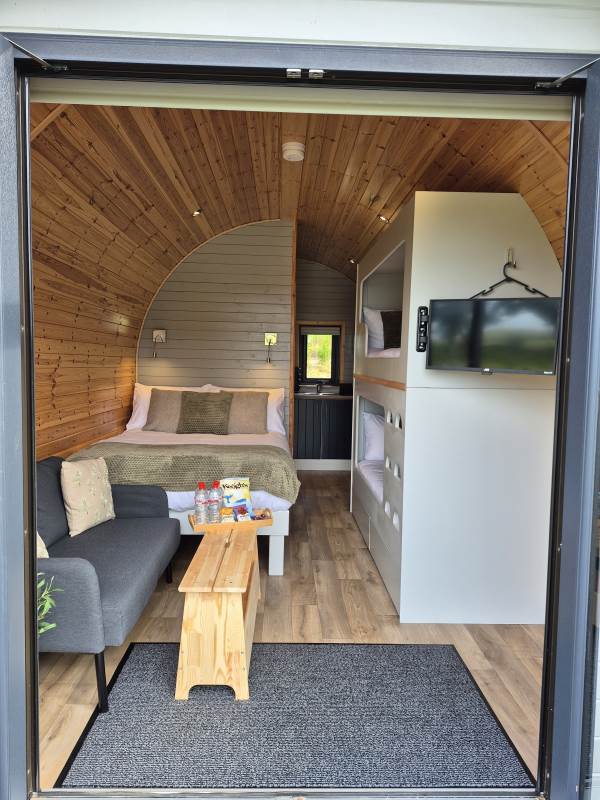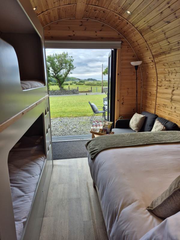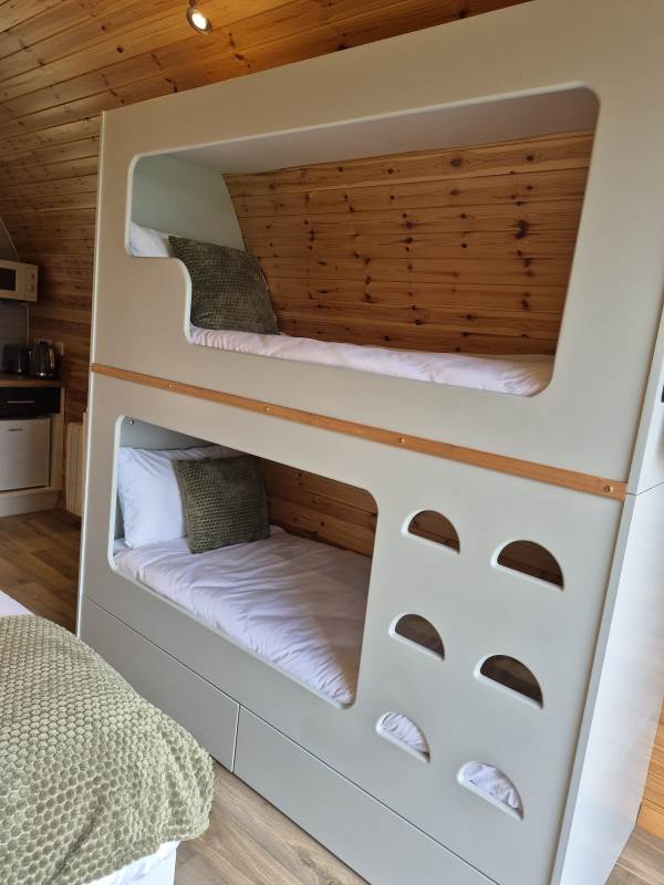 Glamping Pod with one double bed & two bunk beds.