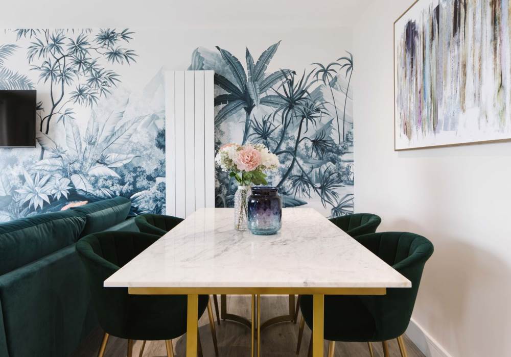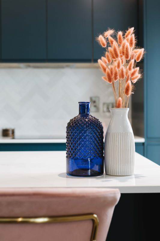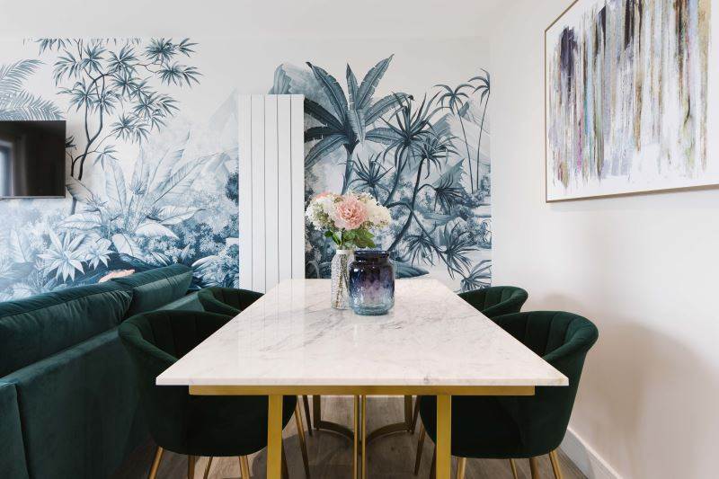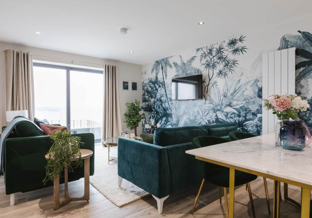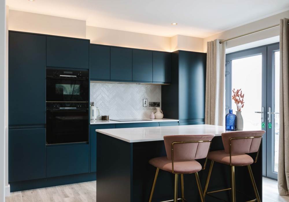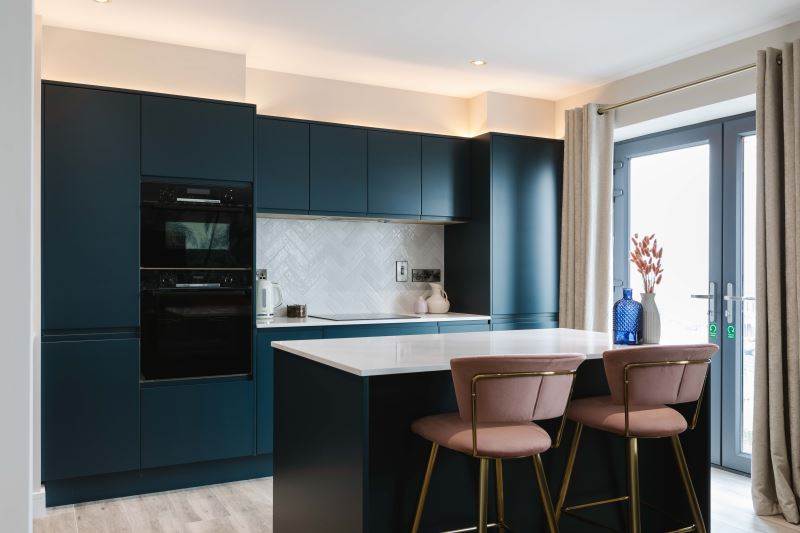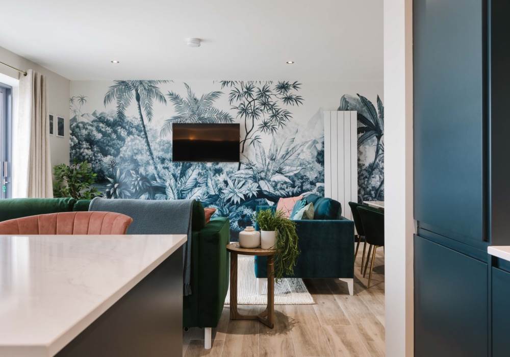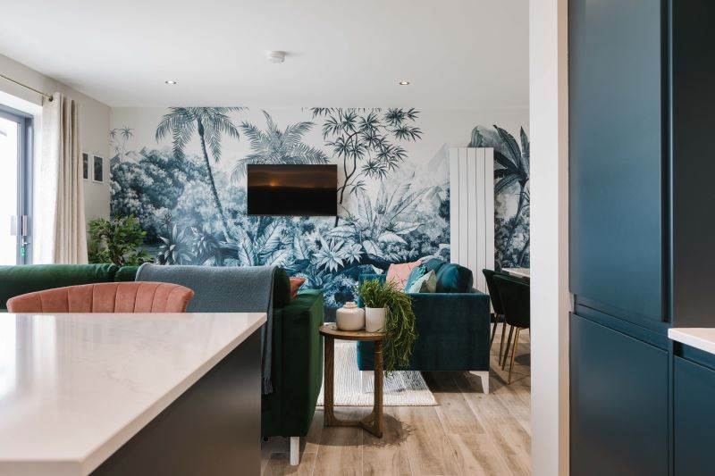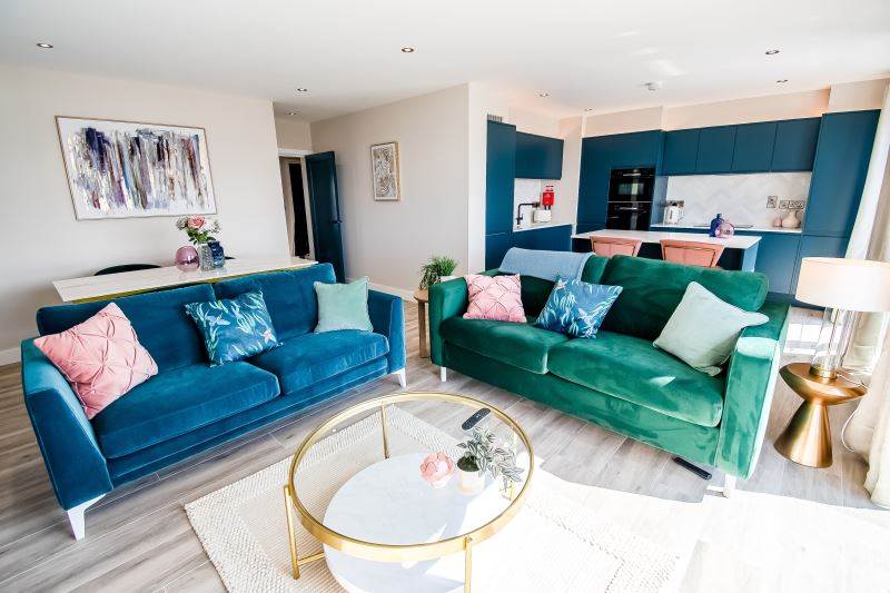 Luxurious open plan, well-equipped kitchen, breakfast bar, living and dining area.