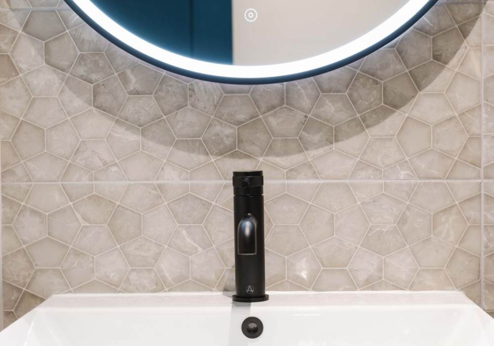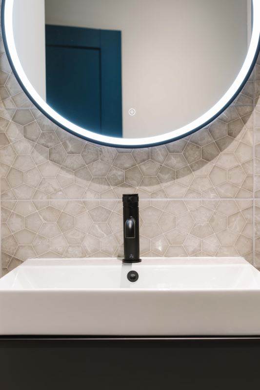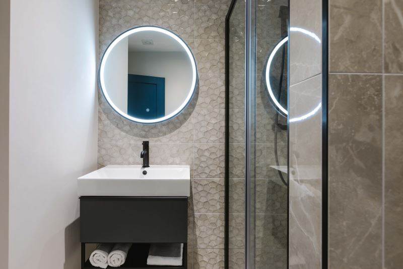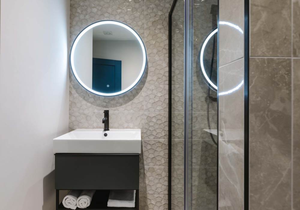 Modern bathroom with a shower, toilet, sink , hand soap..