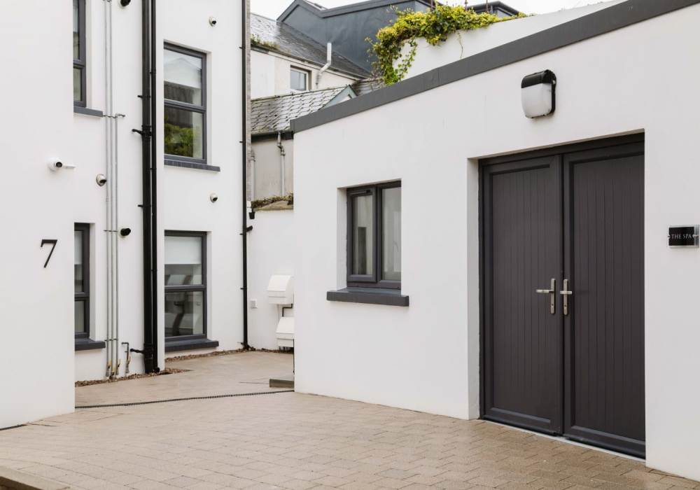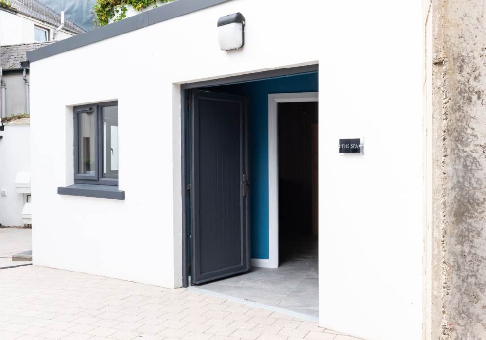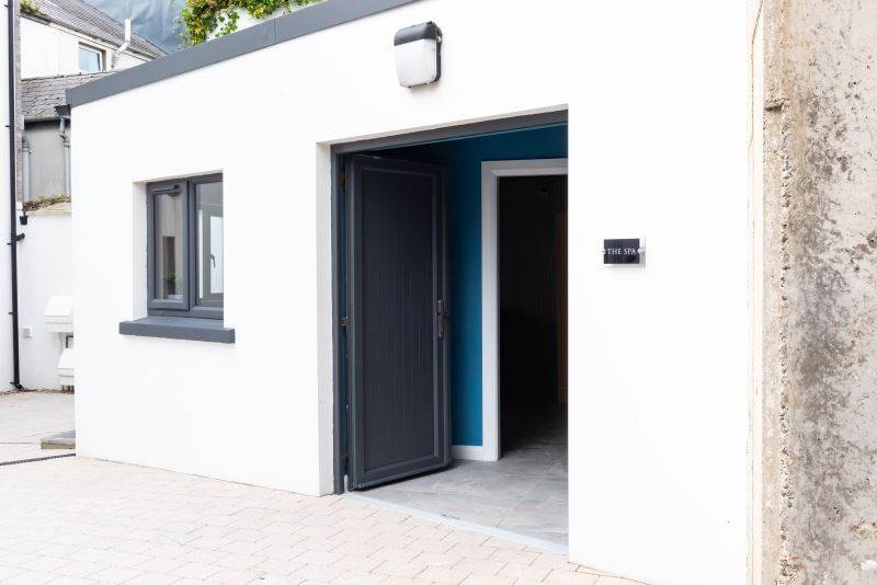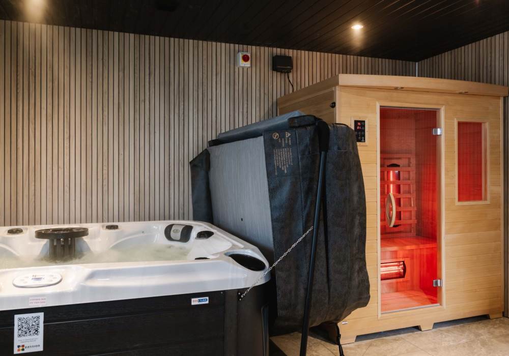 Communal indoor entertainment area with 6 seater hot tub, two person sauna & ice bath.
