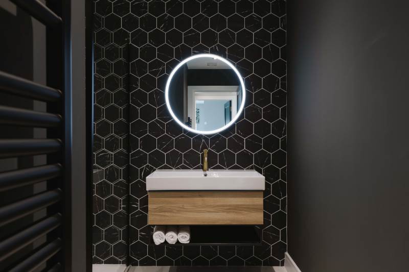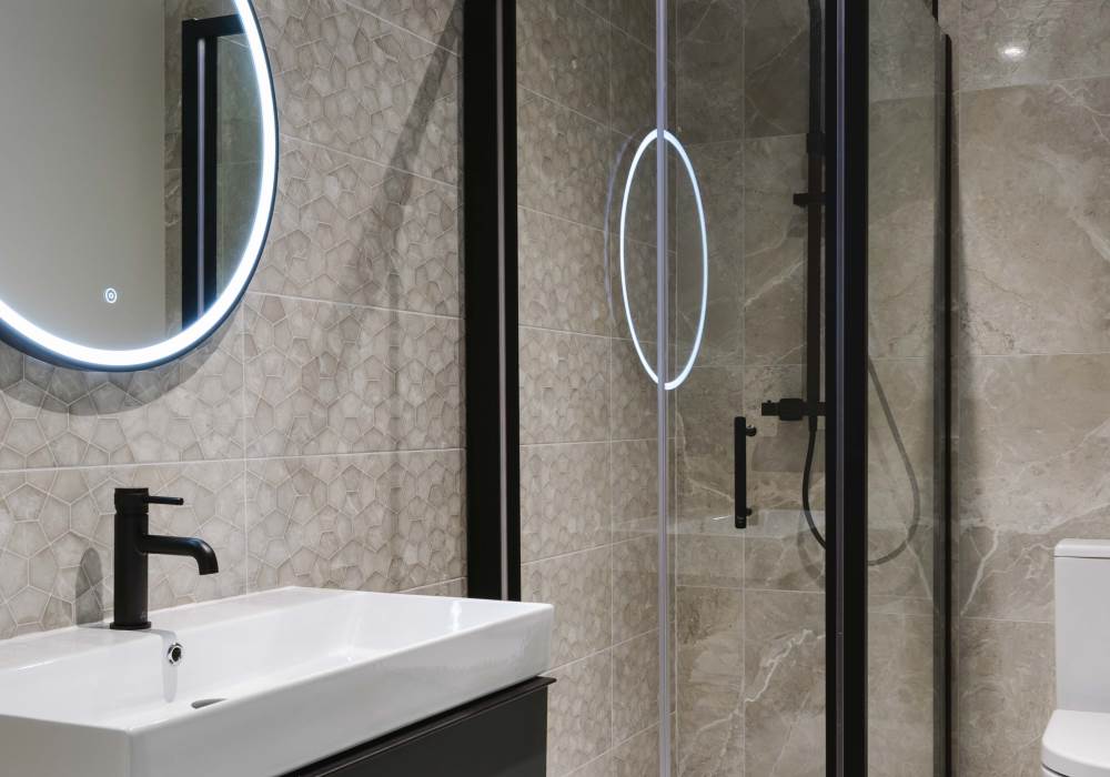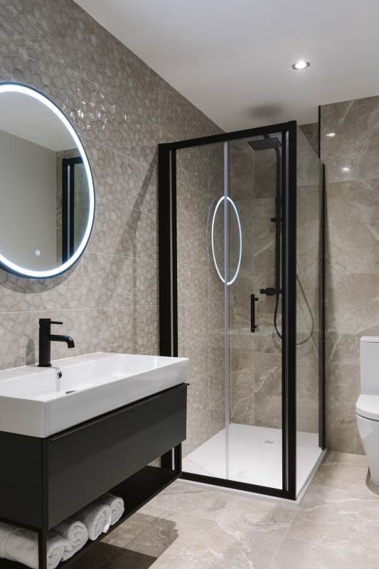 Modern bathroom with a shower, toilet, sink , hand soap..