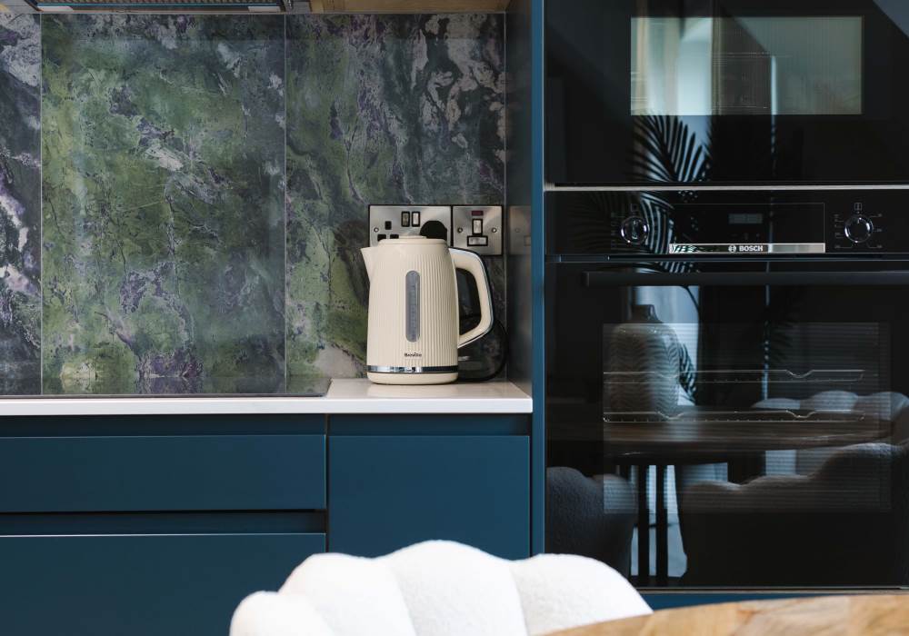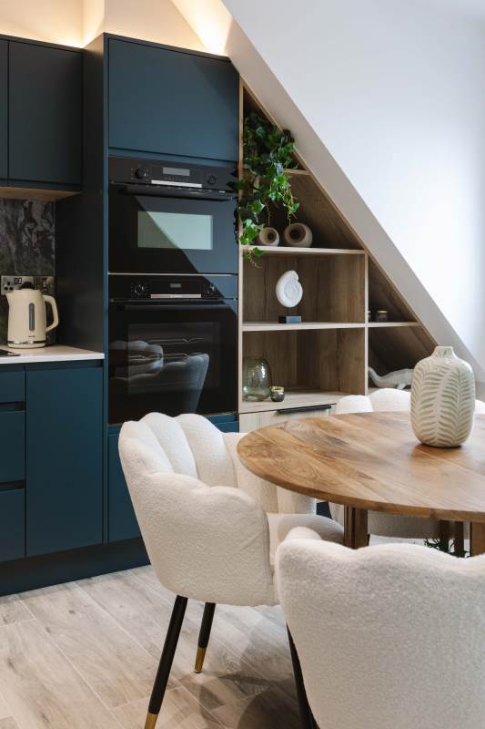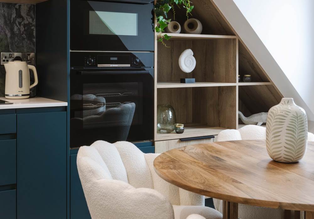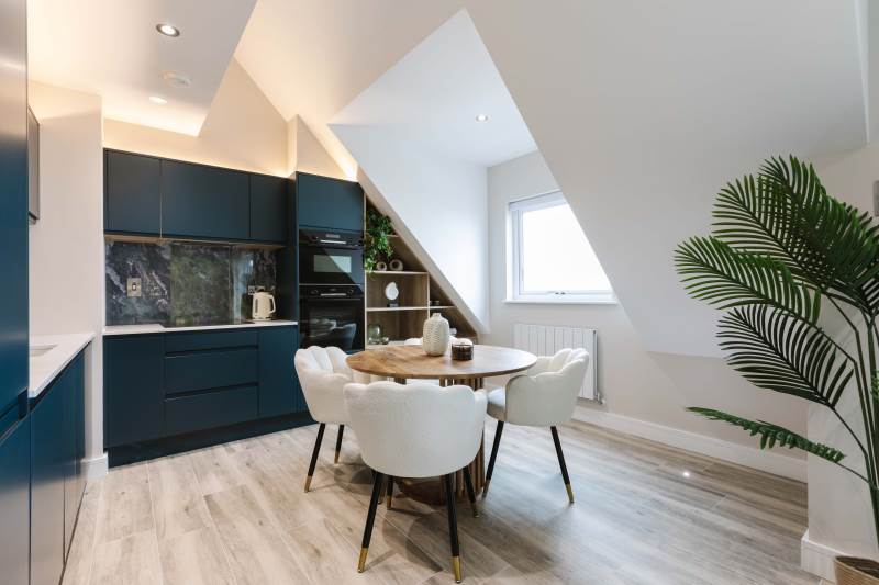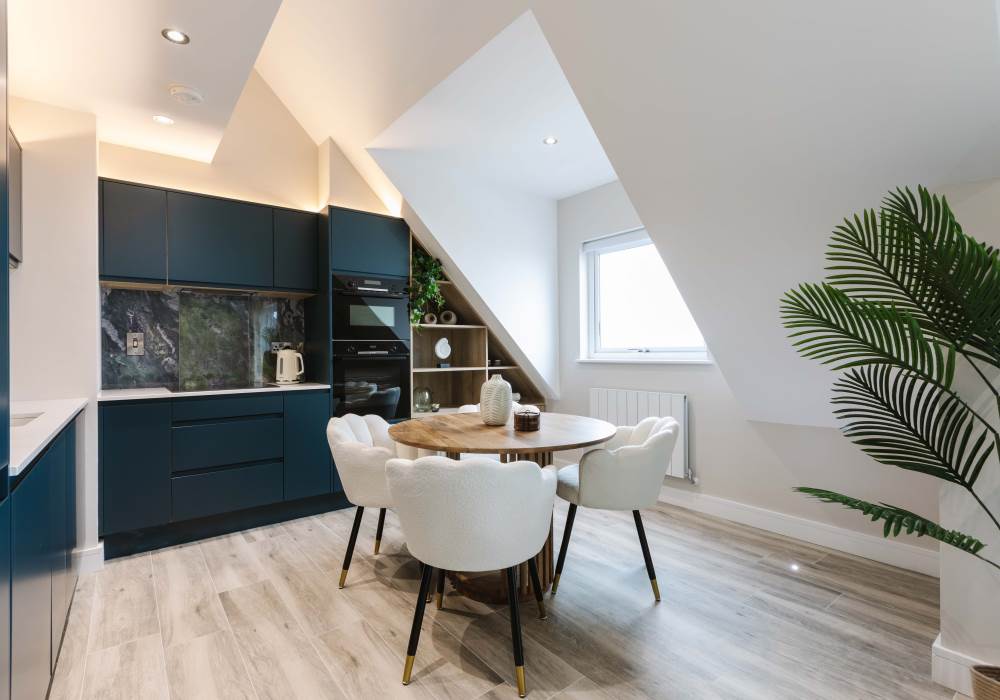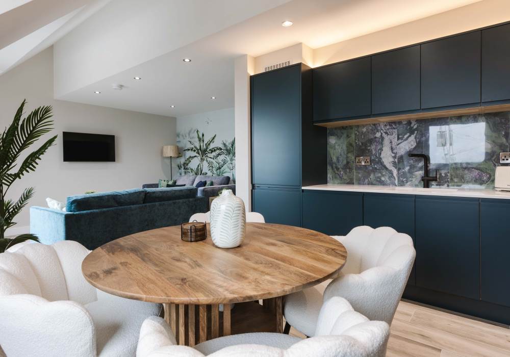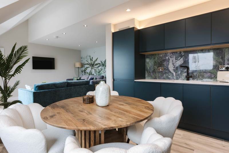 Luxurious open plan, well-equipped kitchen, living and dining area.