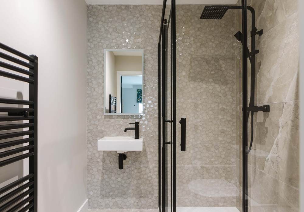 Modern bathroom with a shower, toilet, sink , handsoap..
