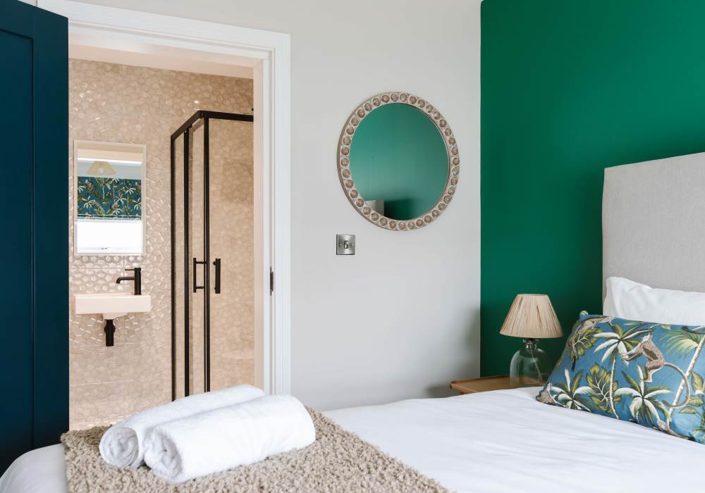 Luxury master bedroom with en-suite, complementary bathrobes, slippers.