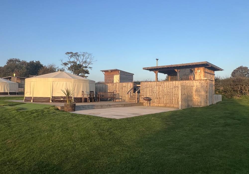 These cosy Yurts are each furnished to a superior standard with a superking-size bed, bunks, double sofa bed and their very own heated bathroom behind the yurt. A heater keeps the Yurt toasty on chilly nights. They each have mains electricity and drainage with hot and cold water. The kitchen has a combined grill/oven/pizza-maker/air-fryer and also a microwave and full-sized fridge with icebox. There is plenty of outdoor seating and tables and the whole accommodation is set on two levels to best enjoy the extensive views. Dog beds and bowls are provided.