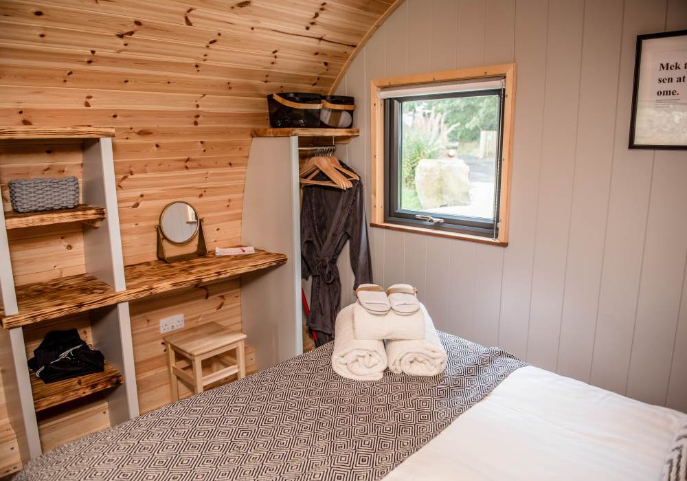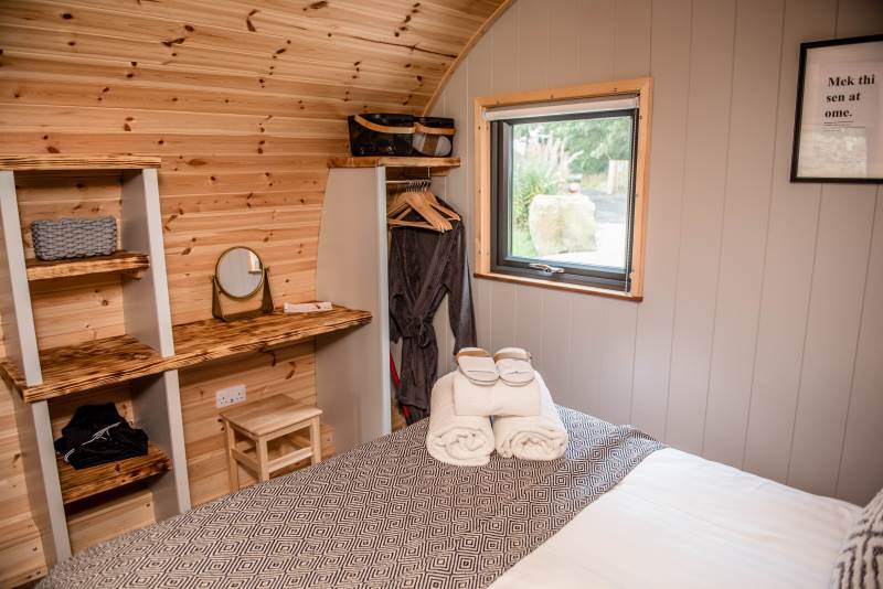 Including a king-sized bed in a separate bedroom area with its own dressing table, wardrobe, and shelves for extra storage space