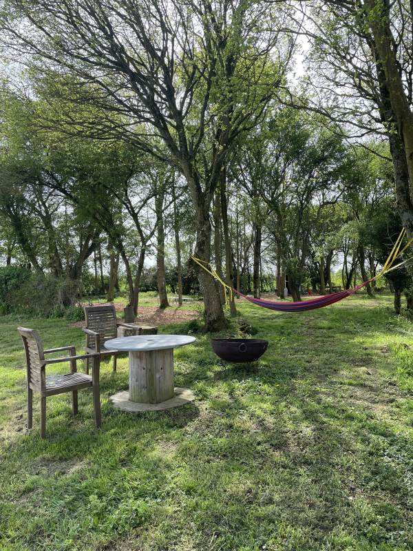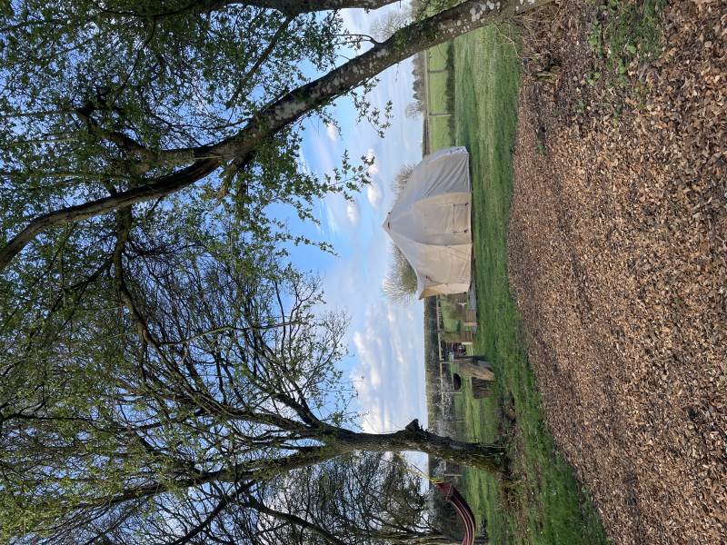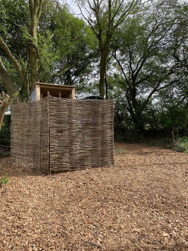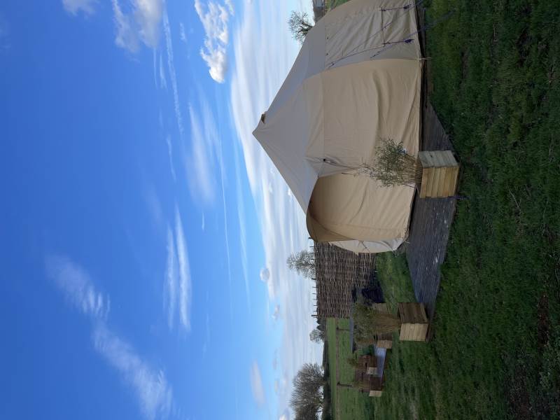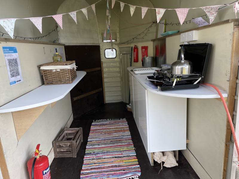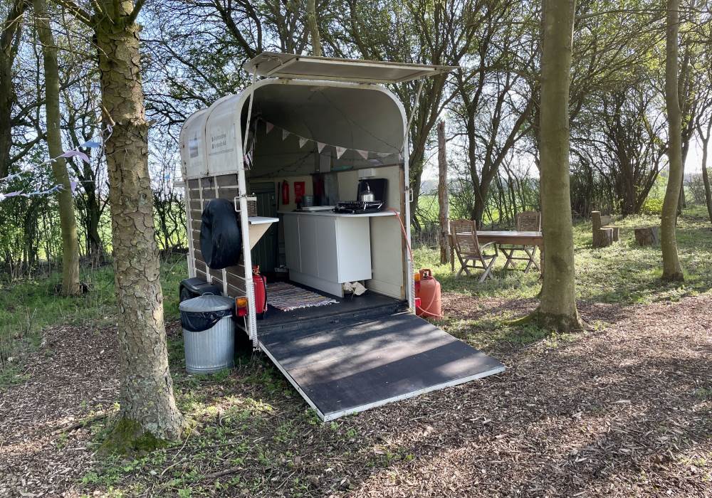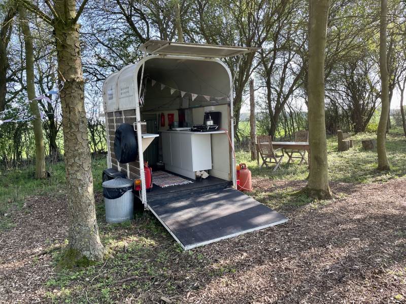 The Kitchen - a converted horse trailer that has all utensils, prep area, water and a gas ring hob, is shared with the other tent but you have your own cool box with ice blocks to use as a fridge. The outdoor shower - has hot water run by a generator and a basin - both kitchen and shower are shared with the other tent. You have your own compostable loo.