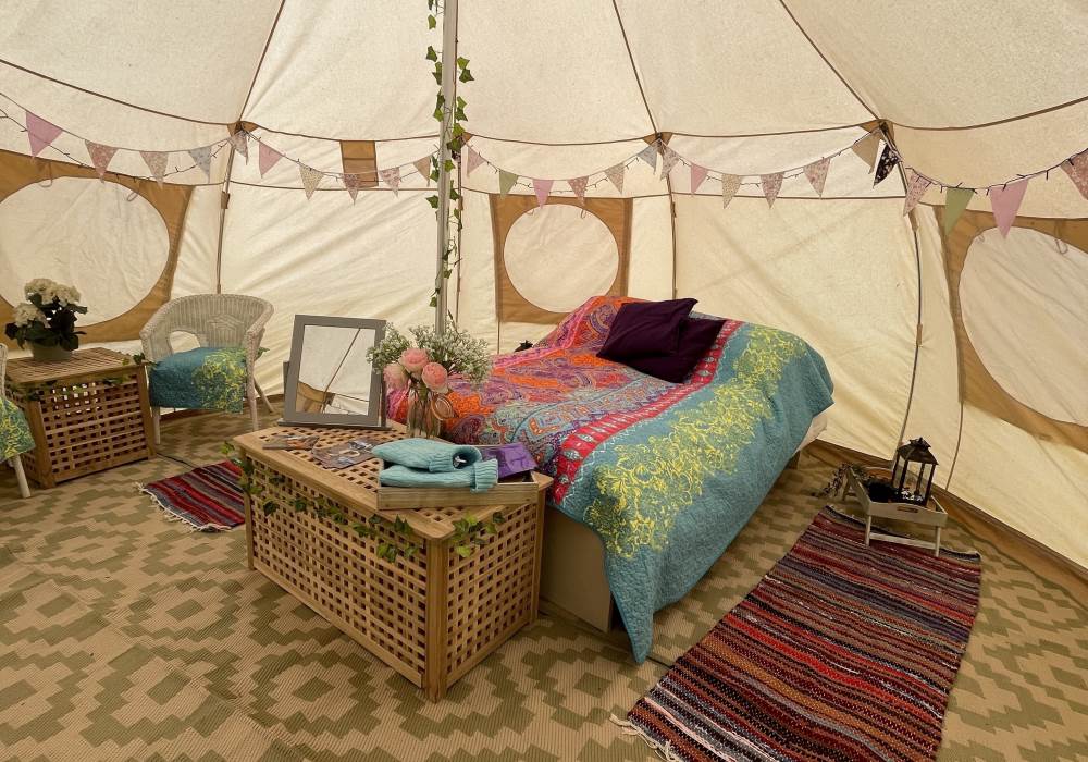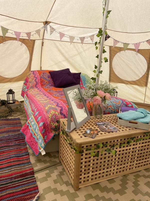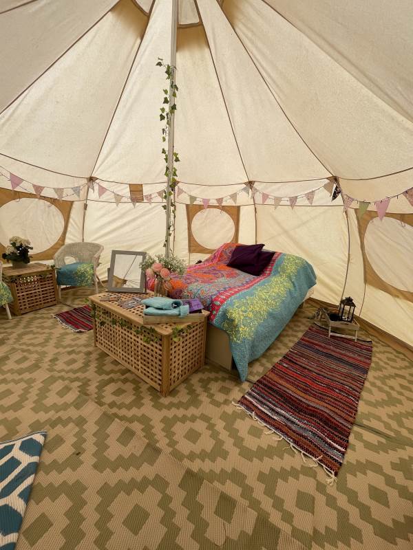 The Tent, which is 5 metres square, has a king size bed, a seated area with a small table and storage space. There is a table and chairs outside with a fire pit that you can cook on and a ghilie kettle with tea and coffee bits in the tent.. There is also a wood fired hot tub by the tent for your sole use.