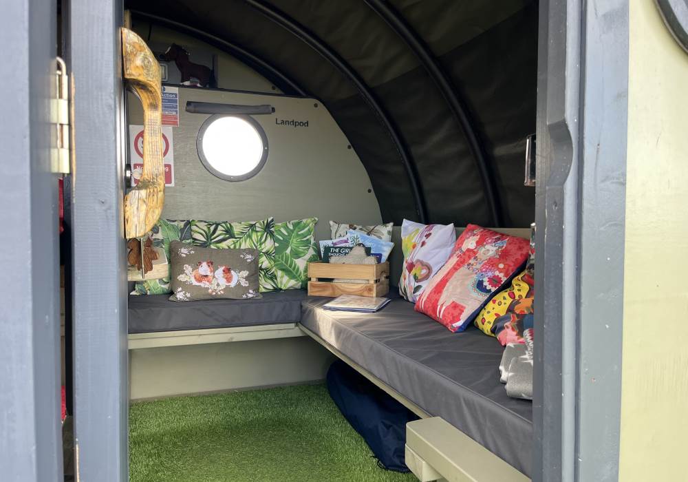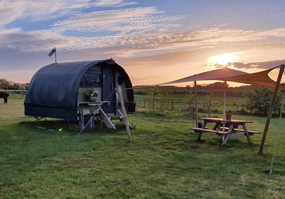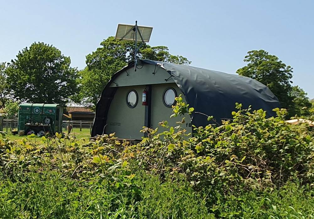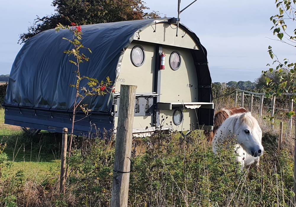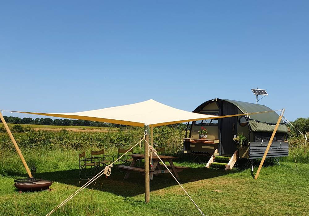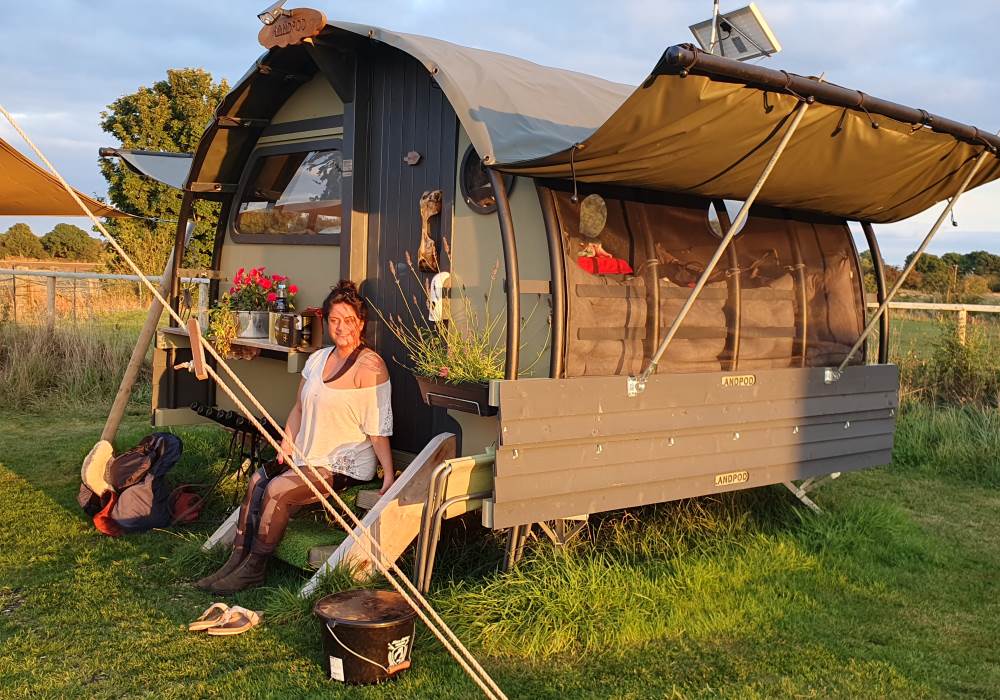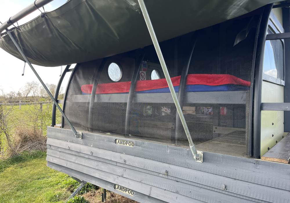 We are a Landpod Certified Location and have 3 “Woodland Lodge” Landpods positioned in our meadow area, each with uninterrupted views over the surrounding arable land and woodland. Sunsets are superb and on clear nights star-gazing is spectacular with the total absence of light pollution! Each of the Landpods has its own open space and designated area in a large field and each has a private shower pod with its own toilet and handwash facility. Every Landpod has a firepit and stylish canopy for outdoor cooking and to protect you from the elements. Picnic bench and table and comfortable chairs and throws/blankets all provided. 2 standard-sized double beds (bunk arrangement) with comfortable mattresses plus the bench seat as a 5th bed, large enough for a child. To complete the picture there is the quirky horsebox-kitchen, with everything you need for your stay.