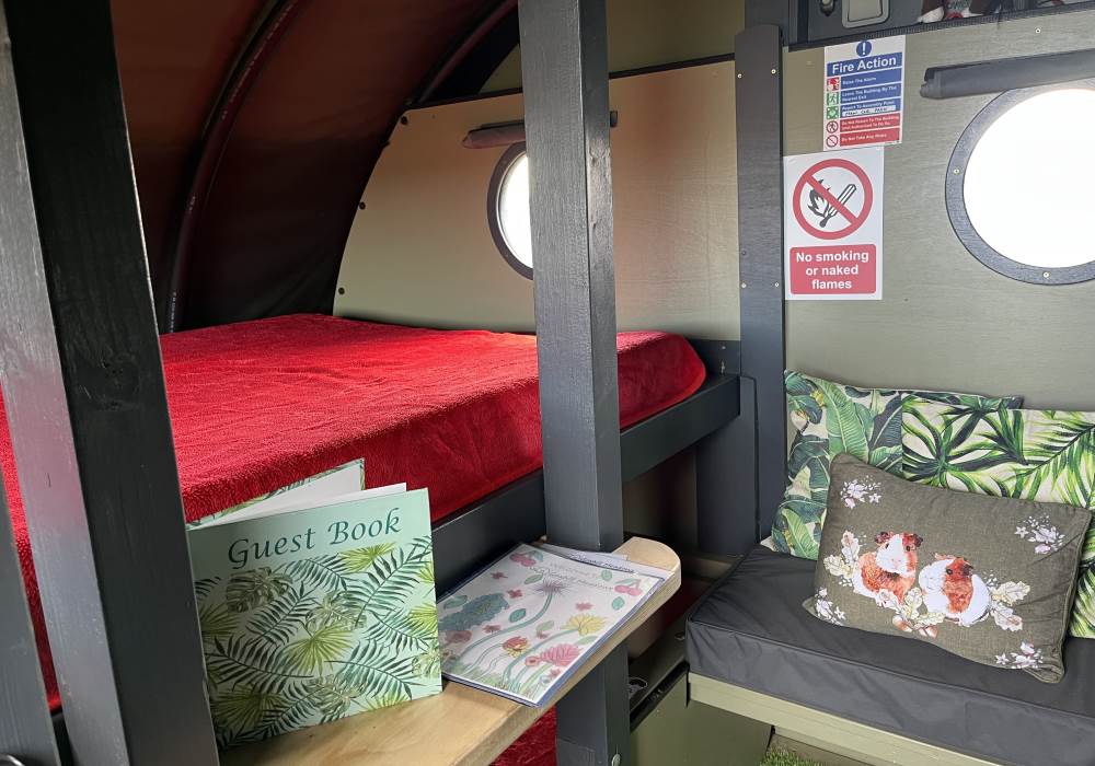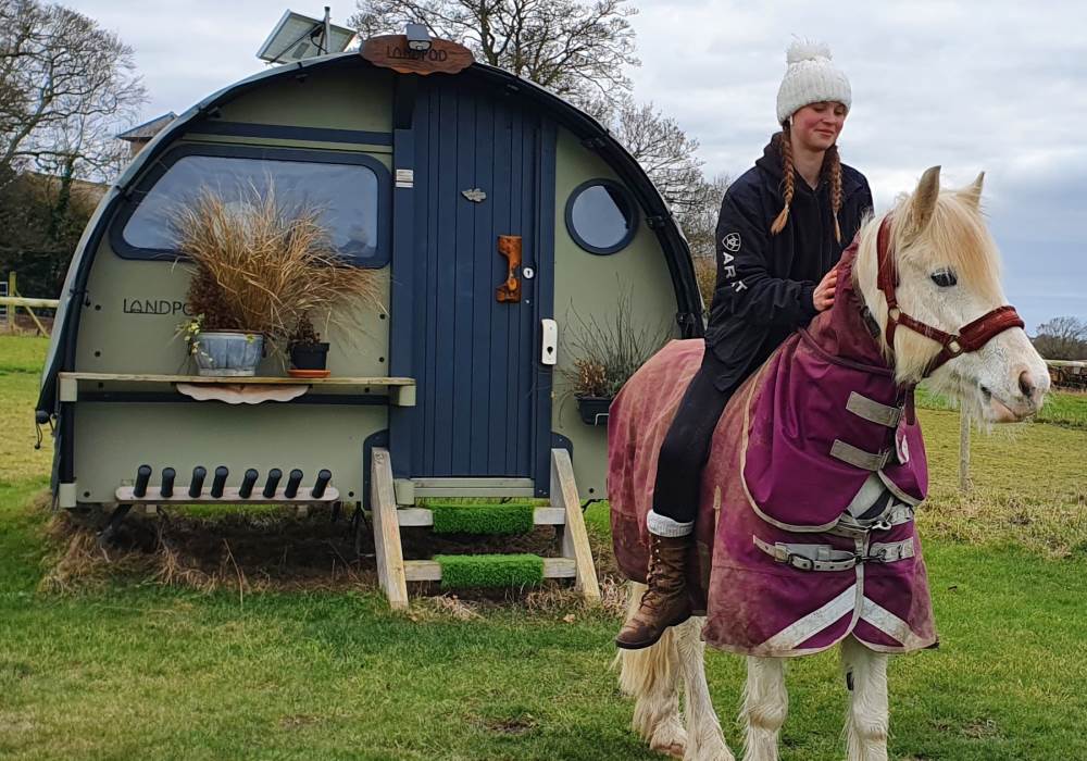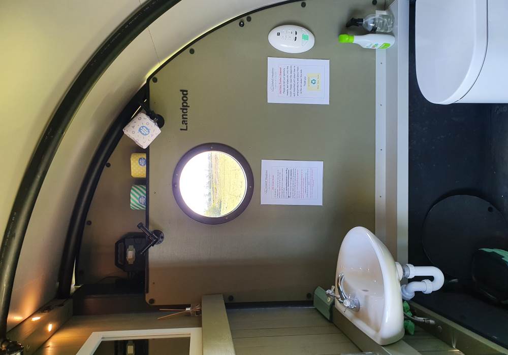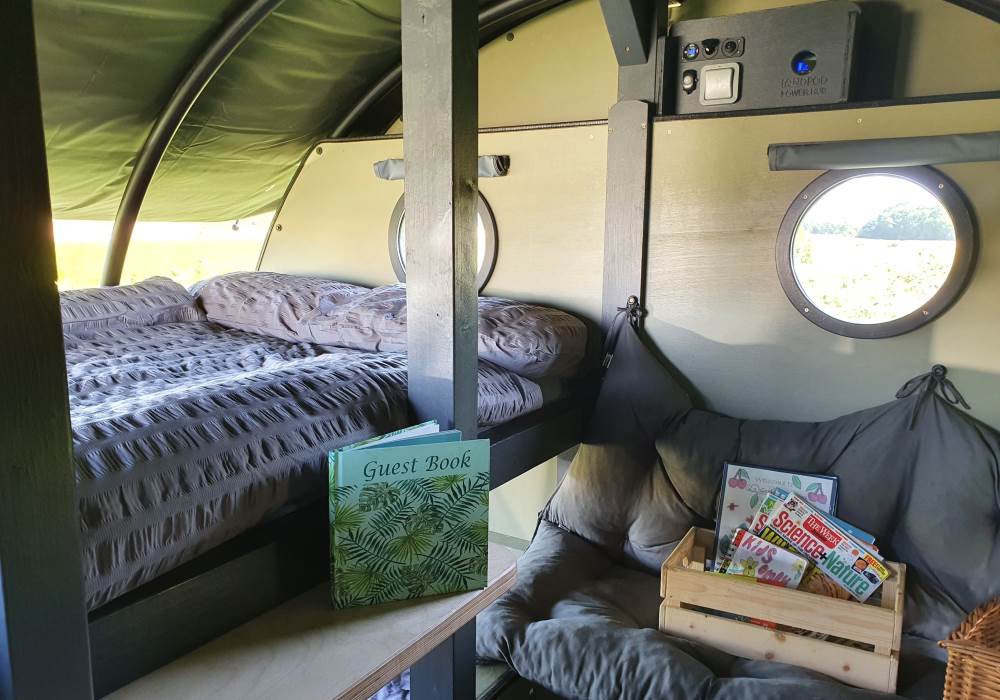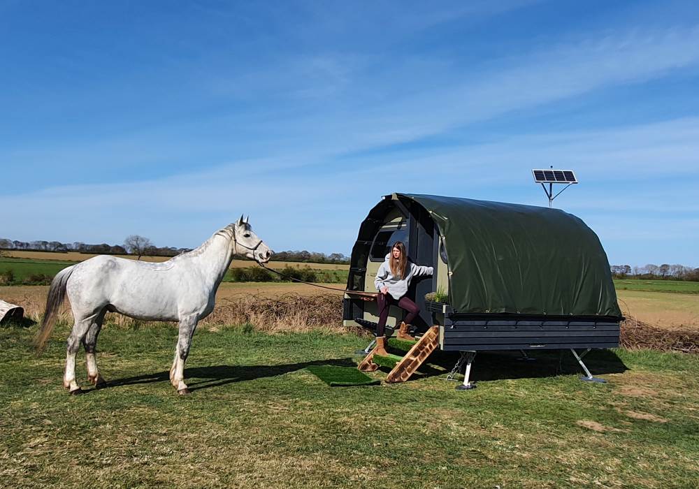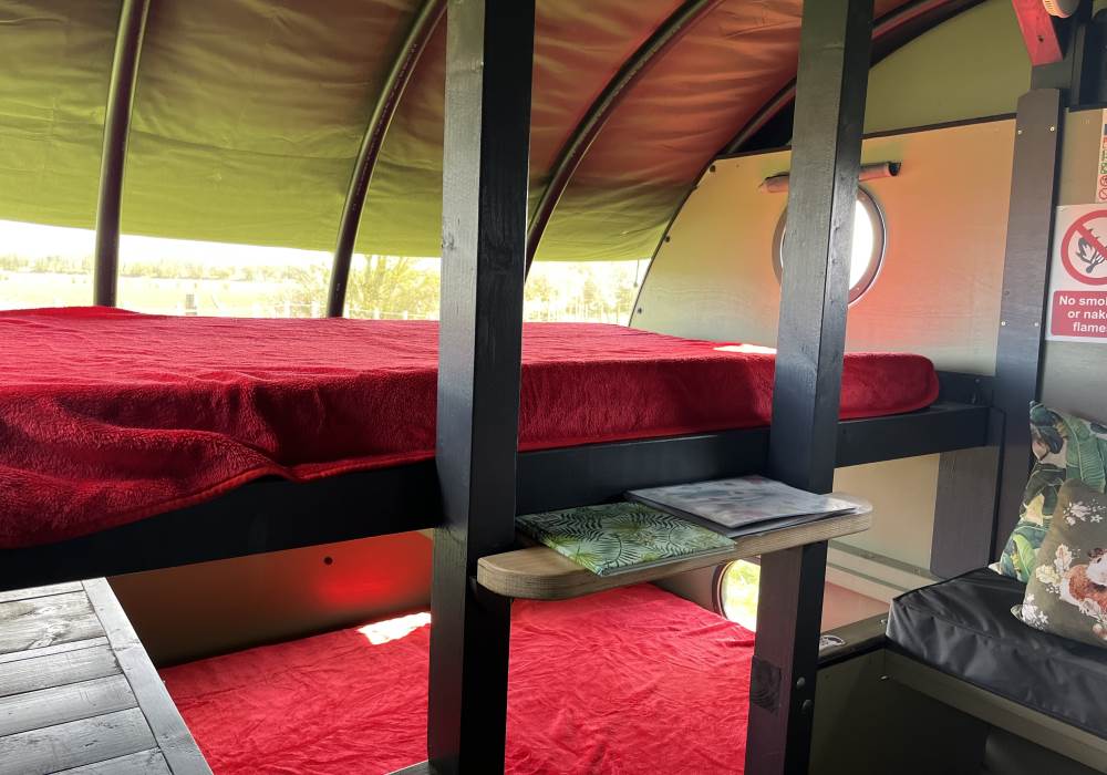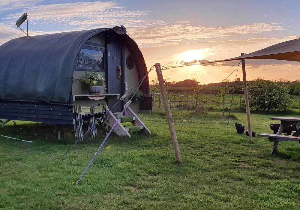 We are a Landpod Certified Location and have 3 “Woodland Lodge” Landpods positioned in our meadow area, each with uninterrupted views over the surrounding arable land and woodland. Sunsets are superb and on clear nights star-gazing is spectacular with the total absence of light pollution! Each of the Landpods has its own open space and designated area in a large field and each has a private shower pod with its own toilet and handwash facility. Every Landpod has a firepit and stylish canopy for outdoor cooking and to protect you from the elements. Picnic bench and table and comfortable chairs and throws/blankets all provided. 2 standard-sized double beds (bunk arrangement) with comfortable mattresses plus the bench seat as a 5th bed, large enough for a child. To complete the picture there is the quirky horsebox-kitchen, with everything you need for your stay.