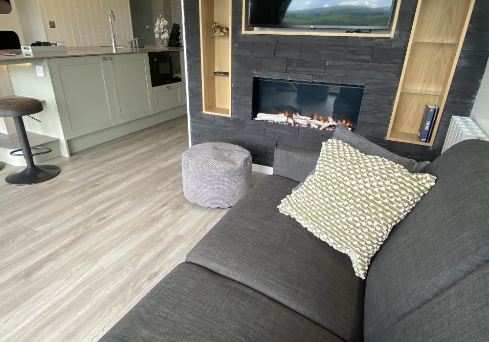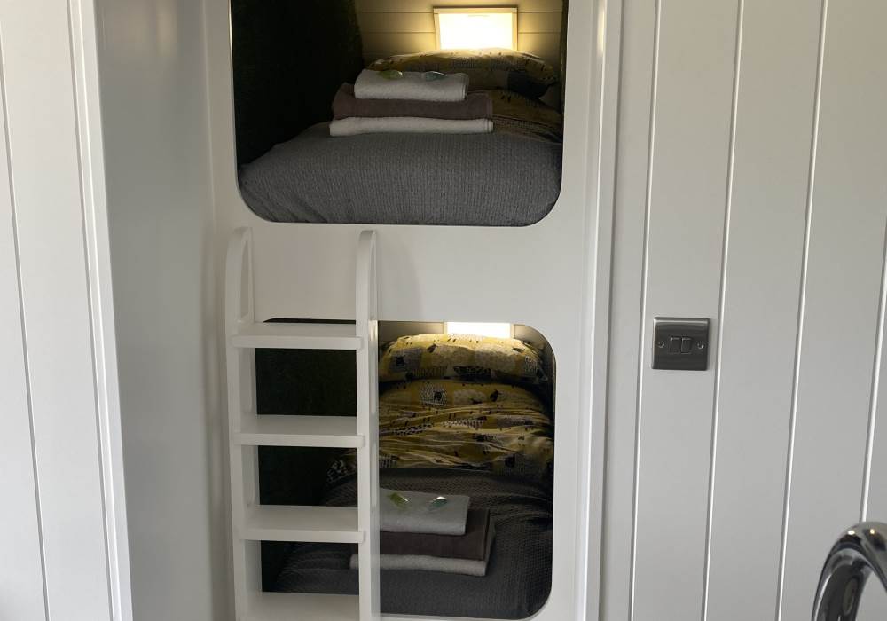 This is next to our wooded area on the site and accommodates up to eight people (one king size bedroom, 1 double bed, two bunk beds and a sofa bed.