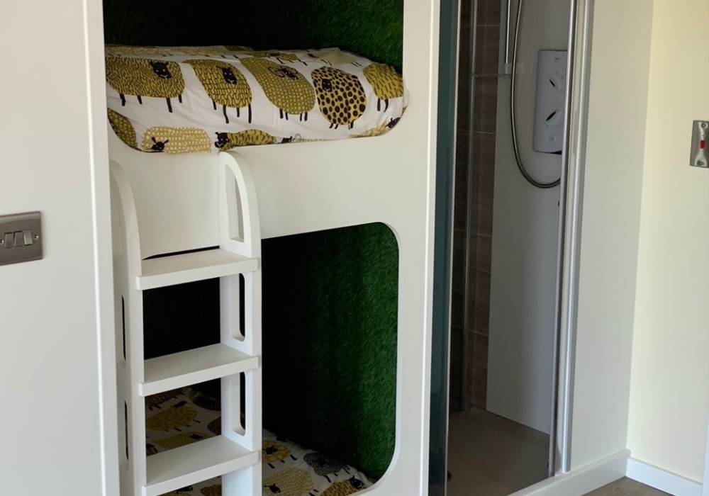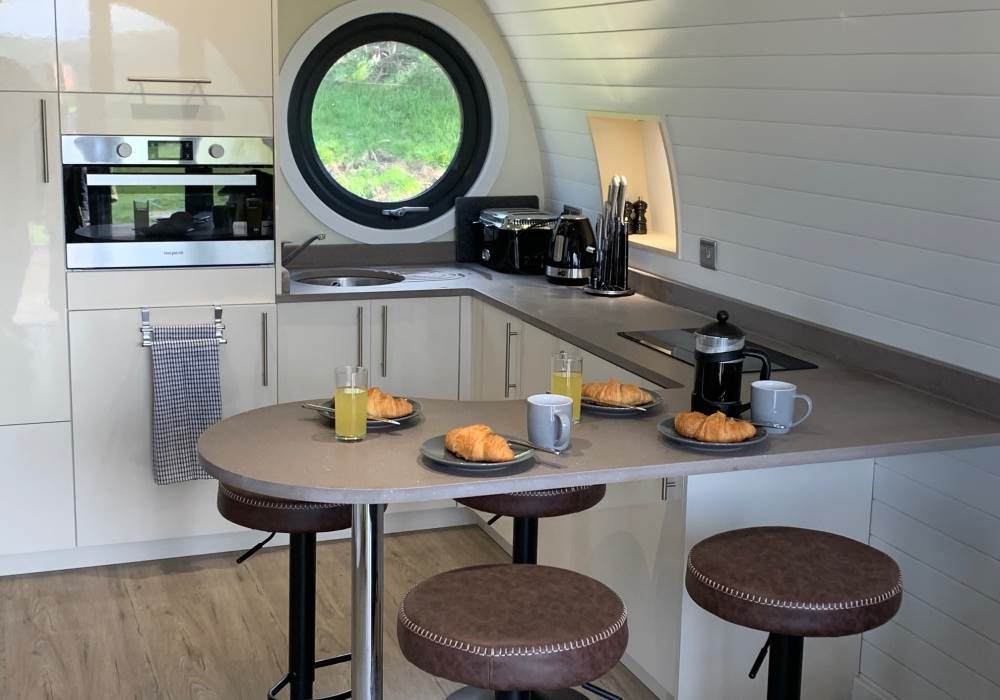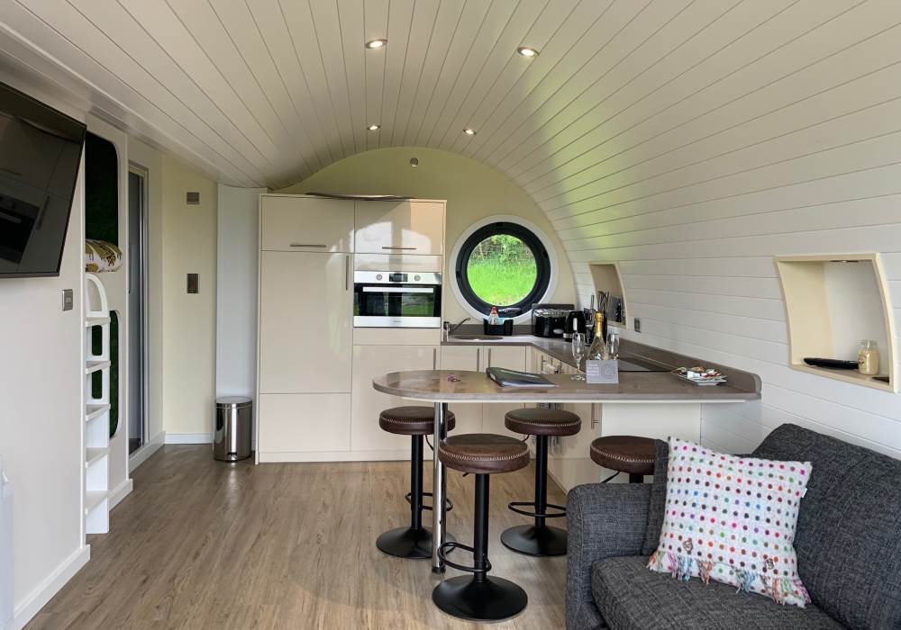 Our Wye Pod is a beautiful, luxurious double pod and is at the right hand side of the site and accommodates up to six people (one double bed (in a separate bedroom), two bunk beds (best suited to children) and a double sofa bed.