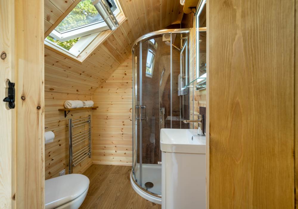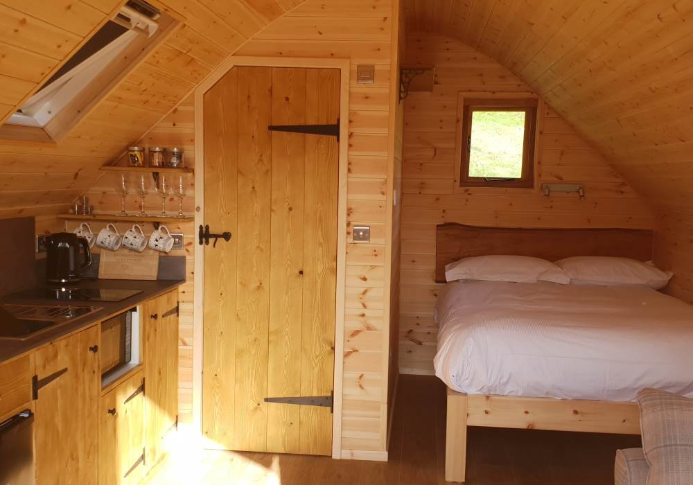 Our luxury pods have been handcrafted in oak on site by a local carpenter and are designed to "bring the outside in." Panoramic glass doors make the most of the spectacular views and Velux skylights allow for some serious stargazing. For extra comfort and cosiness, there's a log burner as well as underfloor heating.