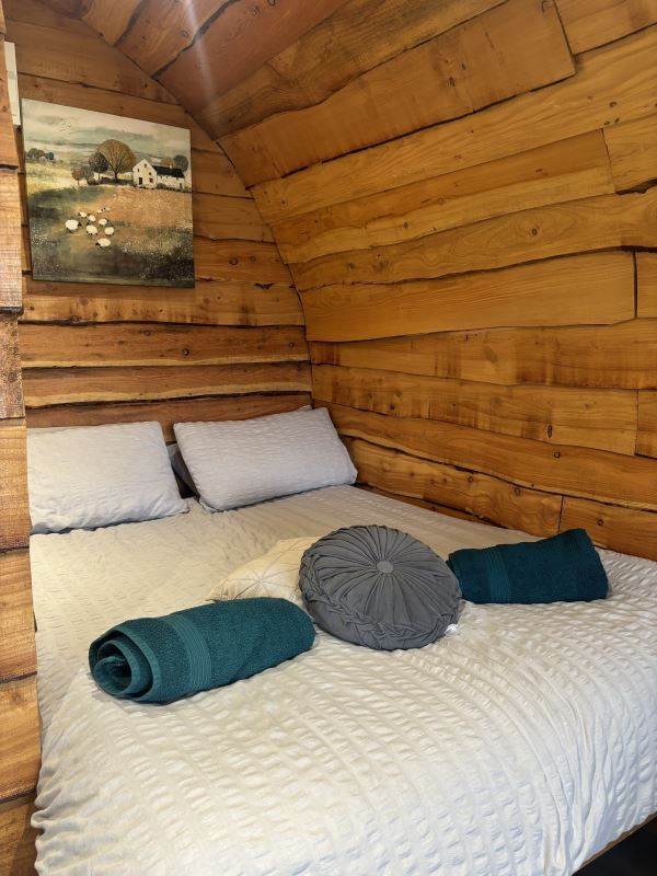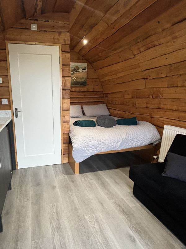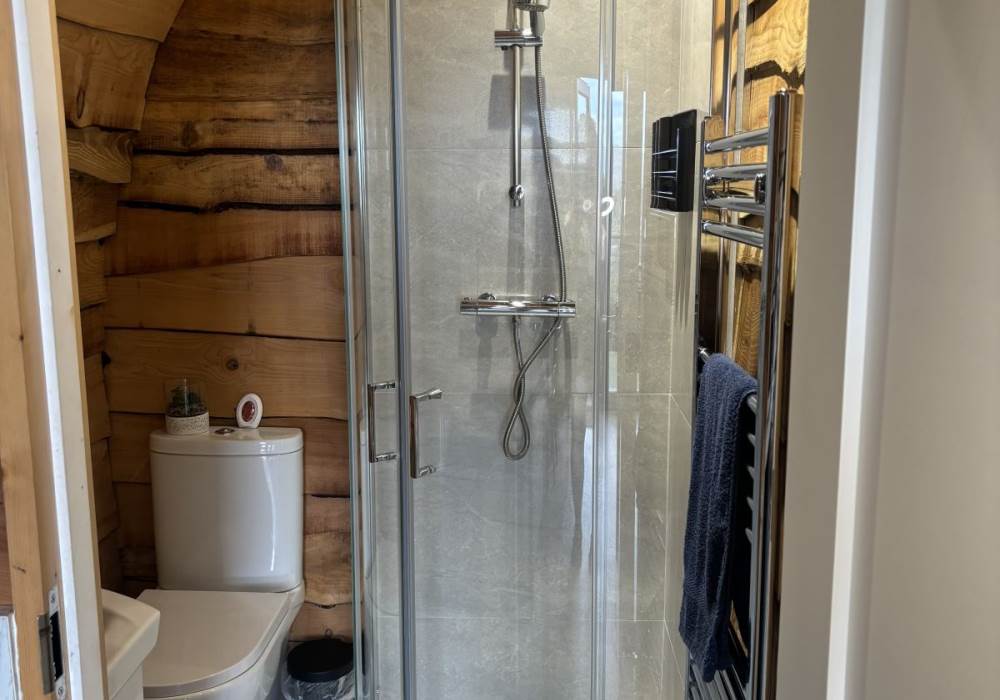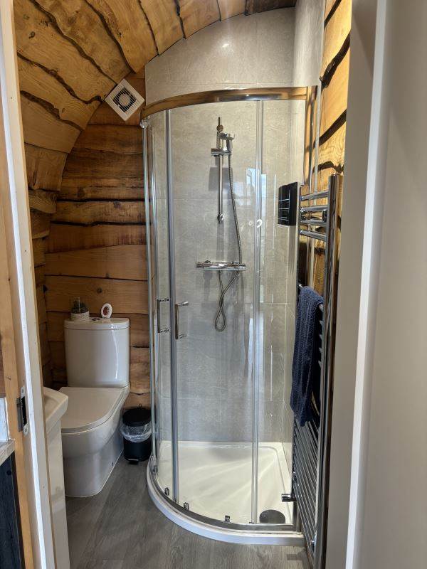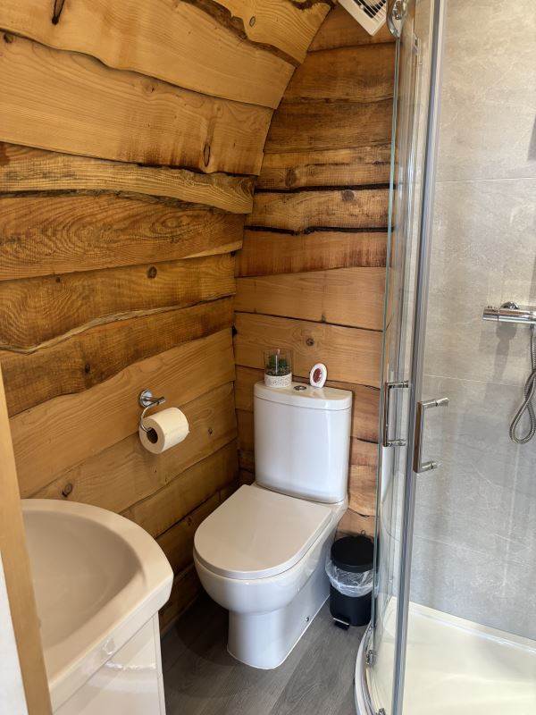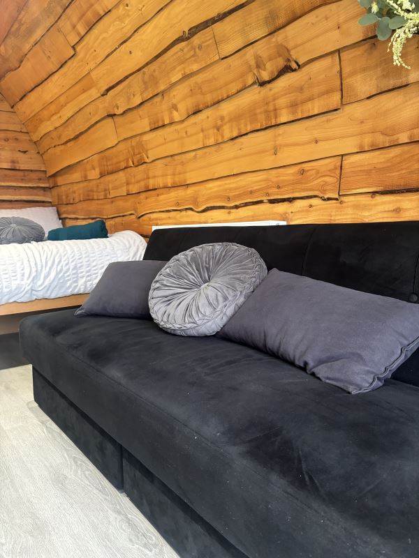 Our Suffolk Glamping pod boasts a full sized room, fully protected with our solid roof. Complete with double bed, large sofa bed, luxury linen, modern furniture, heating and electricity. Your en-suite bathroom has a toilet, sink and shower. Our bathroom suites have been built and completely designed by us here in Hilltown Co. Down.