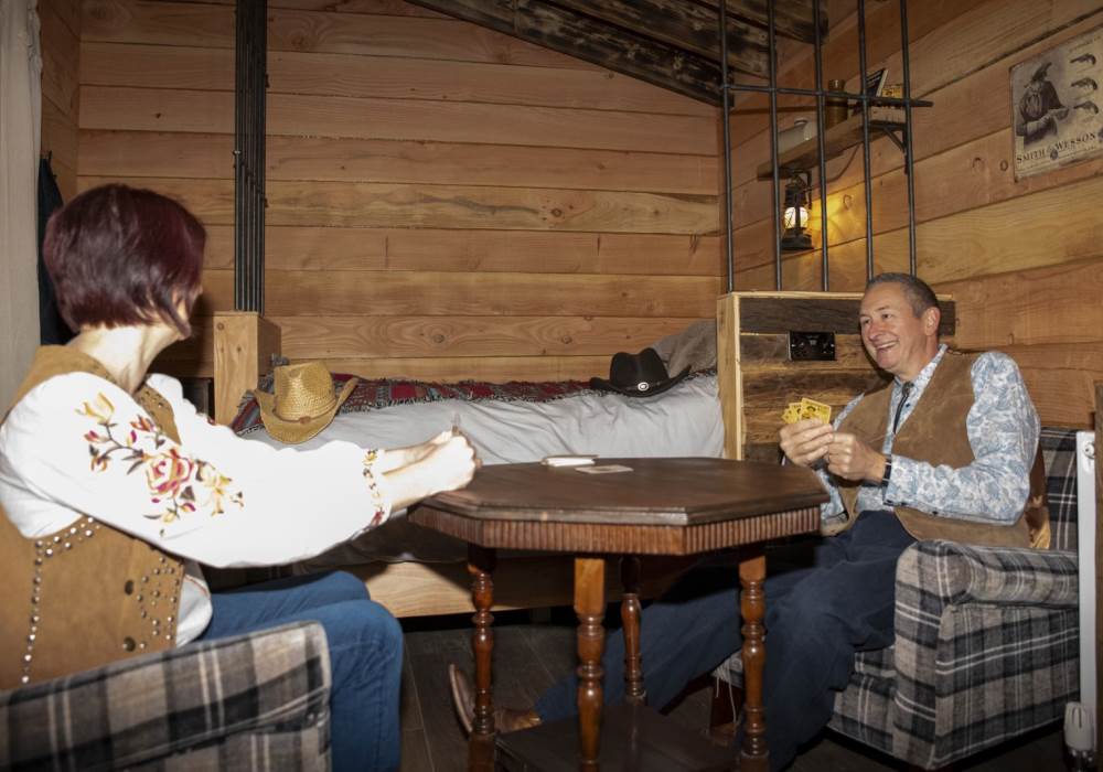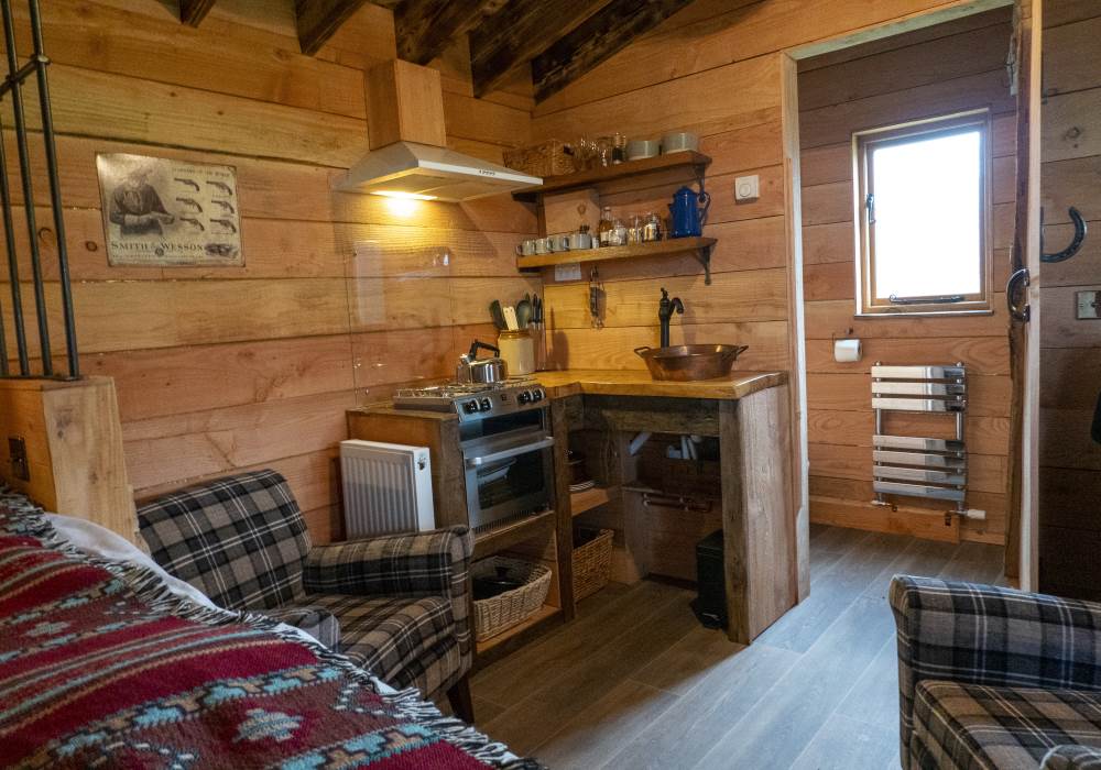 Our cabins boast a range of amenities, featuring a cooker, grill, fridge and a copper sink that beautifully compliments a one of a kind elm worktop. Central heating and full insulation will keep you cosy in winter and cool in the summer. You will have your own fire pit for BBQ and toasting marshmallows plus the shared larger fire pit for those campfire evenings and rocking chairs on the porch to keep a look out for the posse or just to sit and switch off from life’s hustle and bustle and soak up the view. Feel free to wear your cowboy boots and hats as you will fit right in here.
