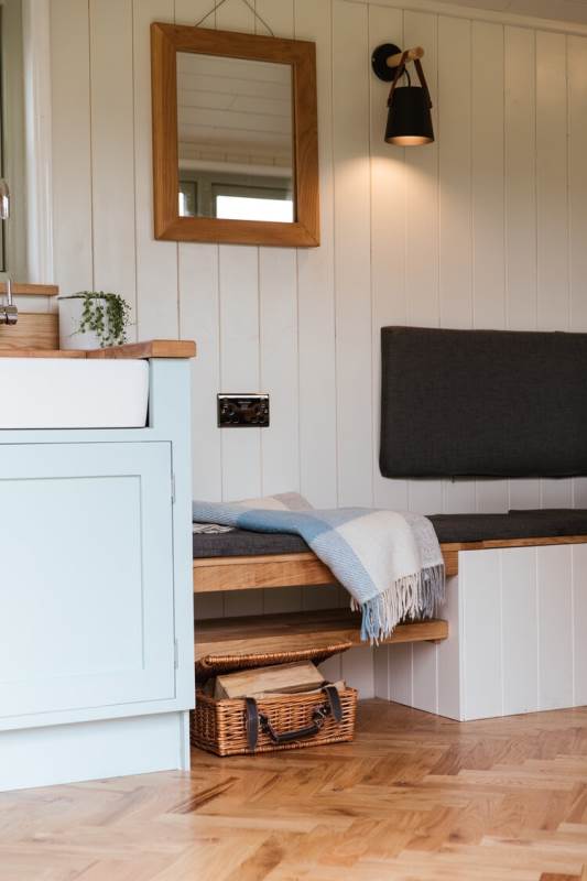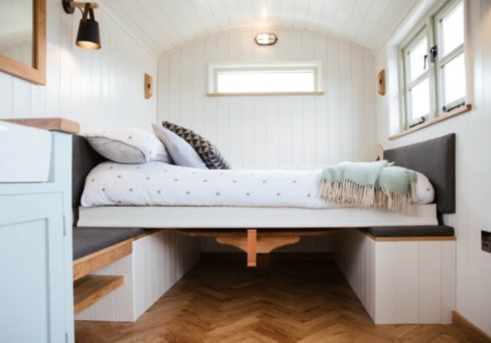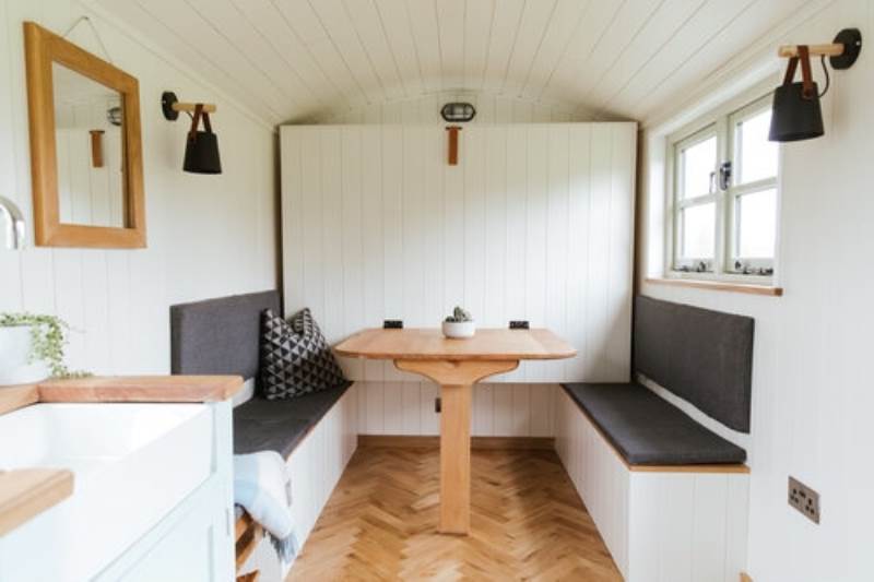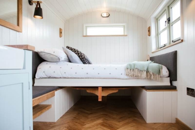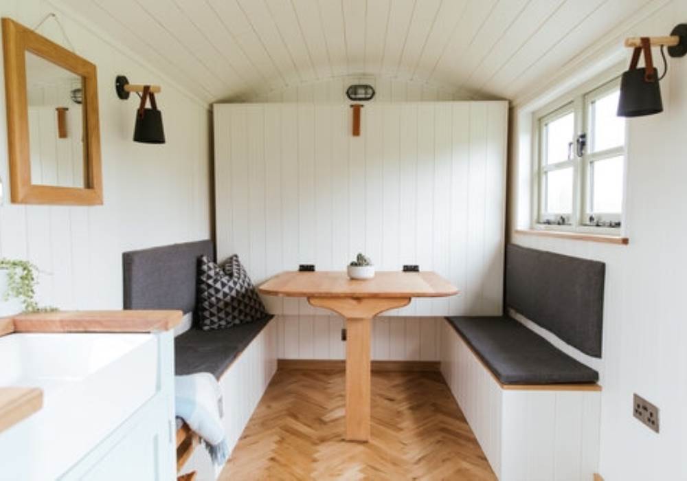 There is a hand built oak table and bench seats for comfy reading, playing board games, listening to music or gazing out across the fields, as well as a fold down wall bed which can be lifted to reveal the table and seating area.