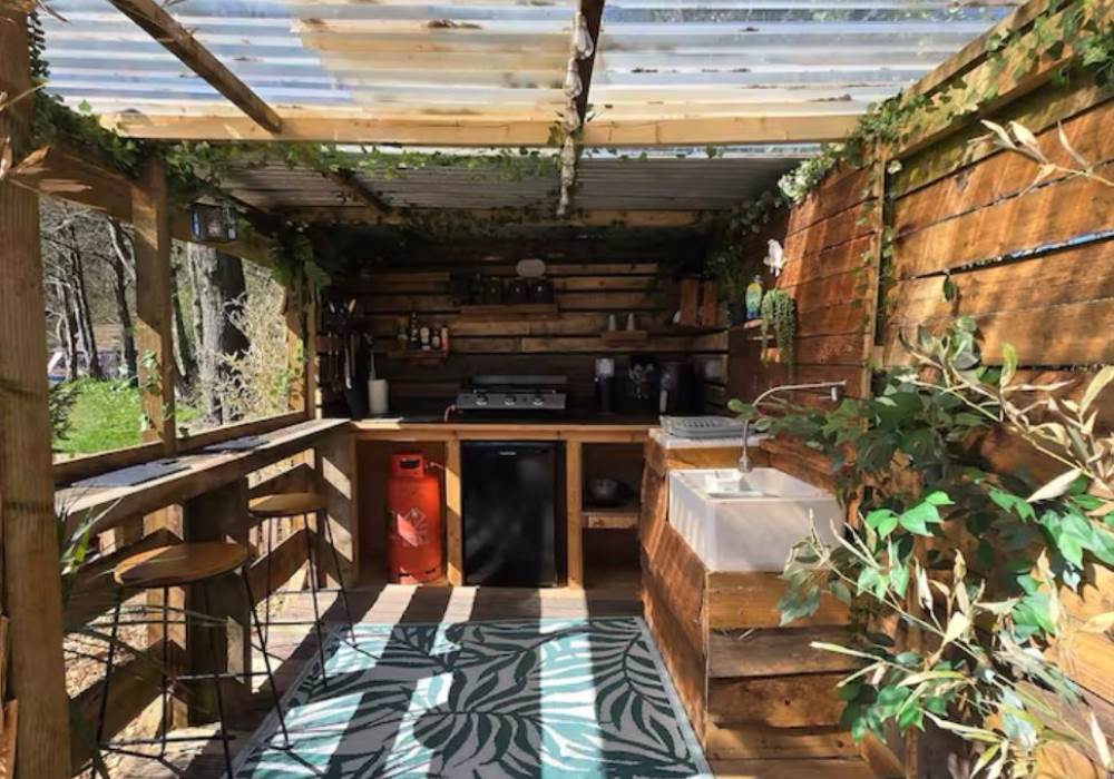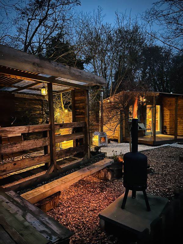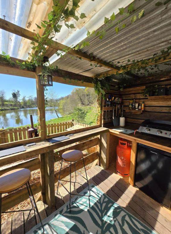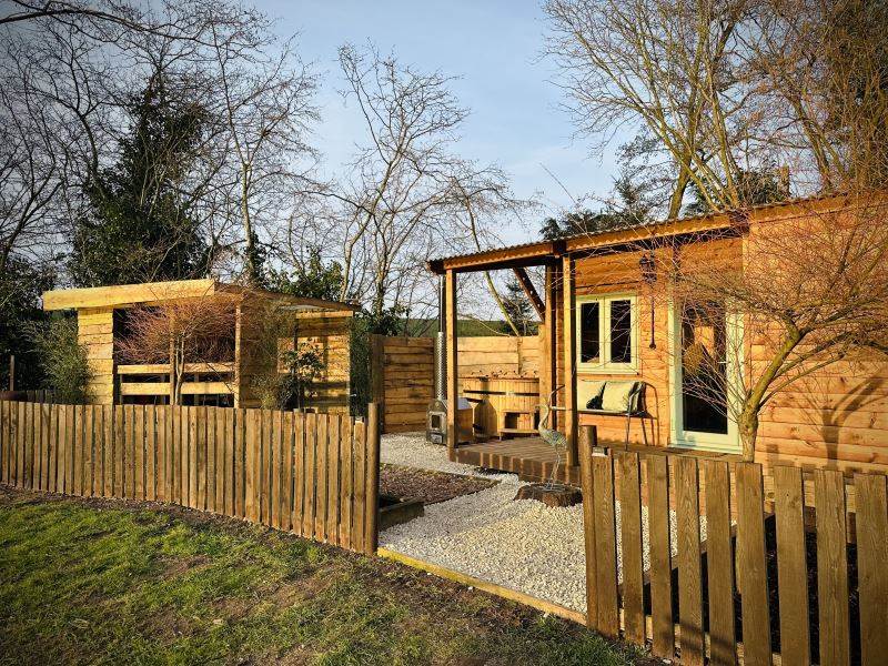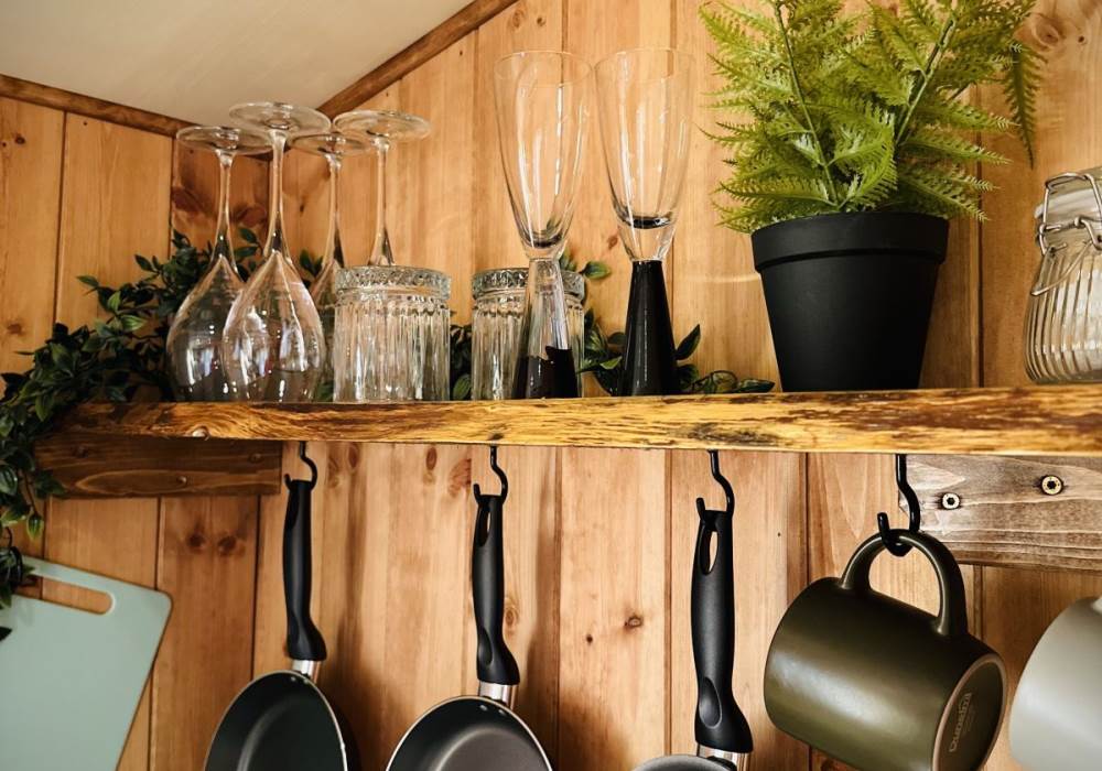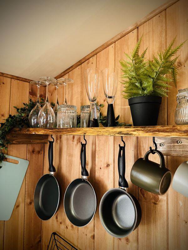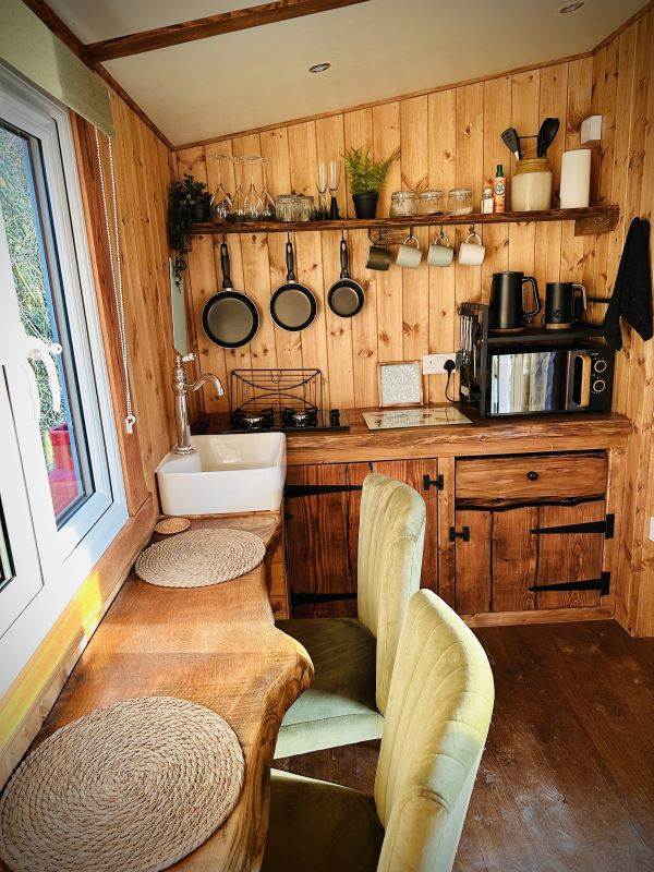 Entering through the double patio doors off the small veranda, you are greeted by a cosy log burner in the open plan cabin. With a luxurious double bed to the left of the cabin, the compact but well appointed kitchen is on the opposite side, with a beautiful timber breakfast bar with luxury dining chairs overlooking the stream and hedgerow - during the winter months you may even be able to see through the greenery across lane to the neighbouring vineyard. The kitchen features a gas hob, small fridge, kettle, air fryer, microwave and all of usual pots, crocks and glassware you will need.