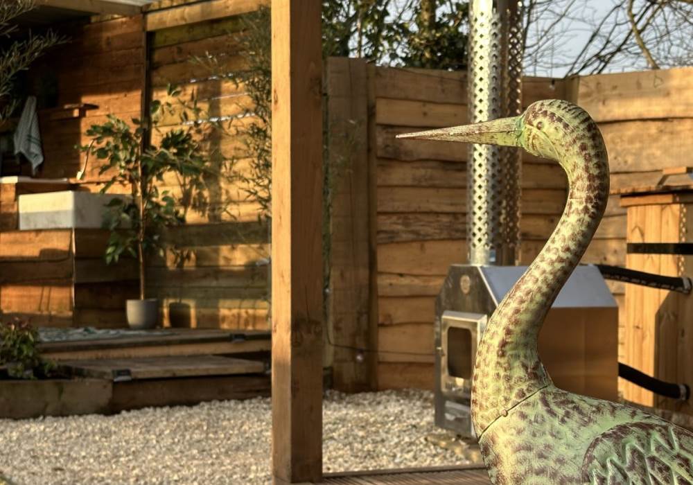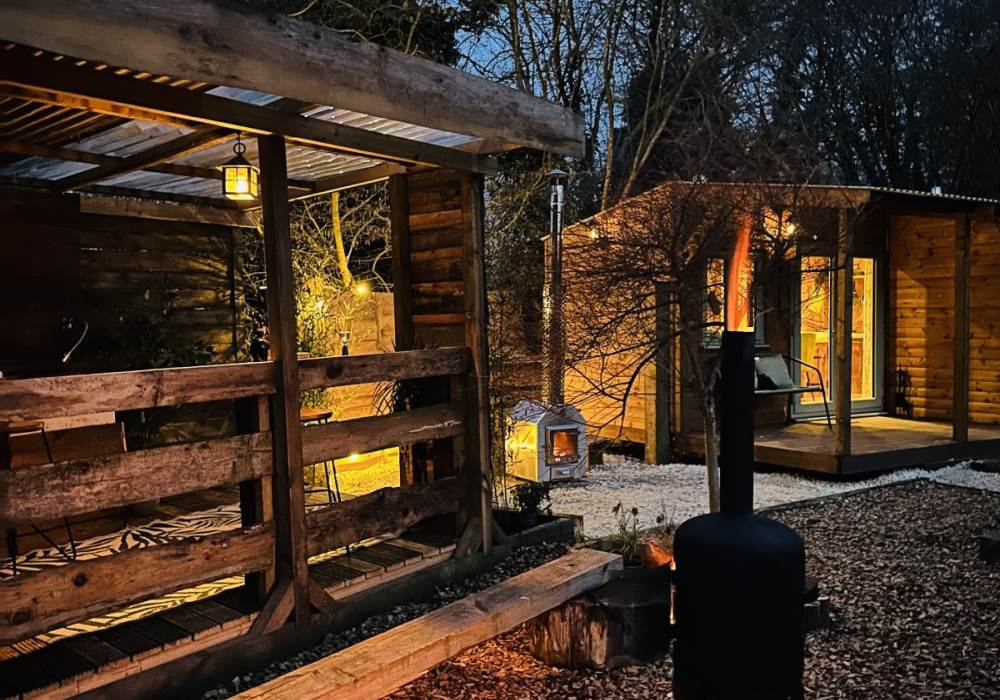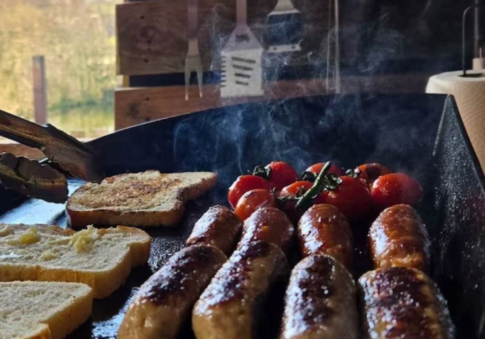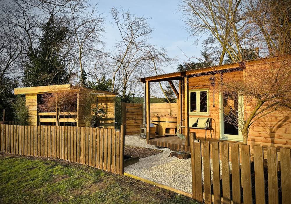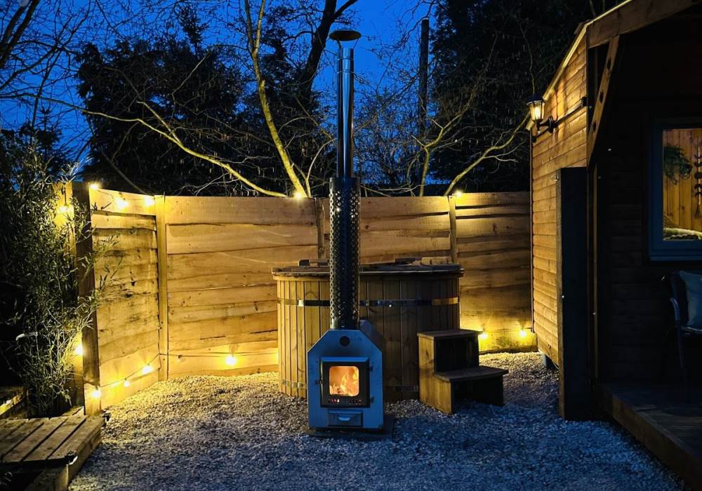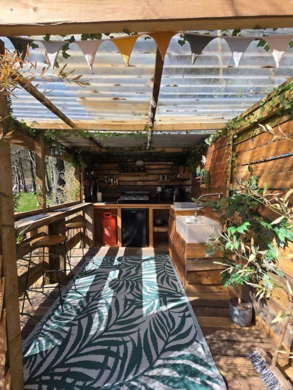 Entering through the double patio doors off the small veranda, you are greeted by a cosy log burner in the open plan cabin. With a luxurious double bed to the left of the cabin, the compact but well appointed kitchen is on the opposite side, with a beautiful timber breakfast bar with luxury dining chairs overlooking the stream and hedgerow - during the winter months you may even be able to see through the greenery across lane to the neighbouring vineyard. The kitchen features a gas hob, small fridge, kettle, air fryer, microwave and all of usual pots, crocks and glassware you will need.