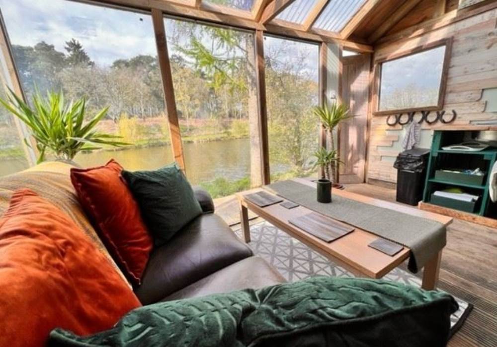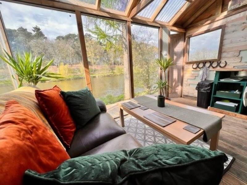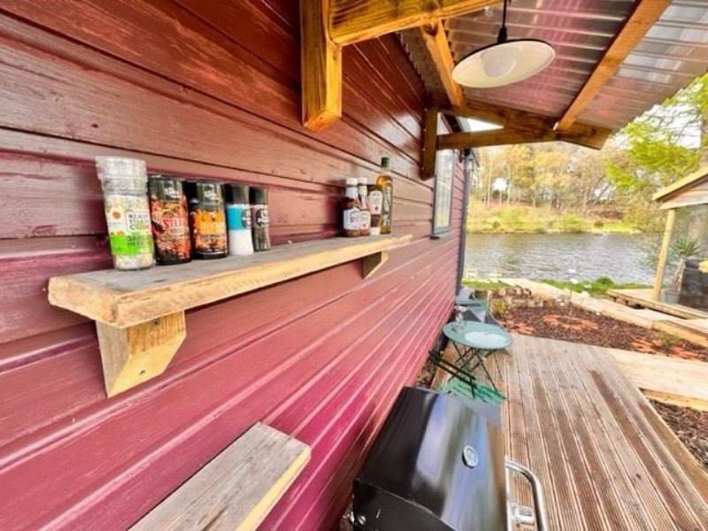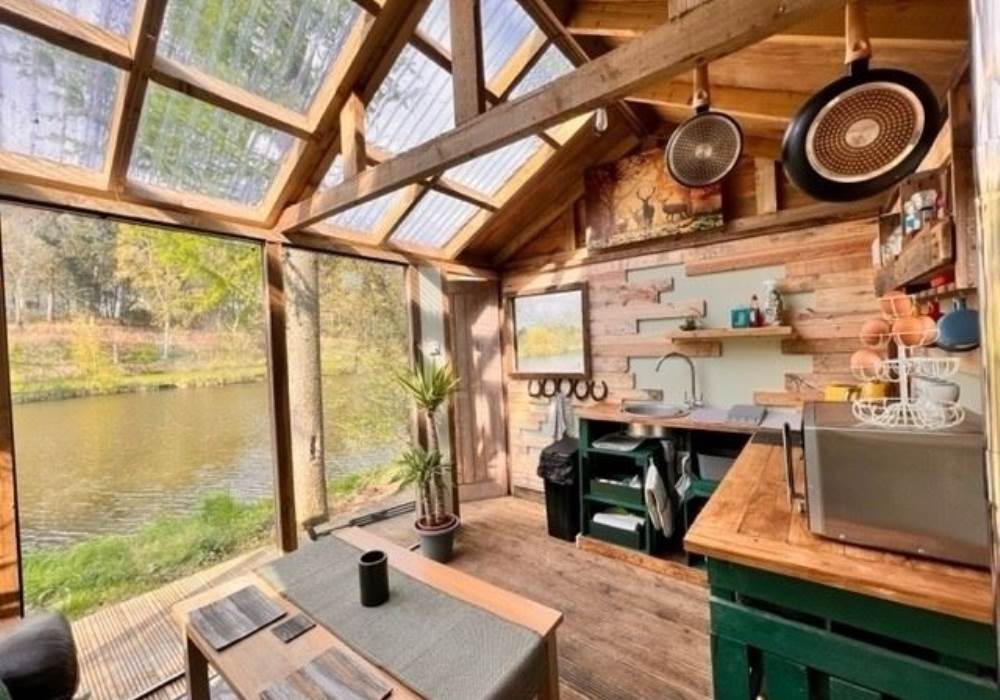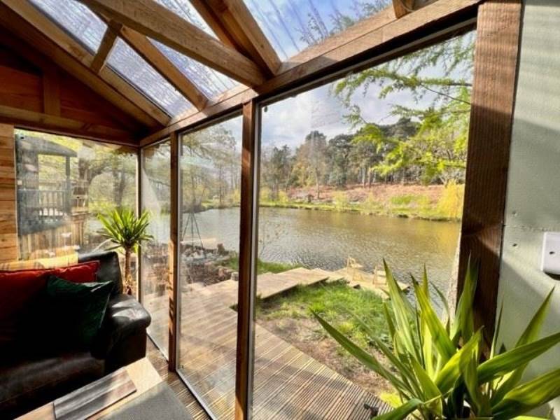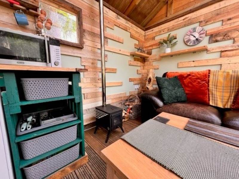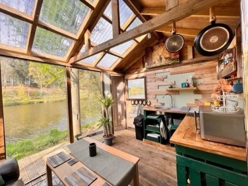 But wait, there's more! Moorhen's Rest also boasts a separate, rustic outbuilding with floor to ceiling windows that gives you a stunning view of the lake no matter what the weather. Inside, there's a well equipped kitchen with microwave oven / gas hob, fridge and all of the utensil, crockery, cutlery you'll need, plus a comfy lounge area with another wood-fired burner. We provide tea, coffee, sugar and milk.
