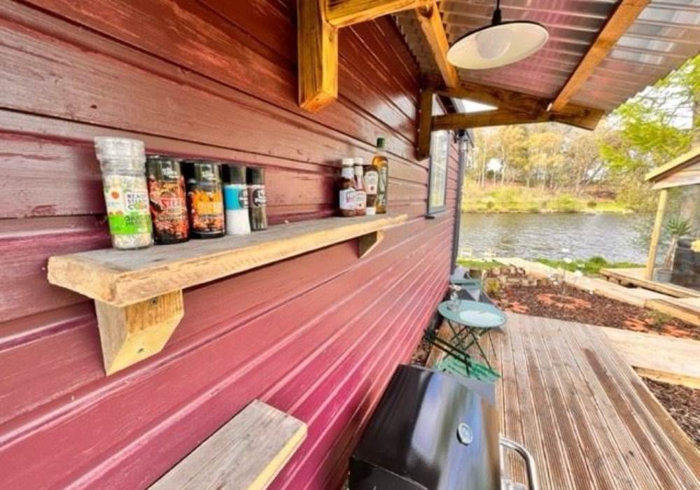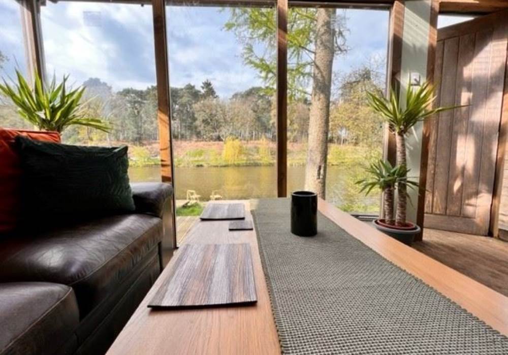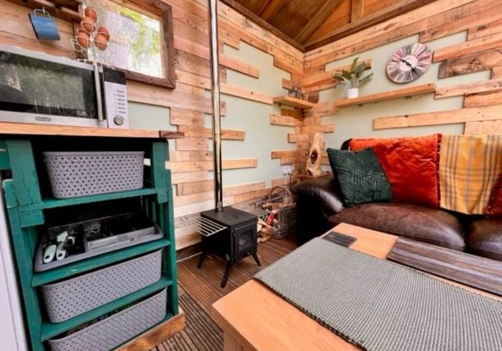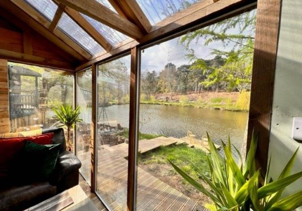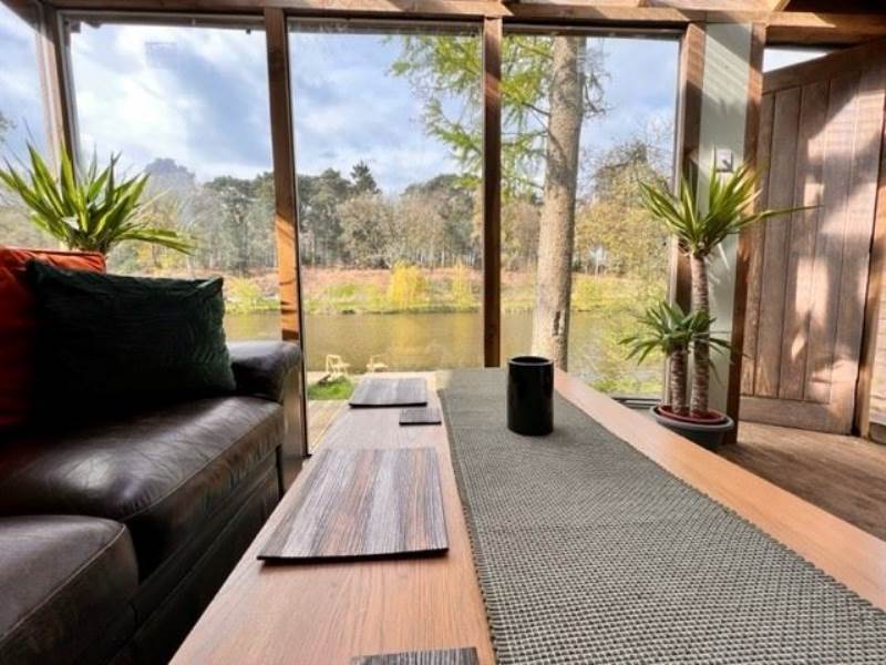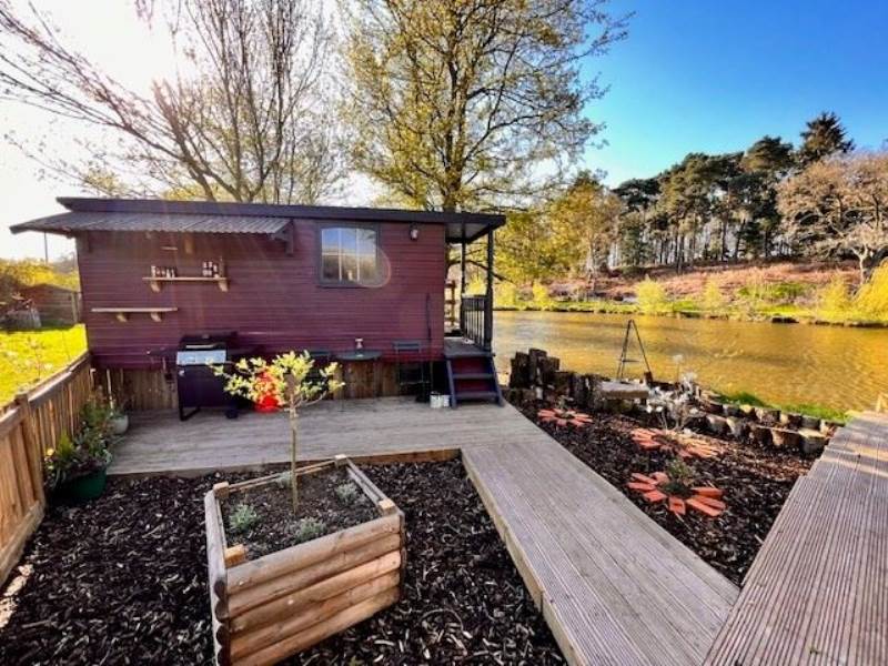 But wait, there's more! Moorhen's Rest also boasts a separate, rustic outbuilding with floor to ceiling windows that gives you a stunning view of the lake no matter what the weather. Inside, there's a well equipped kitchen with microwave oven / gas hob, fridge and all of the utensil, crockery, cutlery you'll need, plus a comfy lounge area with another wood-fired burner. We provide tea, coffee, sugar and milk.