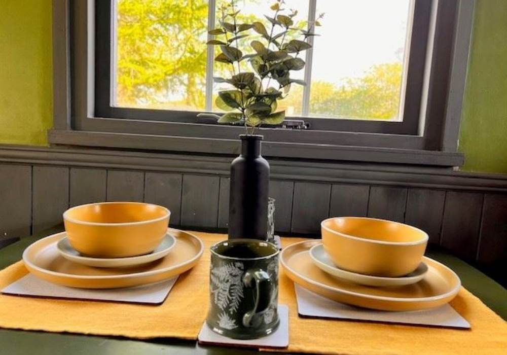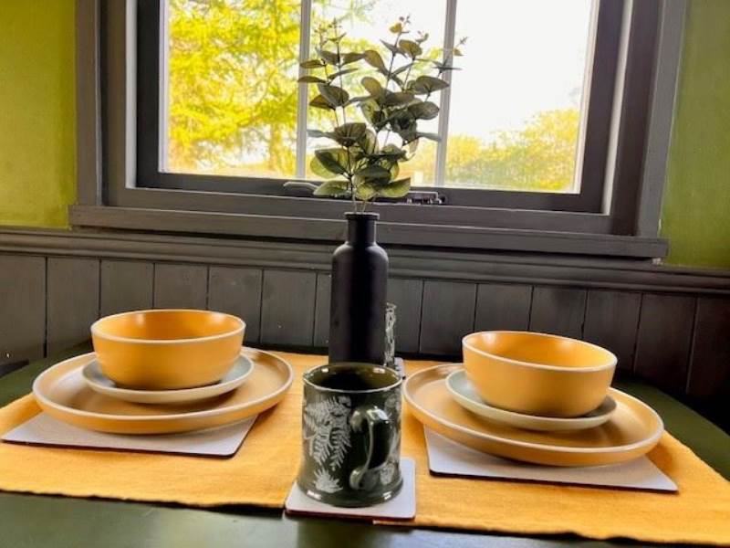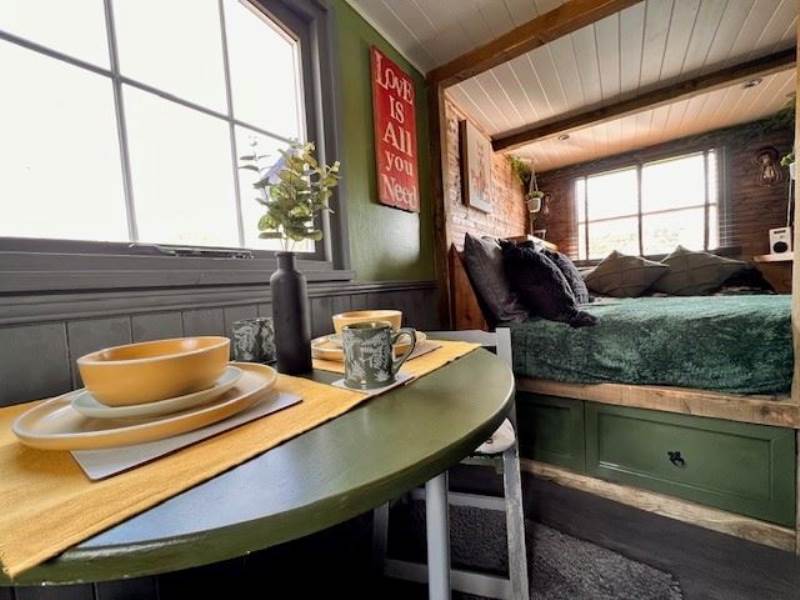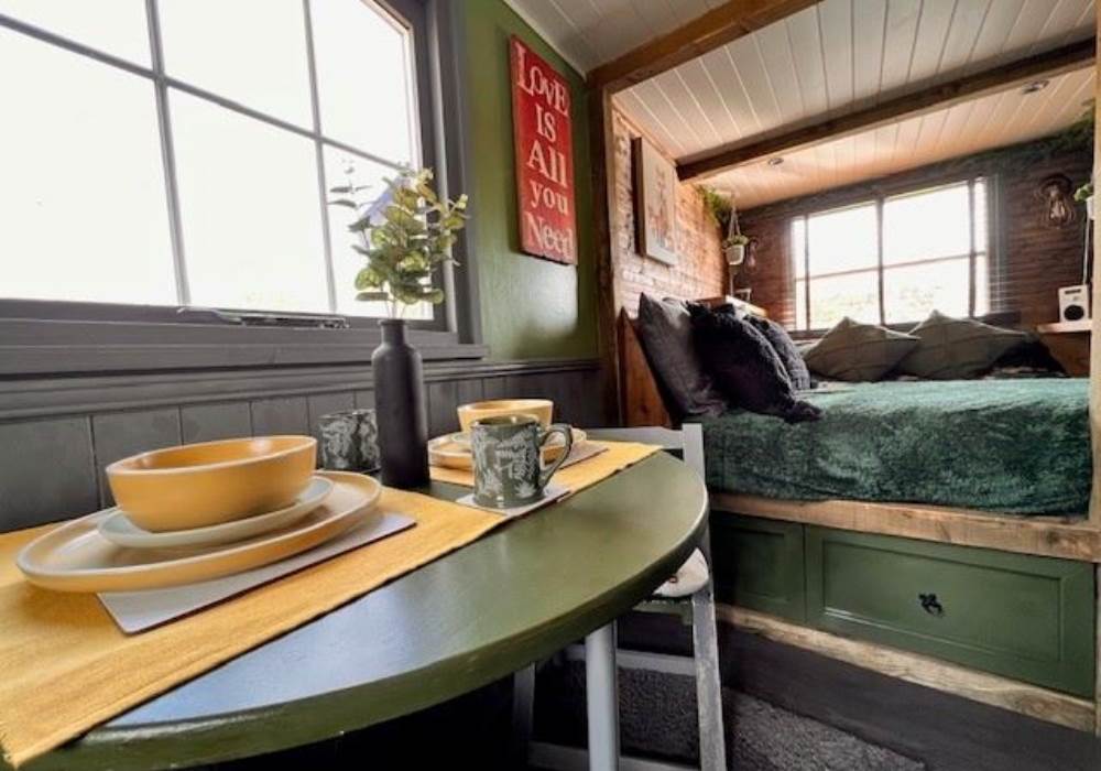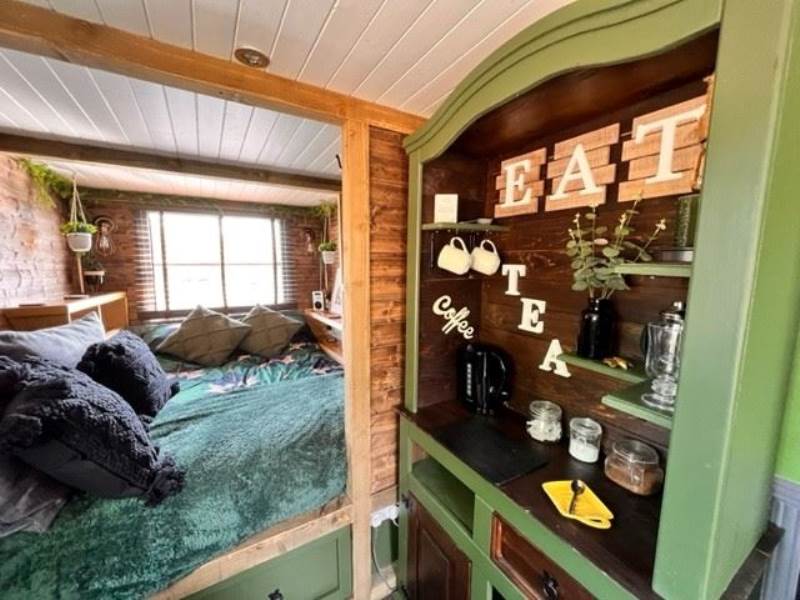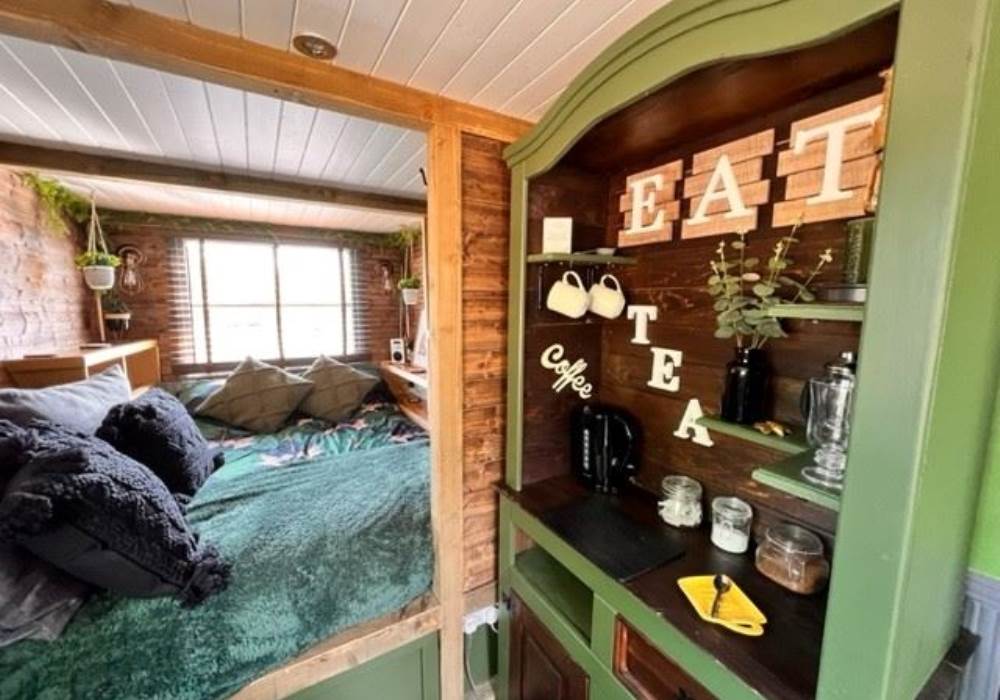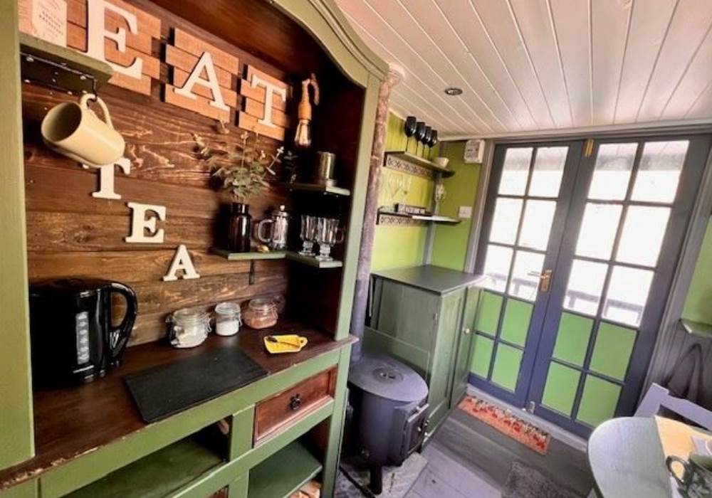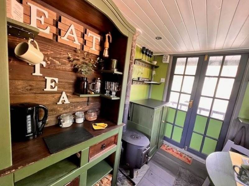 Step inside our cozy Shepherds Hut and be greeted by comfy double bed with soft velvet bedding (we always get compliments on this bedding and have had guests ask where it is from, so they can buy it for their own homes!); a bespoke coffee and tea unit, mini fridge, breakfast table, wood-fired log burner to ensure you're always warm and toasty, plus 'old school' DVD collection for the TV.