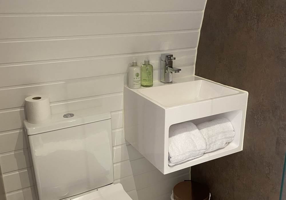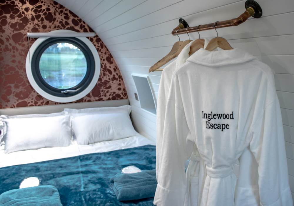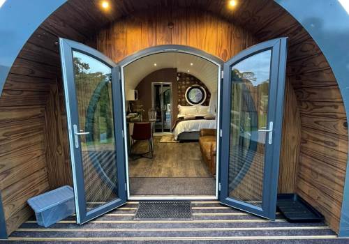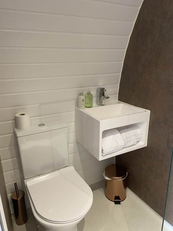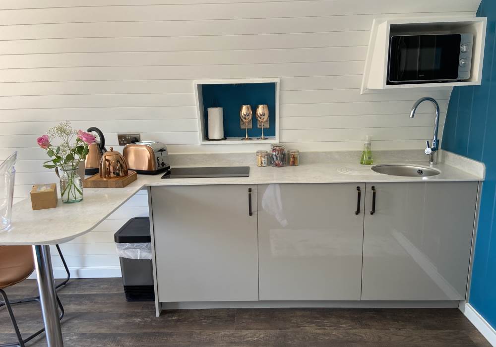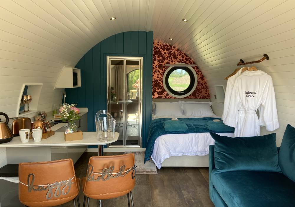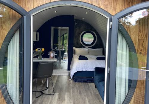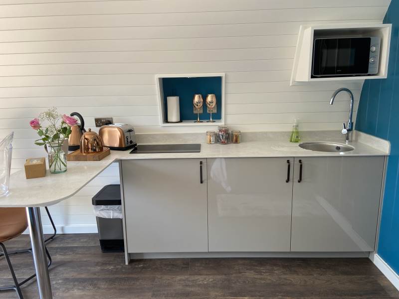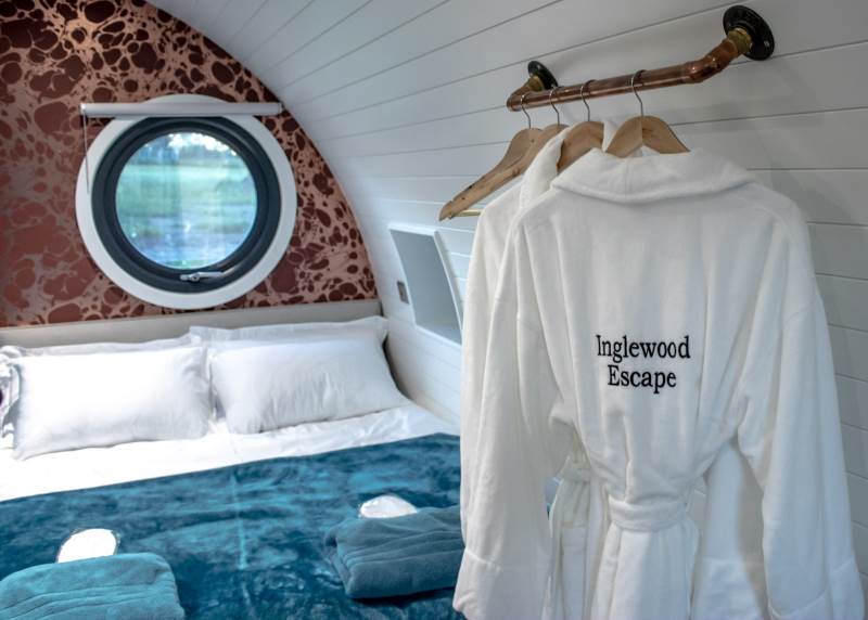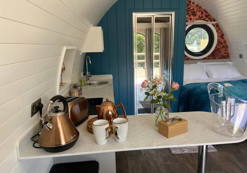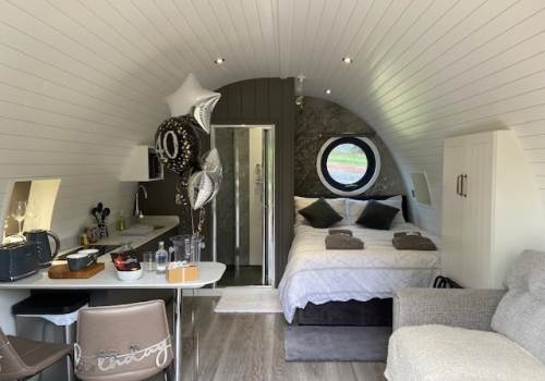 Benedict is finished to a high standard including an en-suite wet room with thermostatic shower, toilet and sink. Included are locally sourced toiletries from Out of Eden, which are dermatologically approved for sensitive skin, vegan and cruelty free. A King size bed with all bed linen, bath and hand towels and 2 luxury bathrobes are also in the pod. Fitted with a galley kitchen incorporating a double induction hob, microwave, fridge with freezer compartment, kettle and toaster. The pod includes a frying pan, saucepan, crockery, cutlery, cooking utensils, tea towel, washing up liquid and dish cloth.