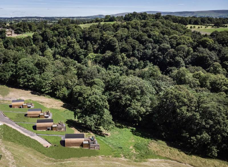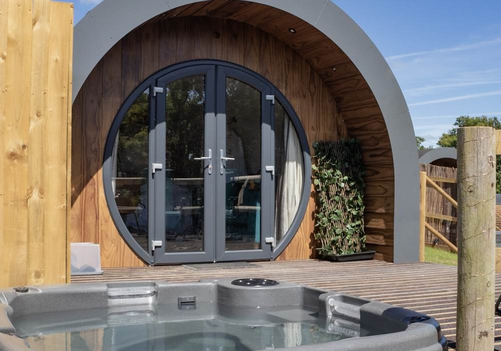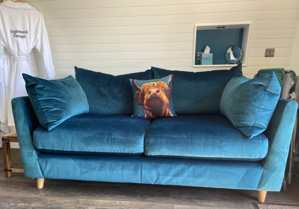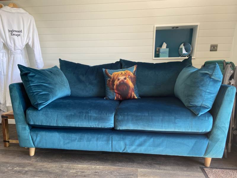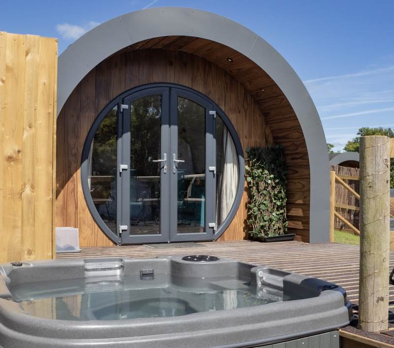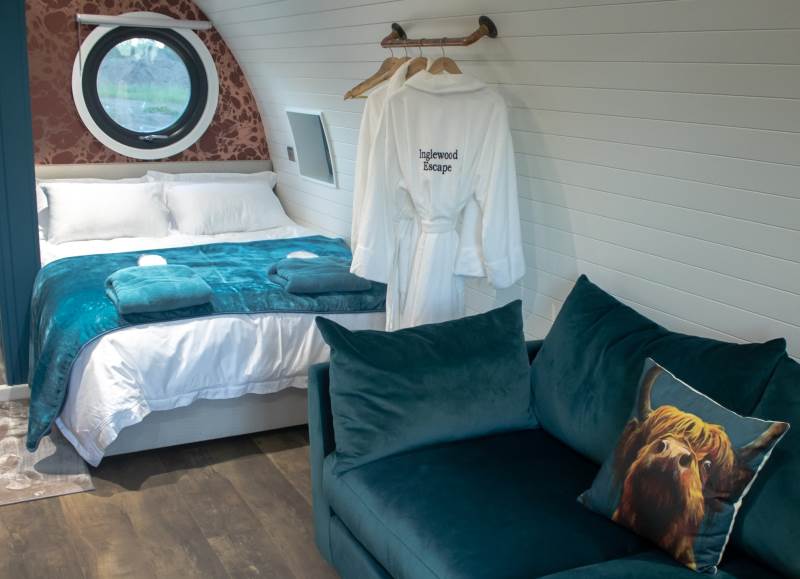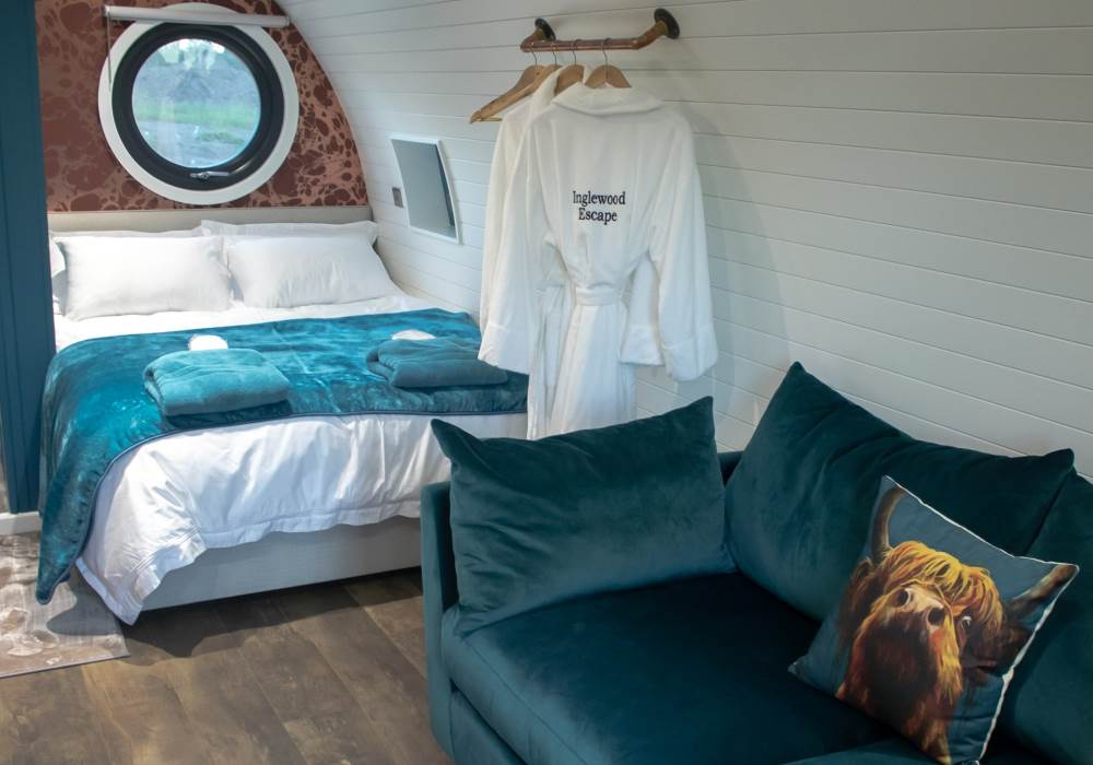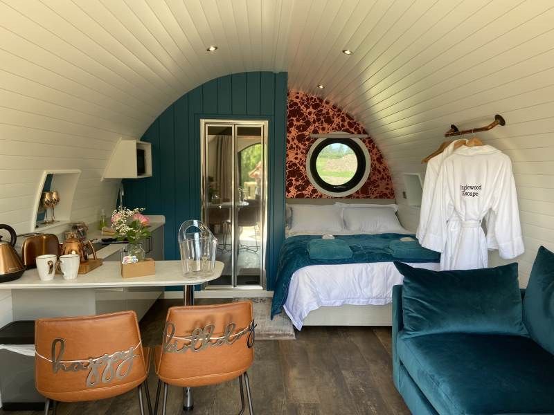 Benedict has a vibrant teal double sofa and a 32" led smart TV. Outside on the decking is a recessed hot tub and 2 recliner chairs. An ivy leaf trellis is included to provide a screen across the top of the steps to enable more privacy while in the pod. A foldable clothes airer is inside the pod for your wet clothes.