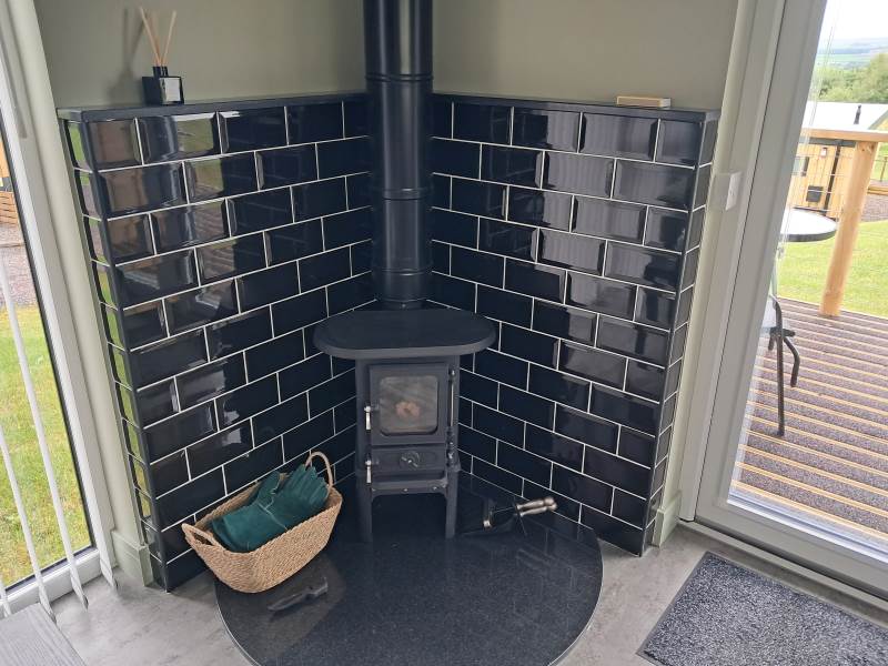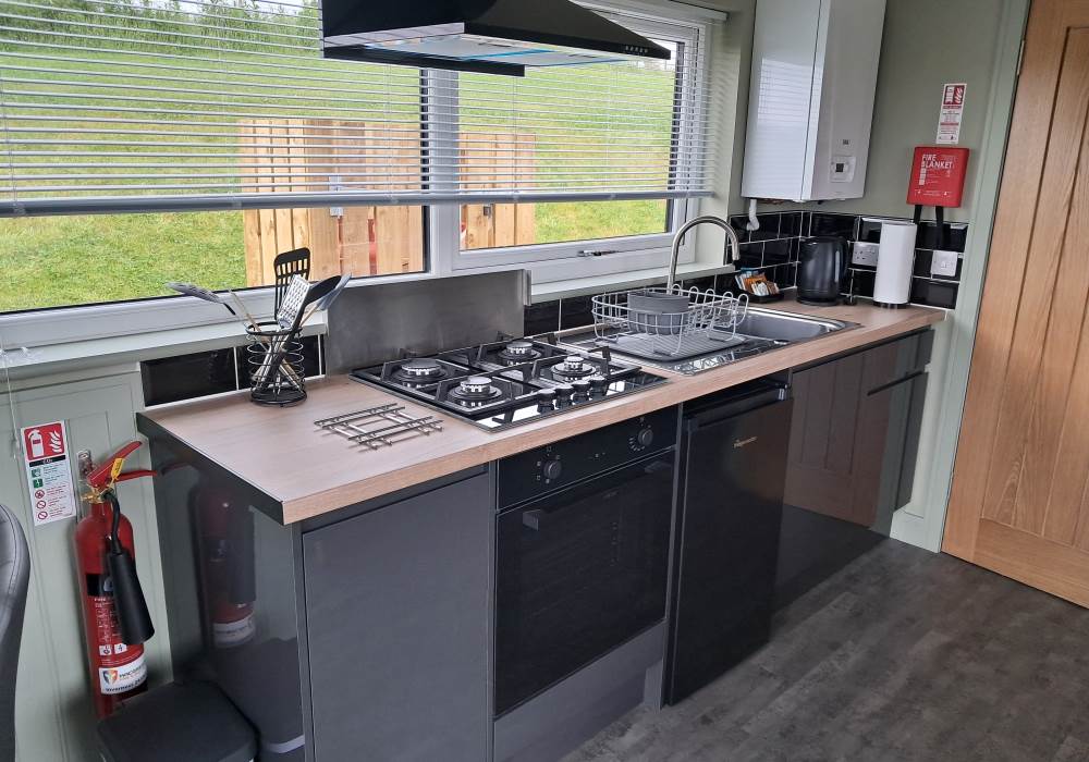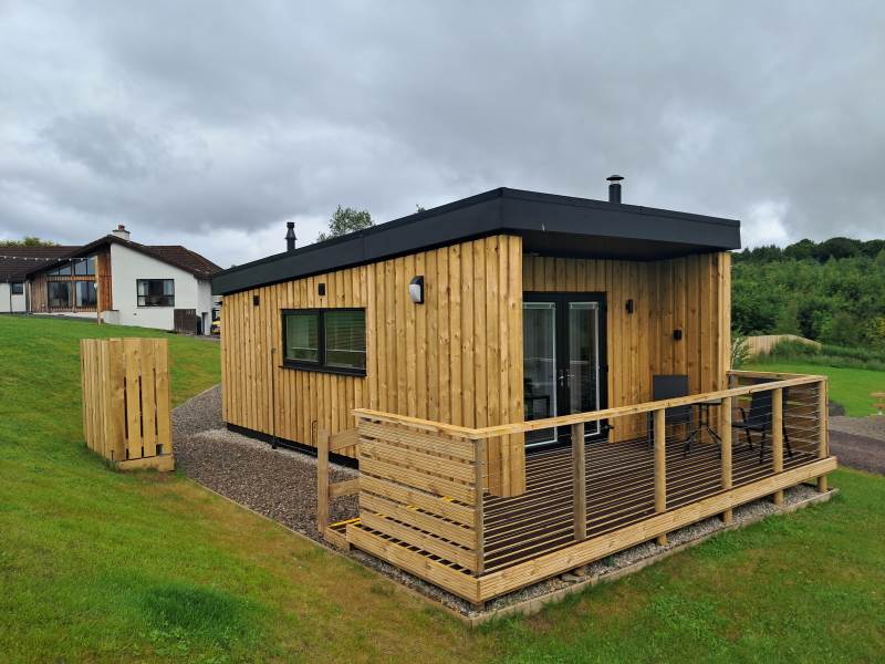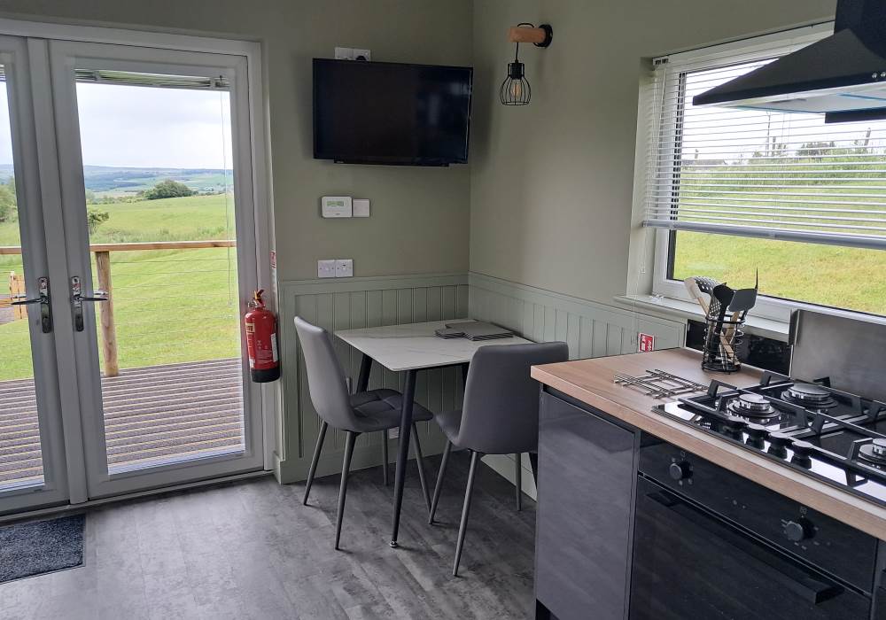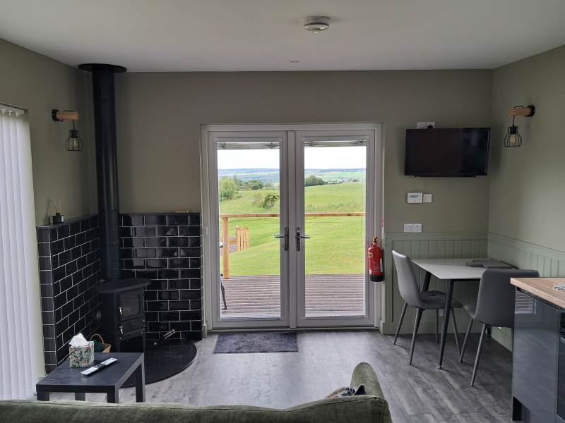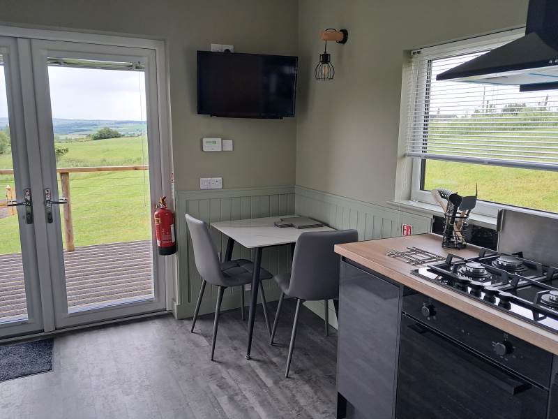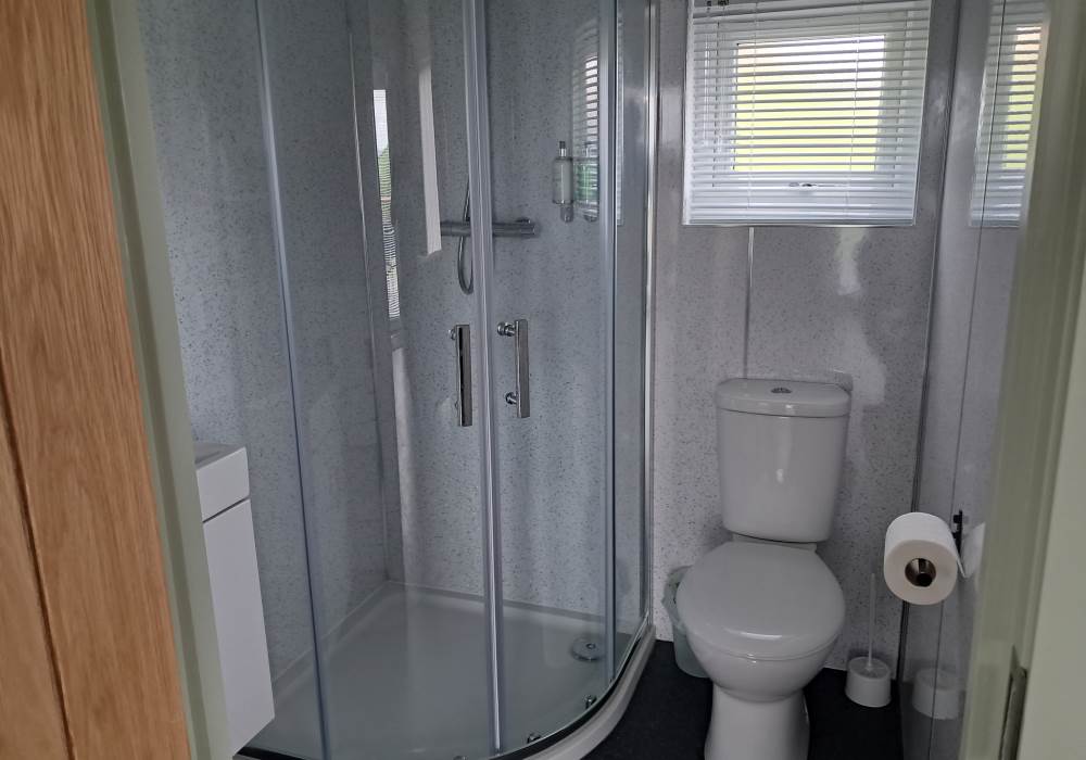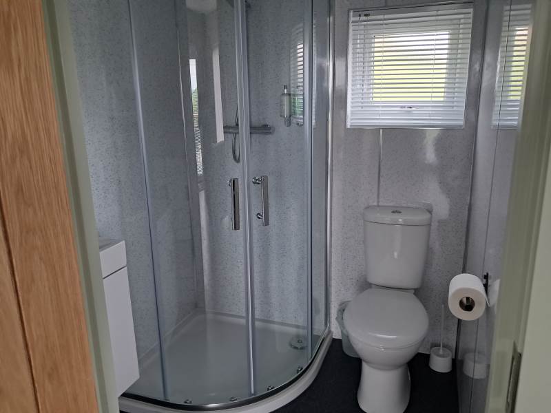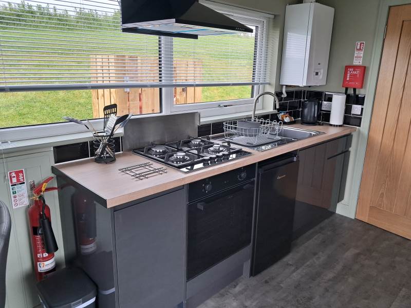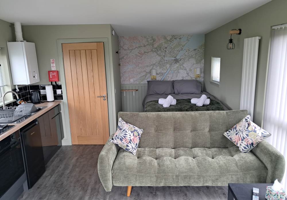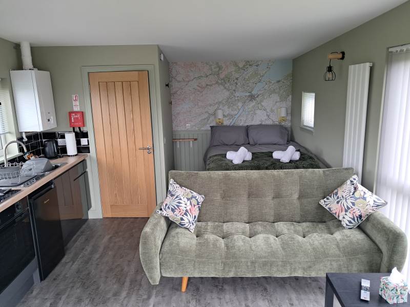 Open plan cabin accommodation with shower and toilet facilities and full kitchen king size bed and fold down double sofa bed