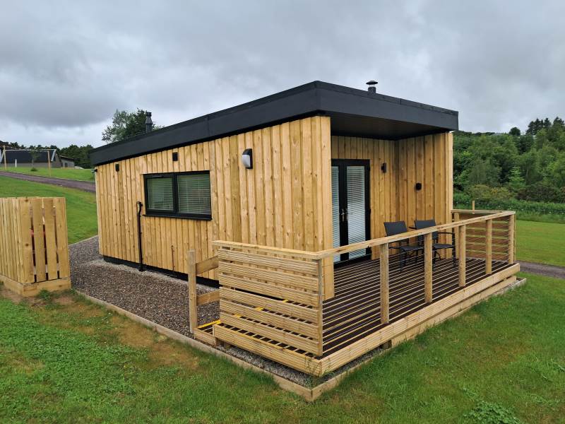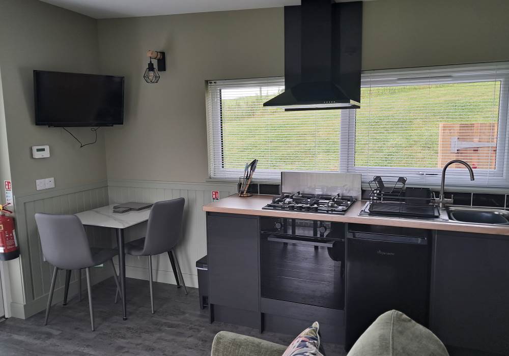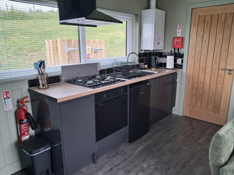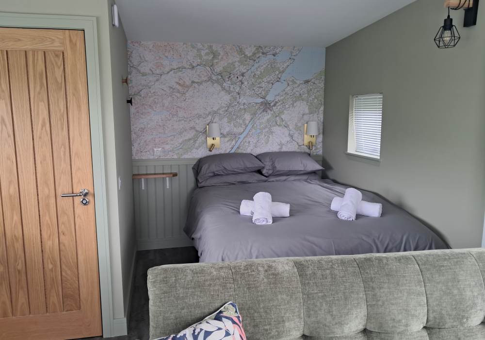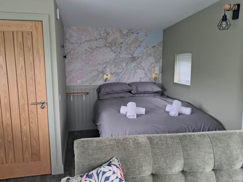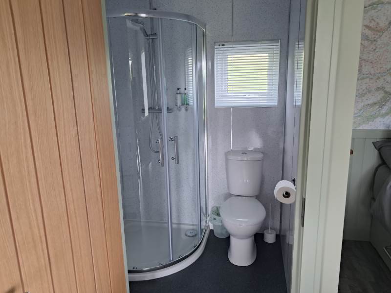 Open plan cabin accommodation with shower and toilet facilities and full kitchen king size bed and fold down double sofa bed