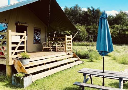 The four acre meadow field in which the luxury safari tents are located is a great space for children to enjoy. With a natural play area to explore, including a willow den and tunnel and fallen logs to climb on. You will also have access to Pondwood a private pond and wood just a short walk from the tents which are a great place to spot a bit of wildlife and to get creative with your den building skills.