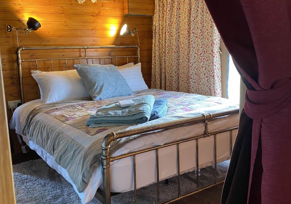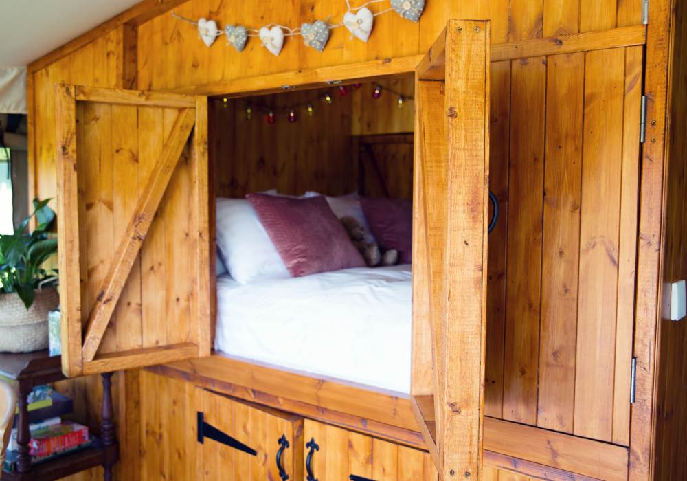 Adjacent to the kitchen area, tucked away, is a snug double cabin bed. Adorned with fairy lights it is a magical hideaway, a place for story telling and cosy cuddles.