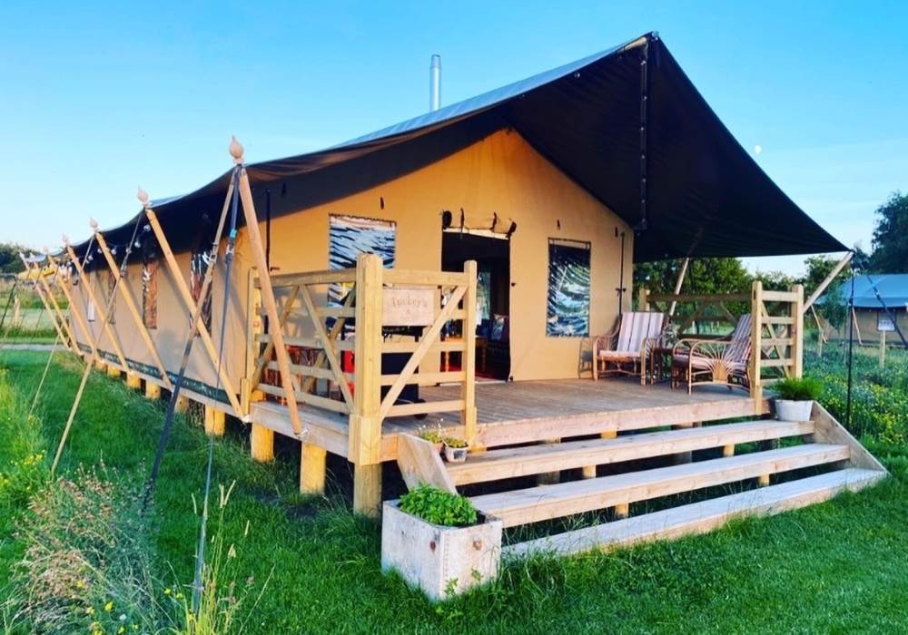 Following the path through the tall grasses and flowers that, during the summer months, grow wild in the meadow field, you will come to the first of our two luxury safari tents.