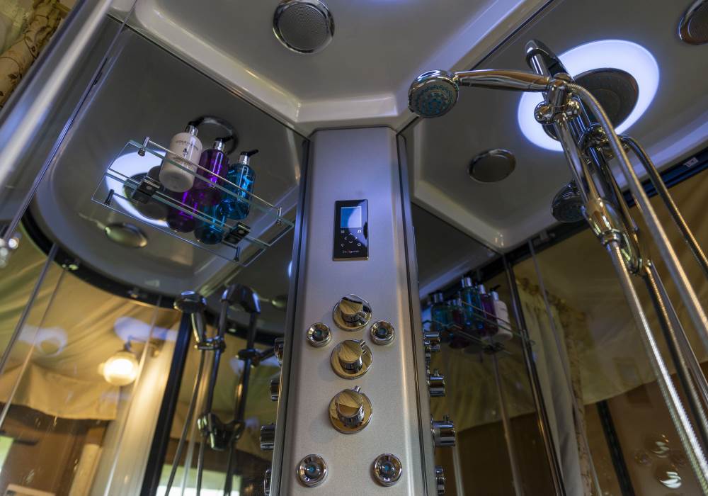 The bathroom is fitted with a luxurious shower pod boasting bluetooth technology, ambient lighting and a choice of shower settings from a monsoon deluge to massaging shower jets. Time here need not be a routine but more of an experience.