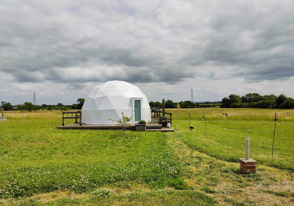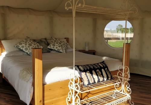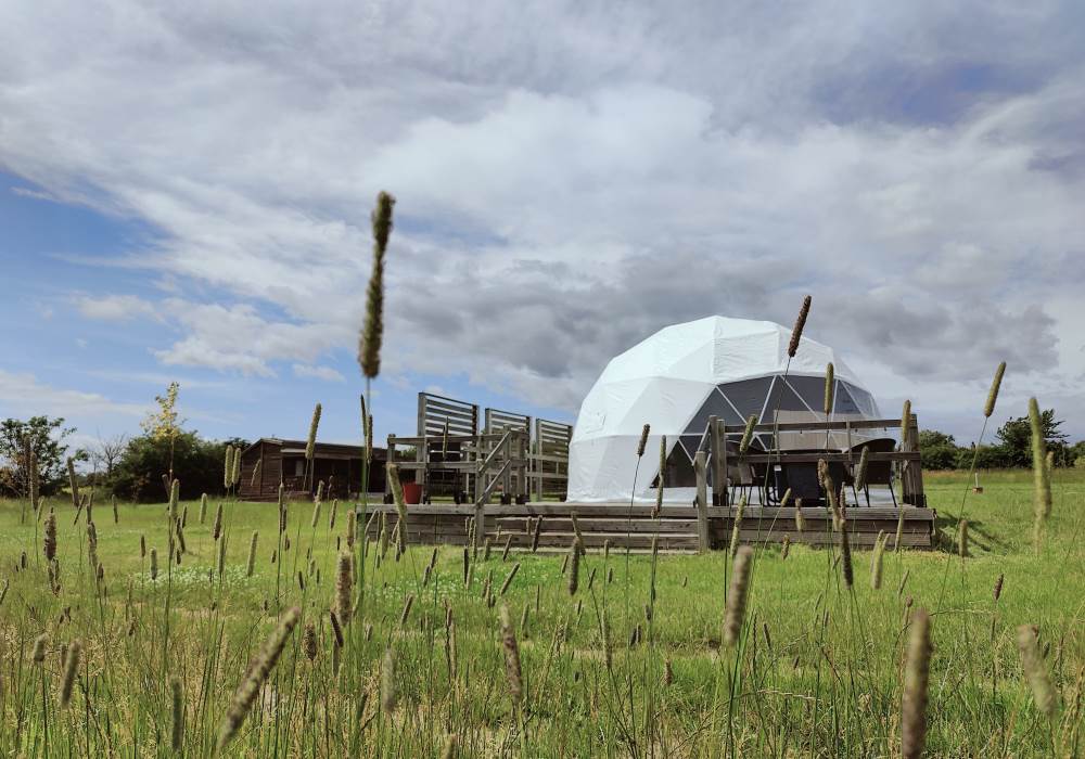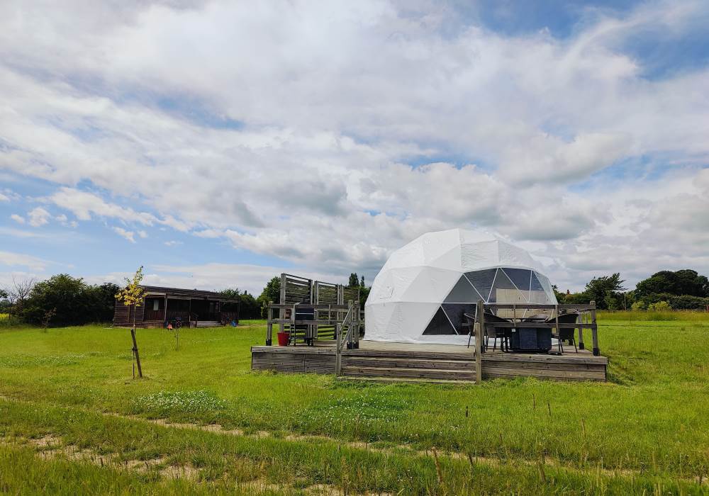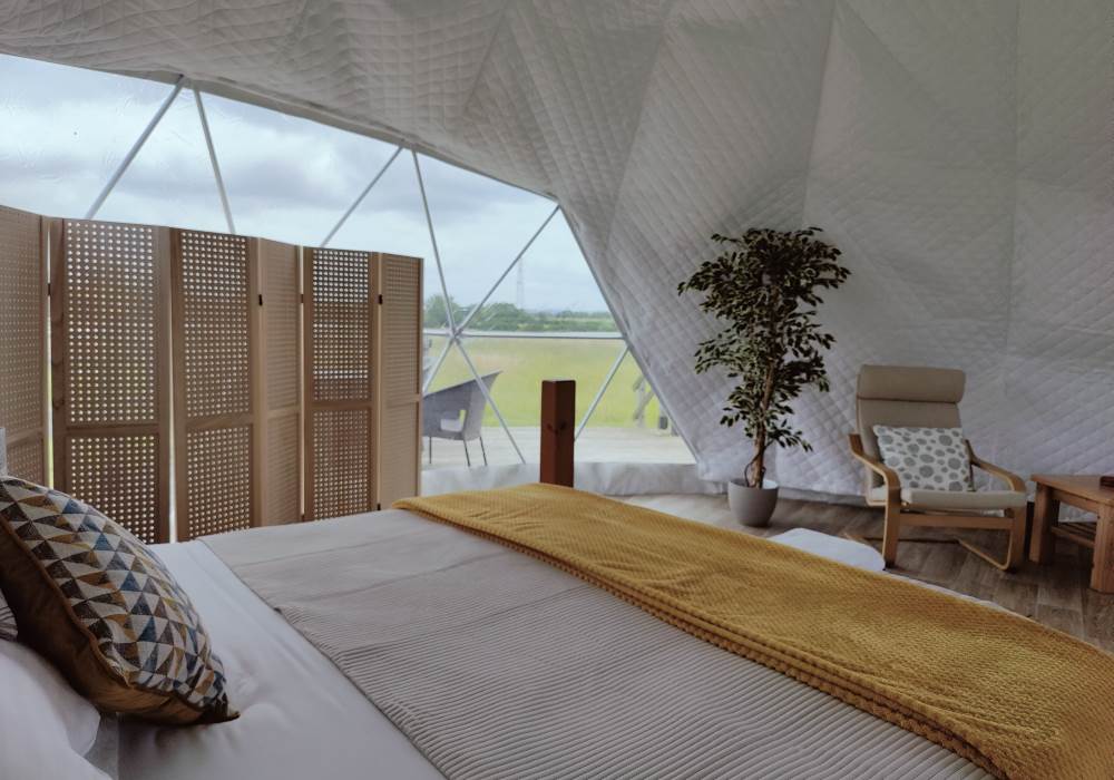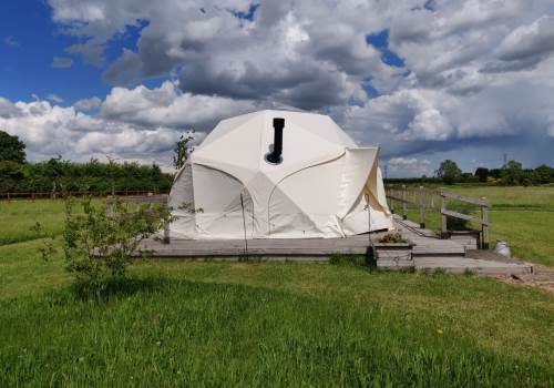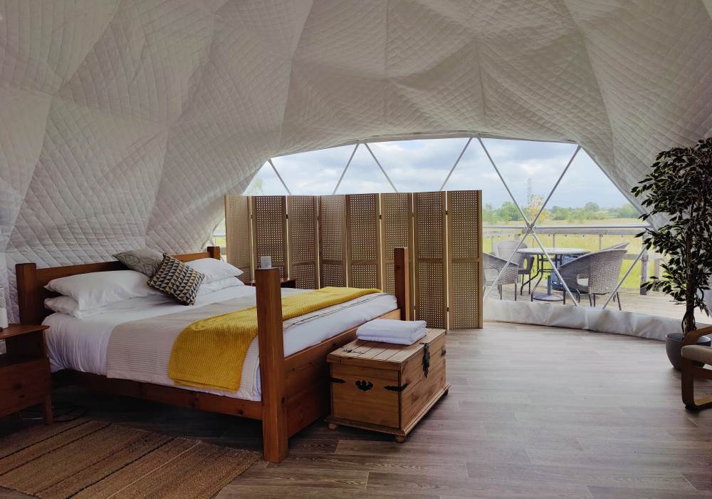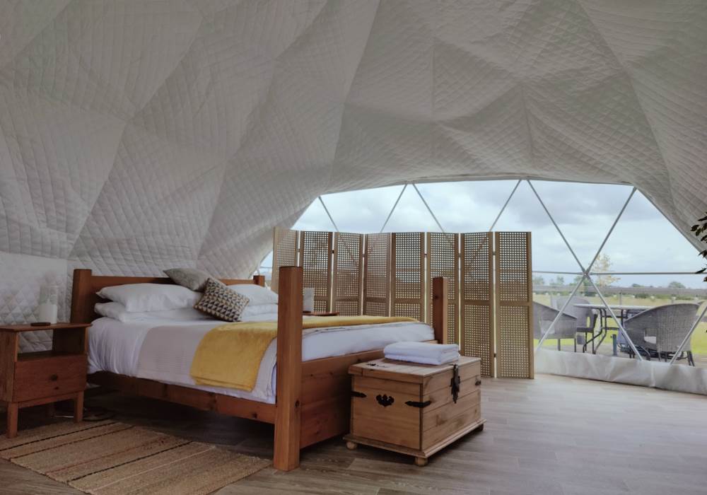 This is our newest Dome with a diameter of 6 metres. It has a super king sized, chunky, wooden, Suitable for a couple, spacious enough for a travel cot for new parents. Includes a private deck and barbeque area.