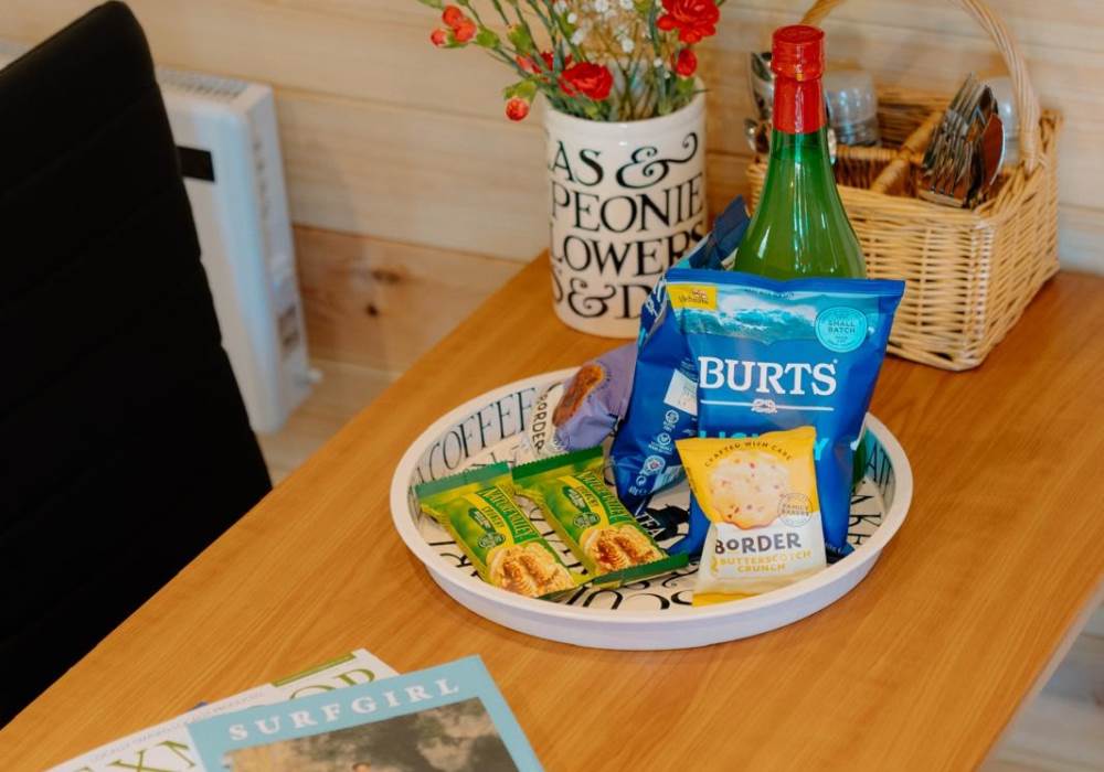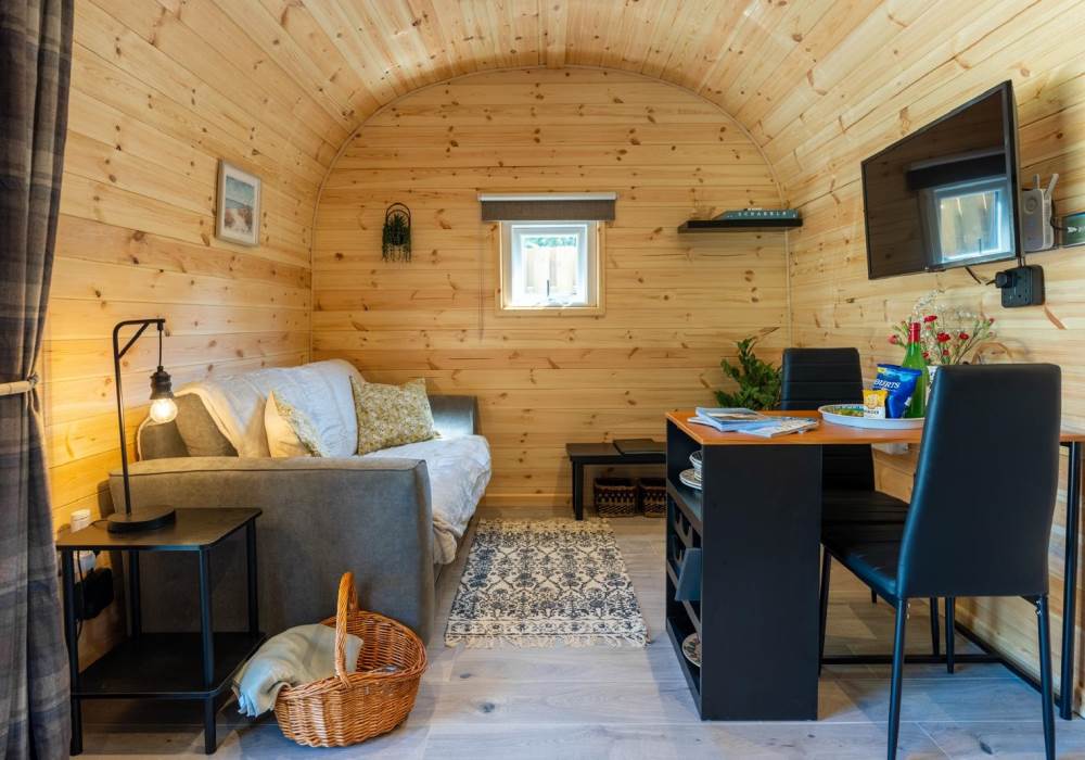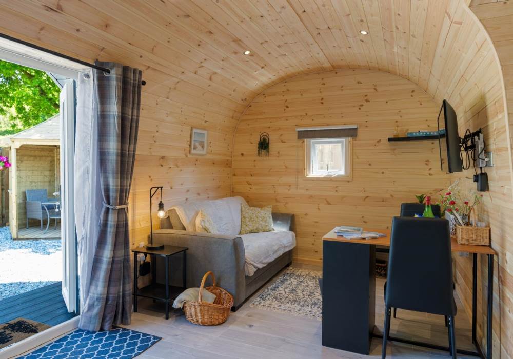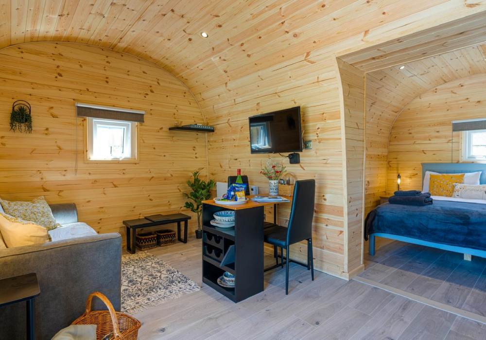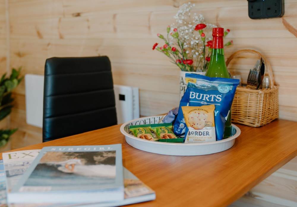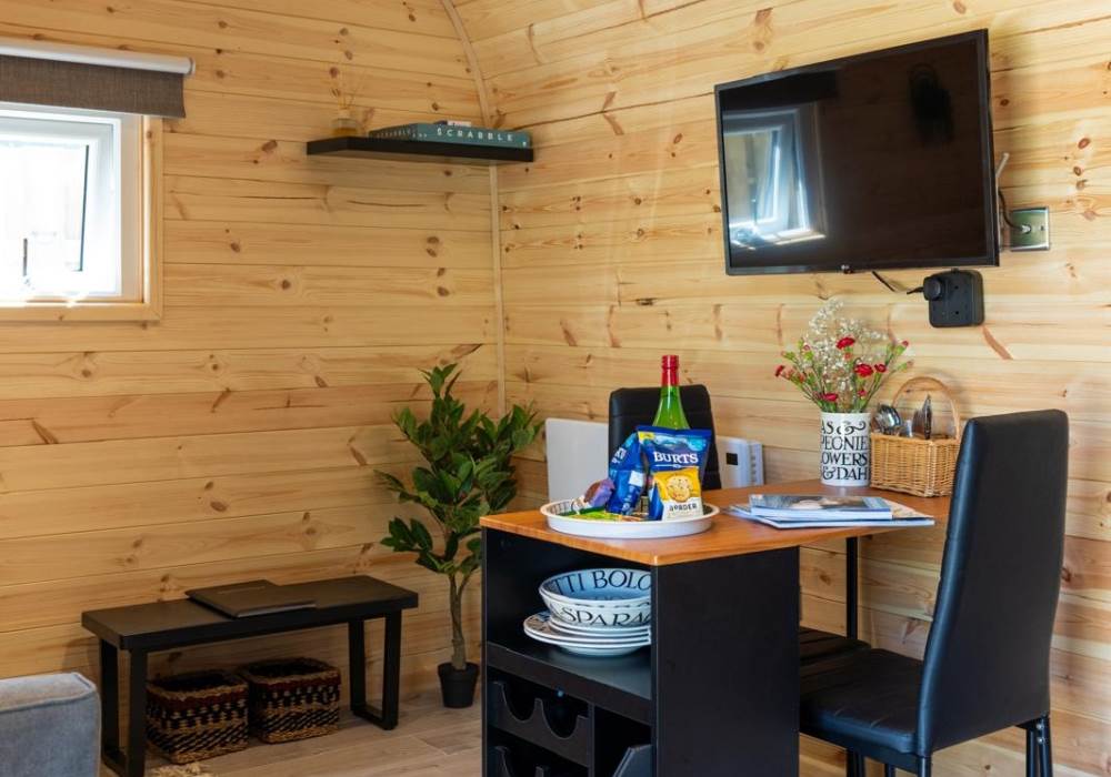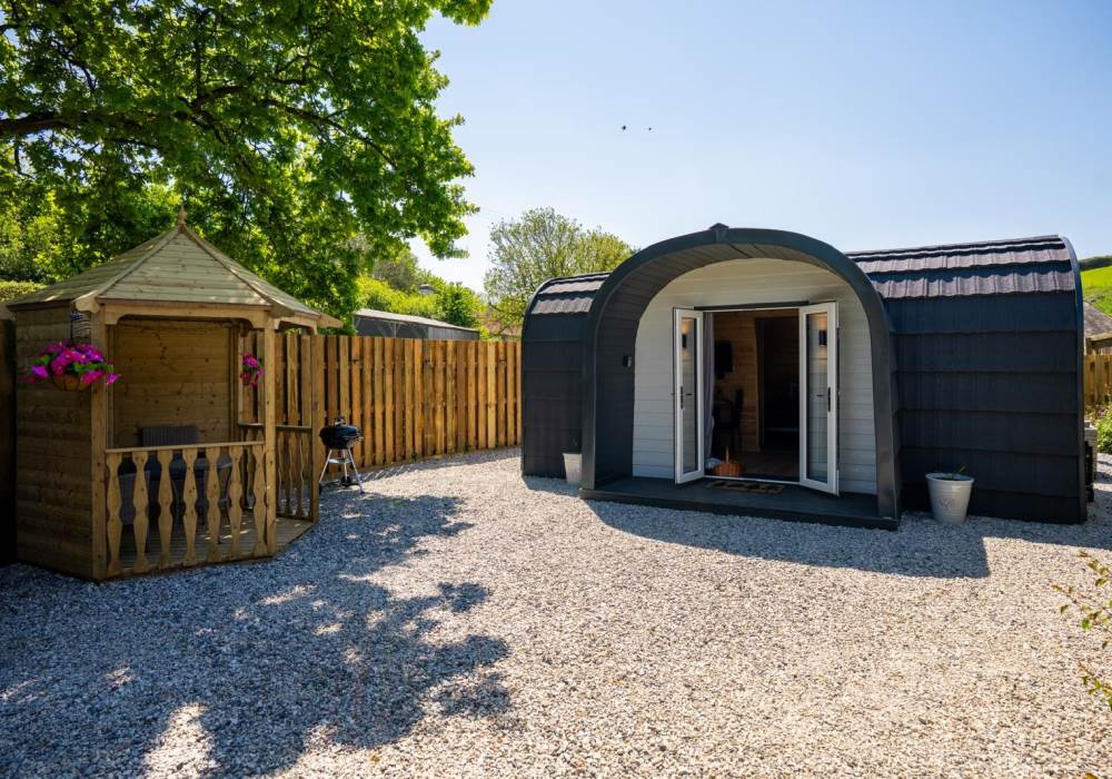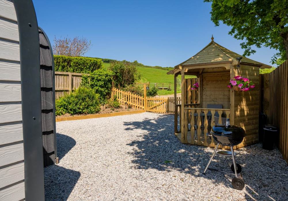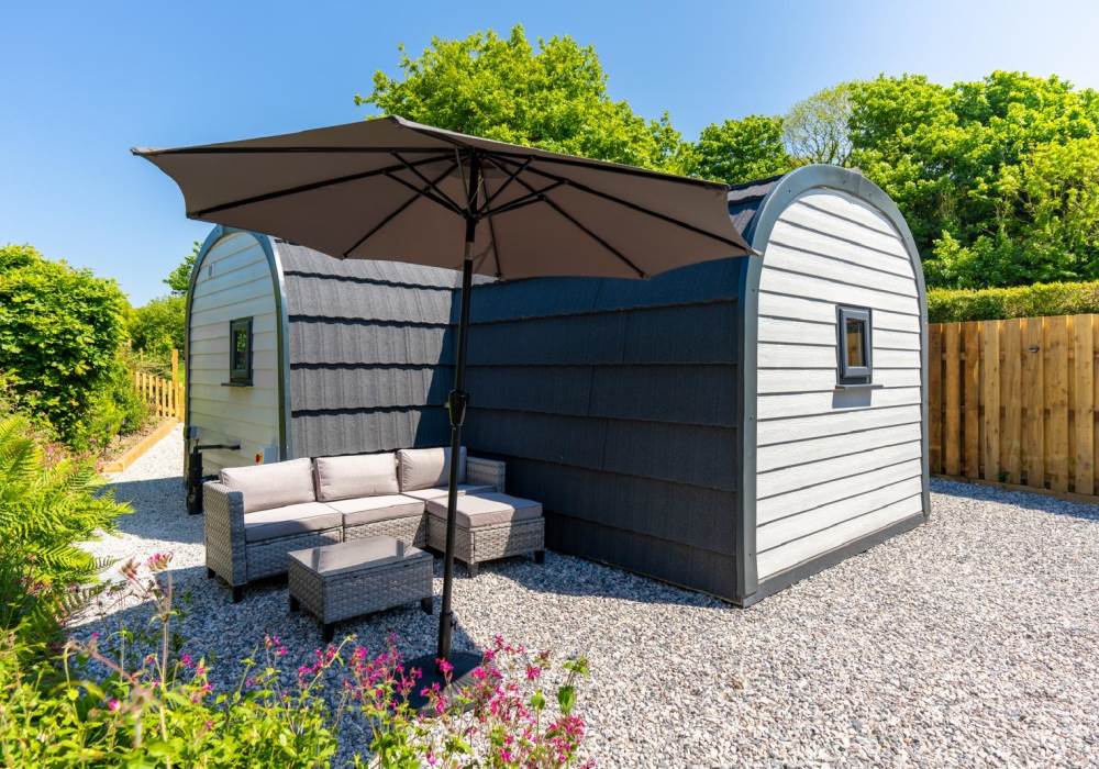 Step out into your garden and sit in your private gazebo, where a table and chairs await you for indoor/outdoor dining. Fire up the charcoal BBQ (bring your own charcoal) or sink into the outdoor sofa with a few drinks. At the back of the pod you will find the wood-fired hot tub. The hot tub is accompanied by an all-important glass and bottle holder, allowing you to relax with a few drinks while gazing at the stars after a busy day exploring the local area or having a go at surfing at one of the many local beaches.