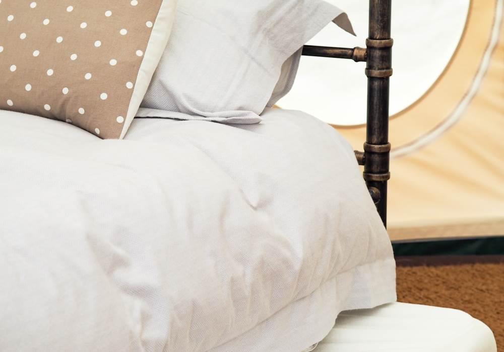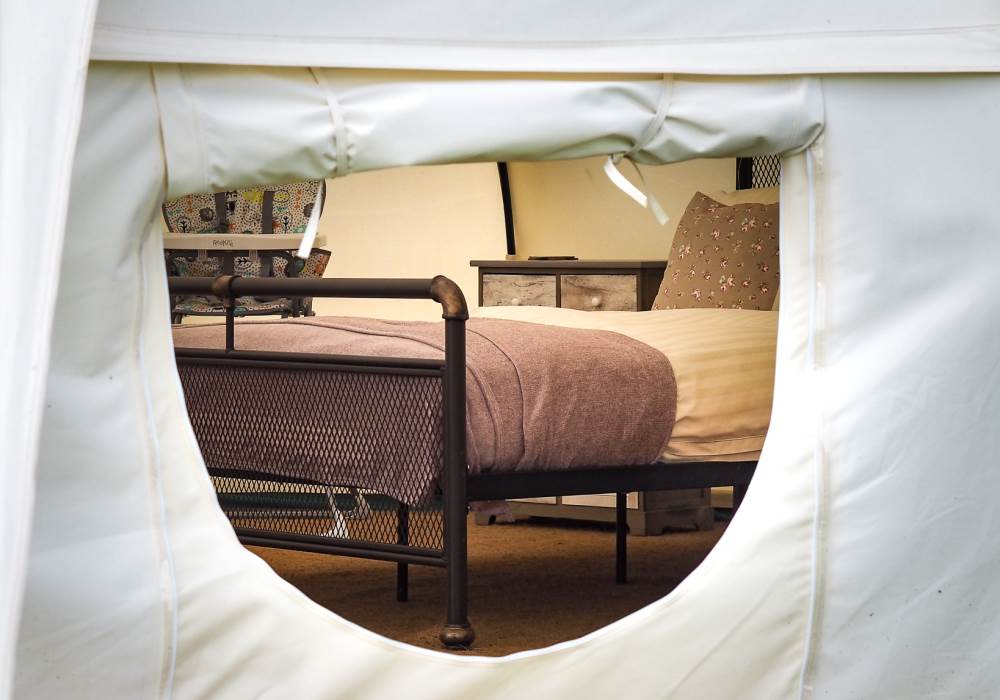 Our Lotus Bell Tents measure 6m round and are open from the beginning of April to the end of September and can sleep up to 4 people with a king bed and trundle bed (two singles) which can also be a sofa. Each tent has been individually designed with a shabby chic, vintage look but with everything you need for a comfortable and cosy night’s stay, with luxury beds and linen, light, bedside table, coffee table. There is also a kettle and crate of basic cooking and dining ware, dishcloth and tea towels, washing up liquid, anti-bacterial spray. If we’ve forgotten anything, please let us know. The lotus bell tents have two plug sockets, with a 16 amp electric supply. We provide a mini fridge and cool box/ice-packs.